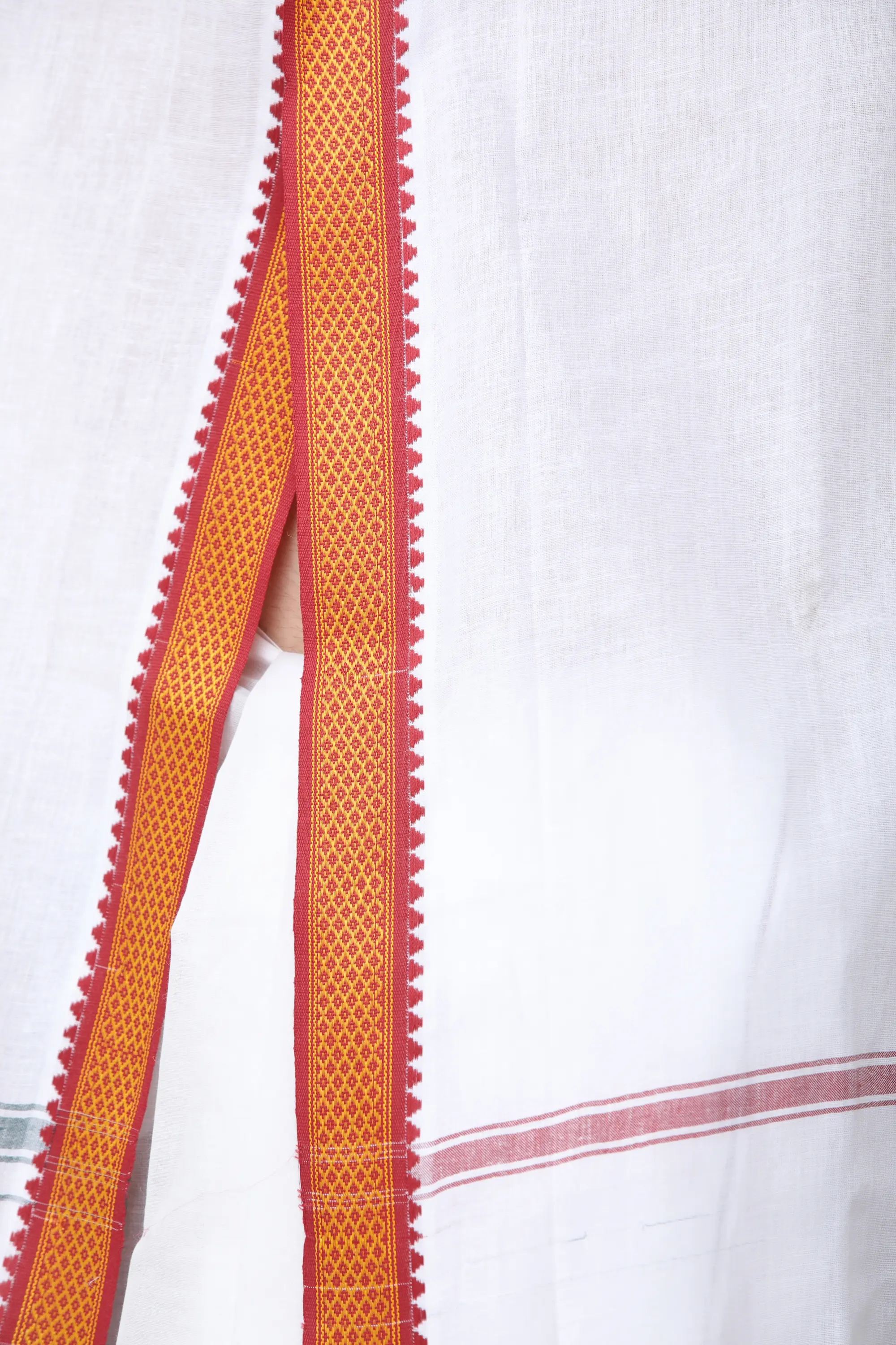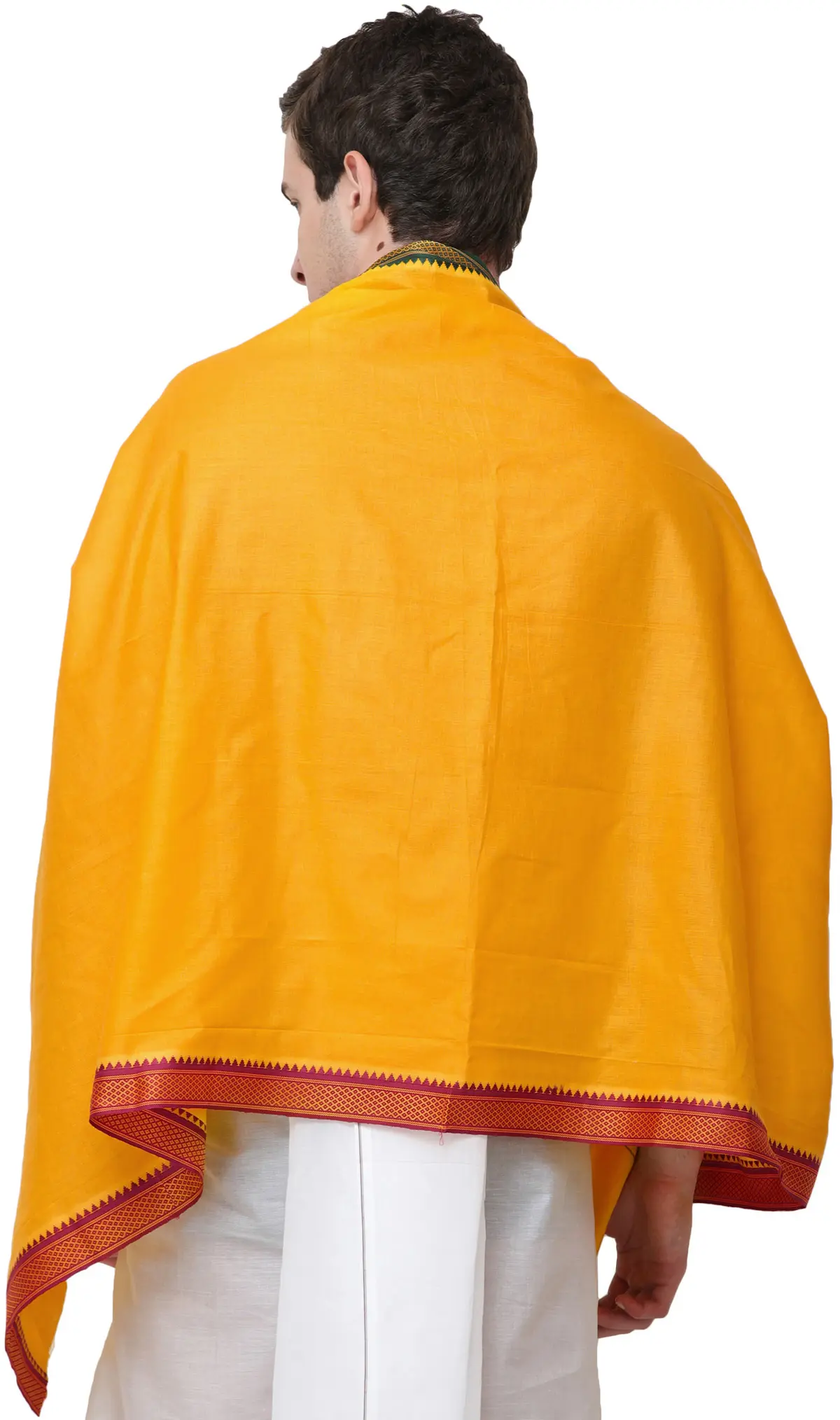 This pure cotton Angavastram in cream is the essence of simple but exquisite elegance. This cotton Uttari features a vibrant Ganga Jamuna border in orange and green. The bright-cream color exudes purity and refinement, while the beautifully woven border adds regal flair. The material is of the greatest grade. Carrying it on the shoulders or wrapping it around the body, the delicate and soft fabric is really useful in both circumstances. The overall appearance of the clothing is incredibly exquisite, making it a wonderful choice for traditional situations.