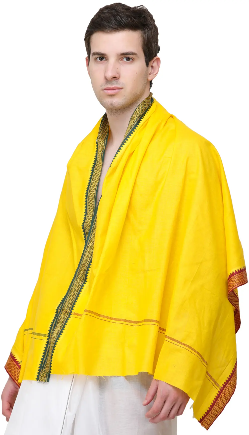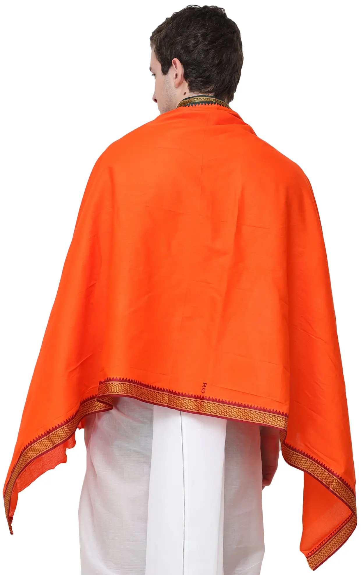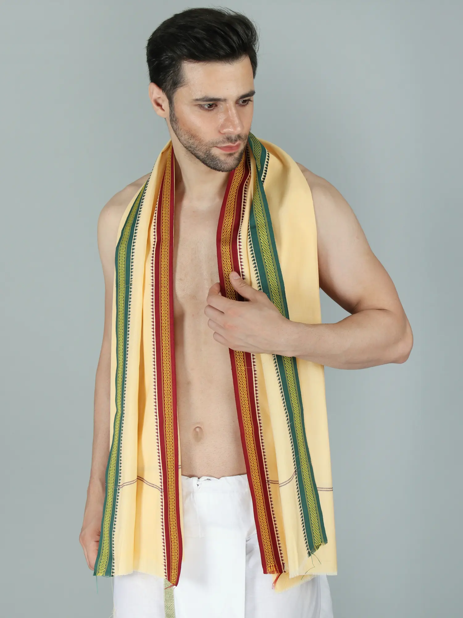 This pure cotton Angavastram in cream is the essence of simple but exquisite elegance. This cotton Uttari features a vibrant Ganga Jamuna border in orange and green. The bright-cream color exudes purity and refinement, while the beautifully woven border adds regal flair. The material is of the greatest grade. Carrying it on the shoulders or wrapping it around the body, the delicate and soft fabric is really useful in both circumstances. The overall appearance of the clothing is incredibly exquisite, making it a wonderful choice for traditional situations.
