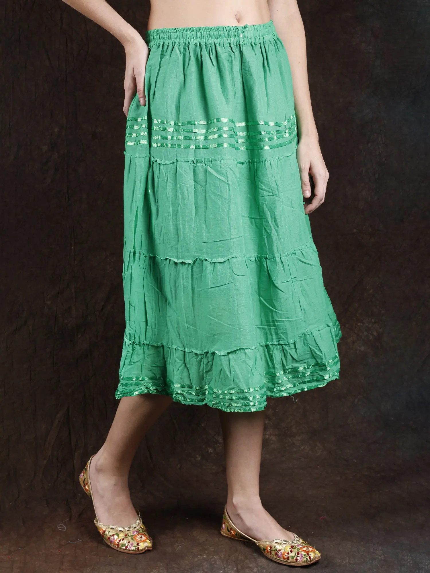A plain cotton skirt is all you need to create classic looks that no one can forget. This elastic midi skirt, crafted with comfy cotton is decorated with a minimal lace element on the length, that matches the color of the fabric while adding a layer of beauty to the look.