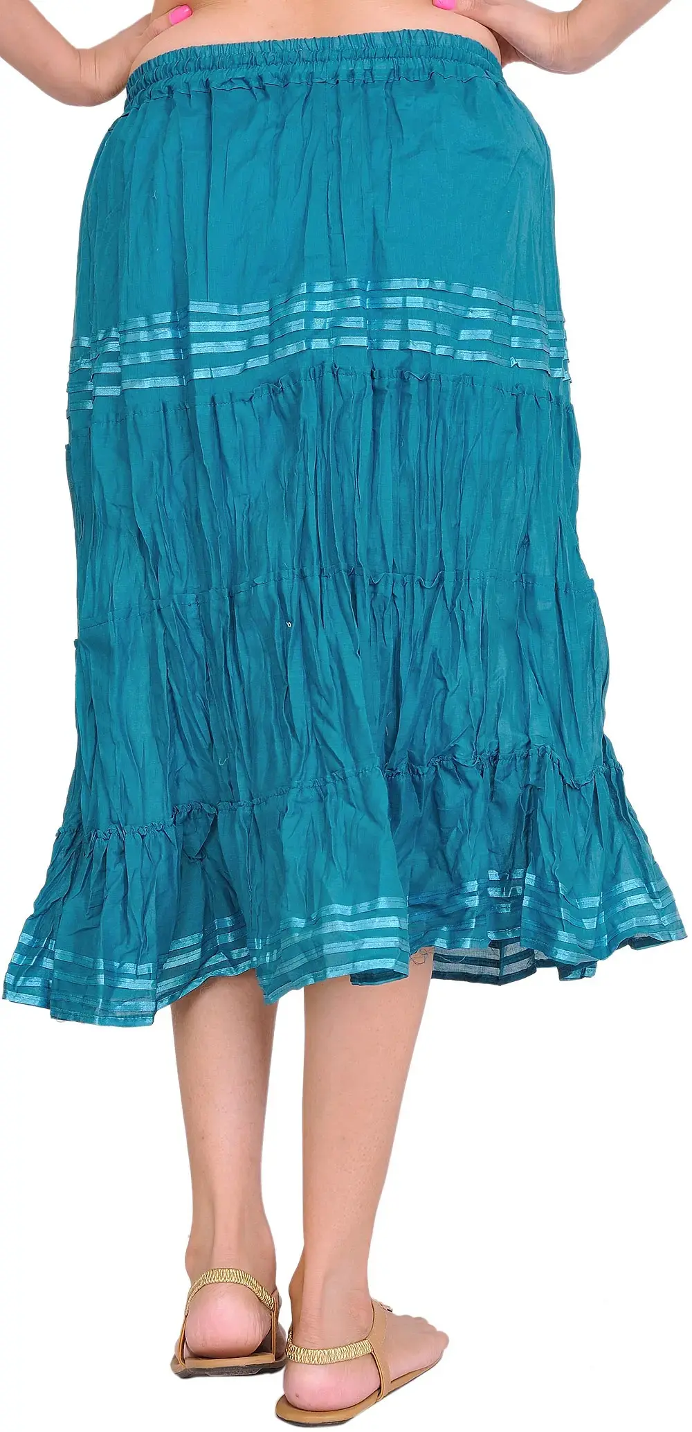 The beauty of this skirt lies in its thoughtful, understated details. It features a series of tiered ruffles that add a touch of playful volume and movement. Each tier is finished with delicate, satin ribbon detailing that catches the light and adds a hint of refined texture. This subtle embellishment elevates the simple silhouette, giving it a touch of artisanal charm. The elastic waistband ensures a flexible and comfortable fit, adapting to your body for ease of wear. A simple drawstring allows for further adjustment, ensuring the perfect fit for you.