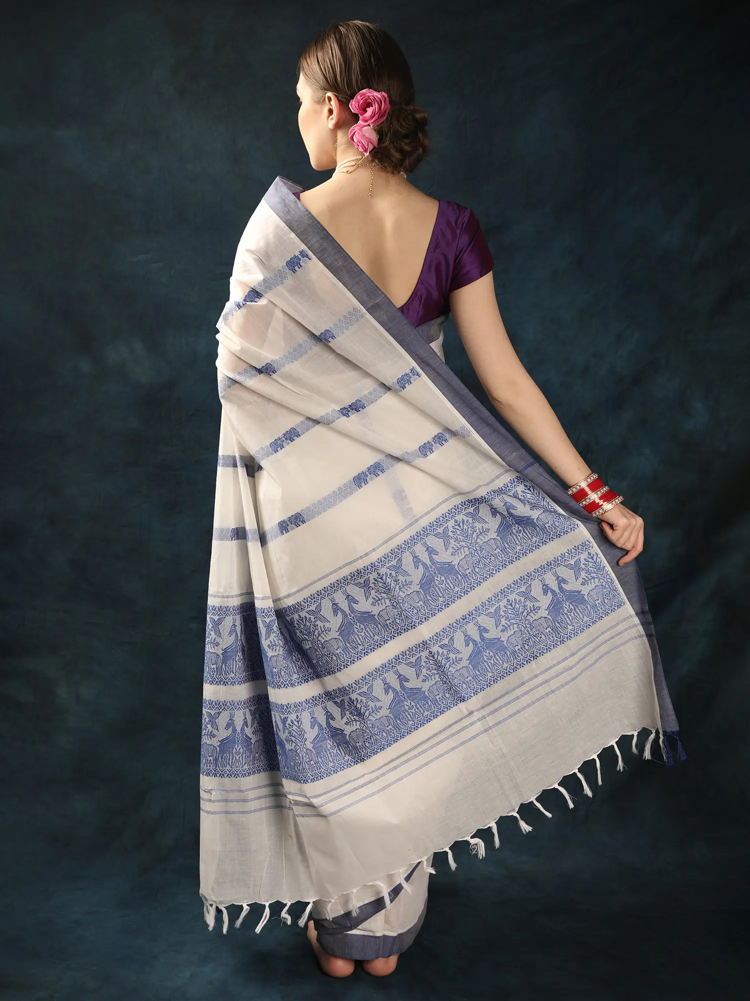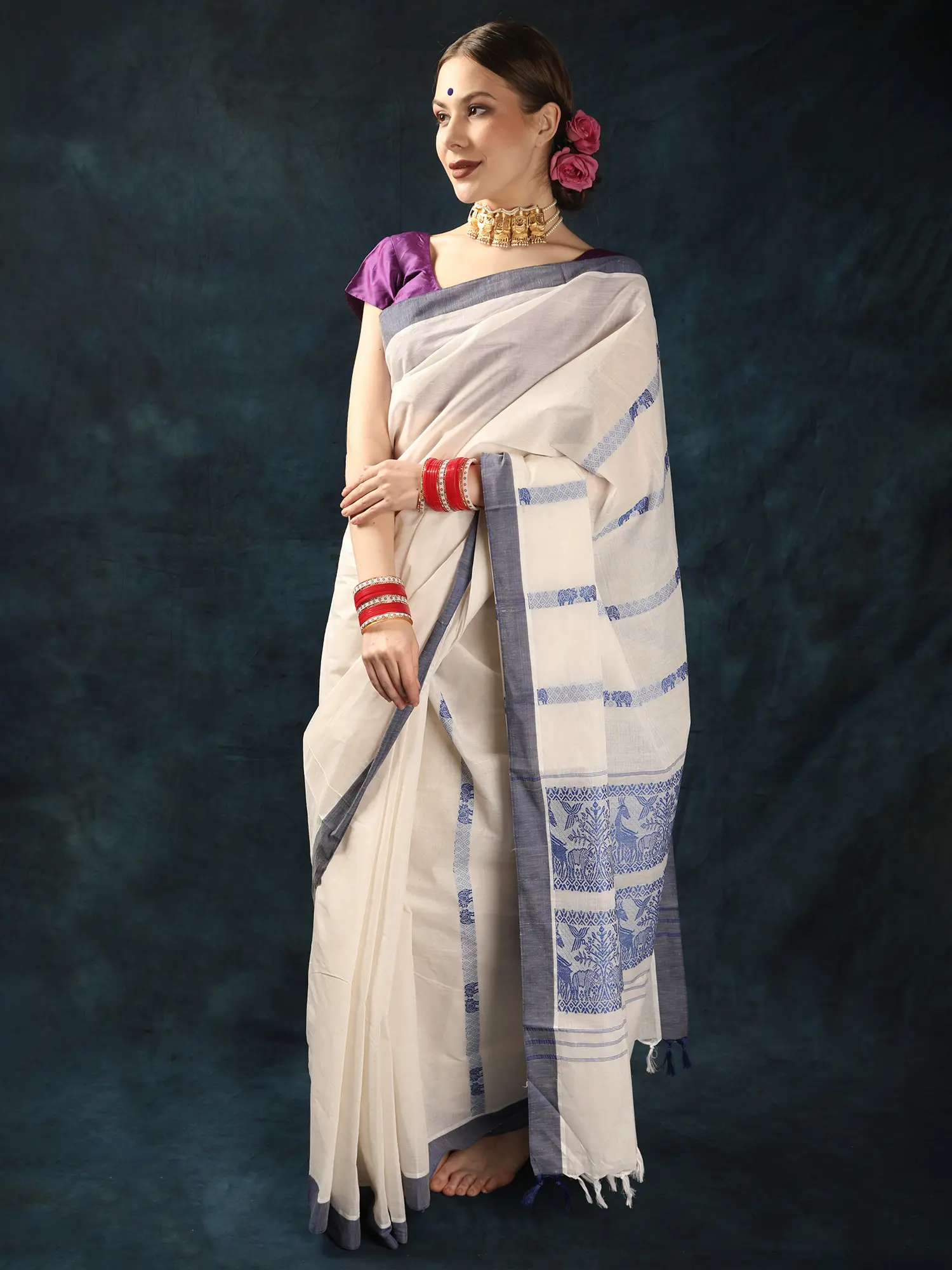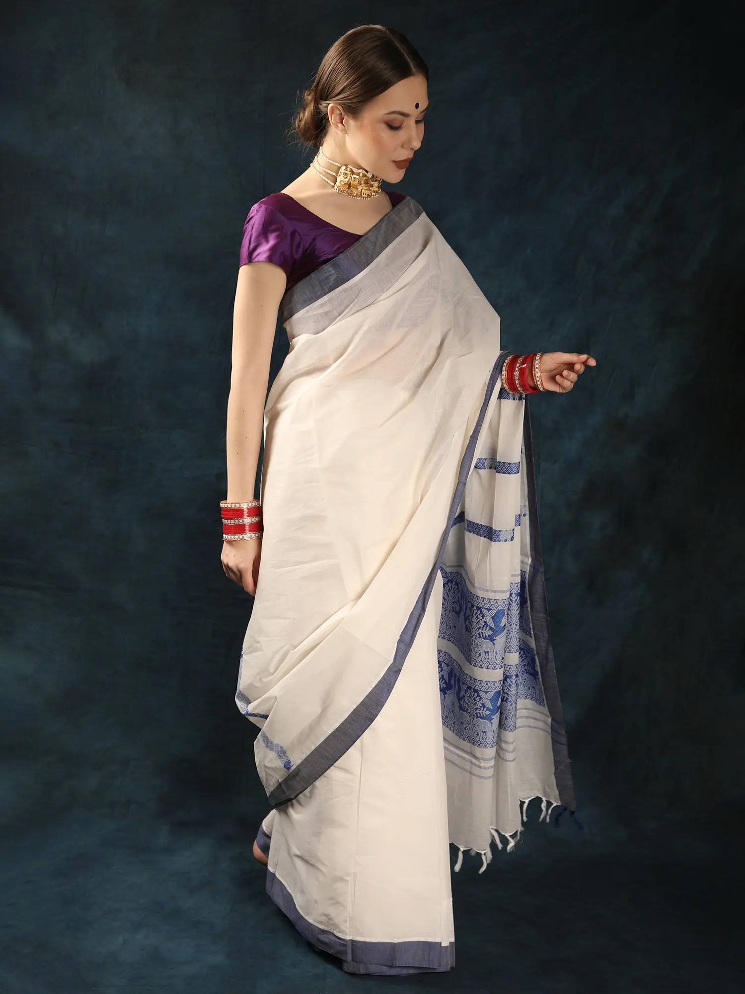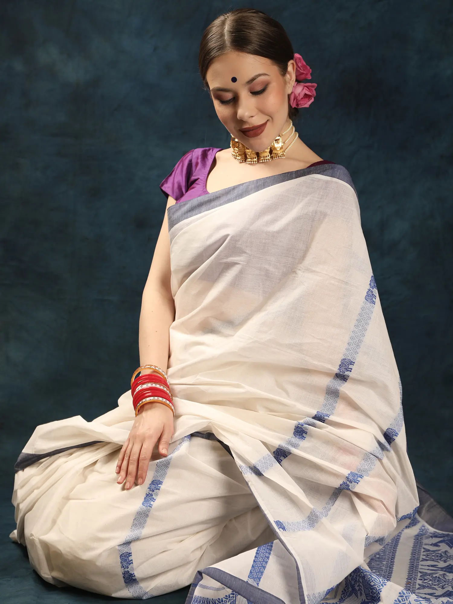This saree embodies a refined elegance that is both understated and impactful. Its classic ivory hue makes it a versatile addition to any wardrobe, perfect for a myriad of occasions, from festive gatherings to elegant everyday wear. The subtle contrast of the blue borders and the detailed anchal add a touch of sophisticated charm. The saree offers a beautiful drape, allowing you to style it in numerous traditional and contemporary ways. The unstitched blouse piece accompanying the saree provides the opportunity for a custom fit, ensuring it perfectly complements your personal style. This is a garment designed to be cherished, a timeless piece that speaks of tradition, artistry, and a deep connection to the natural world.