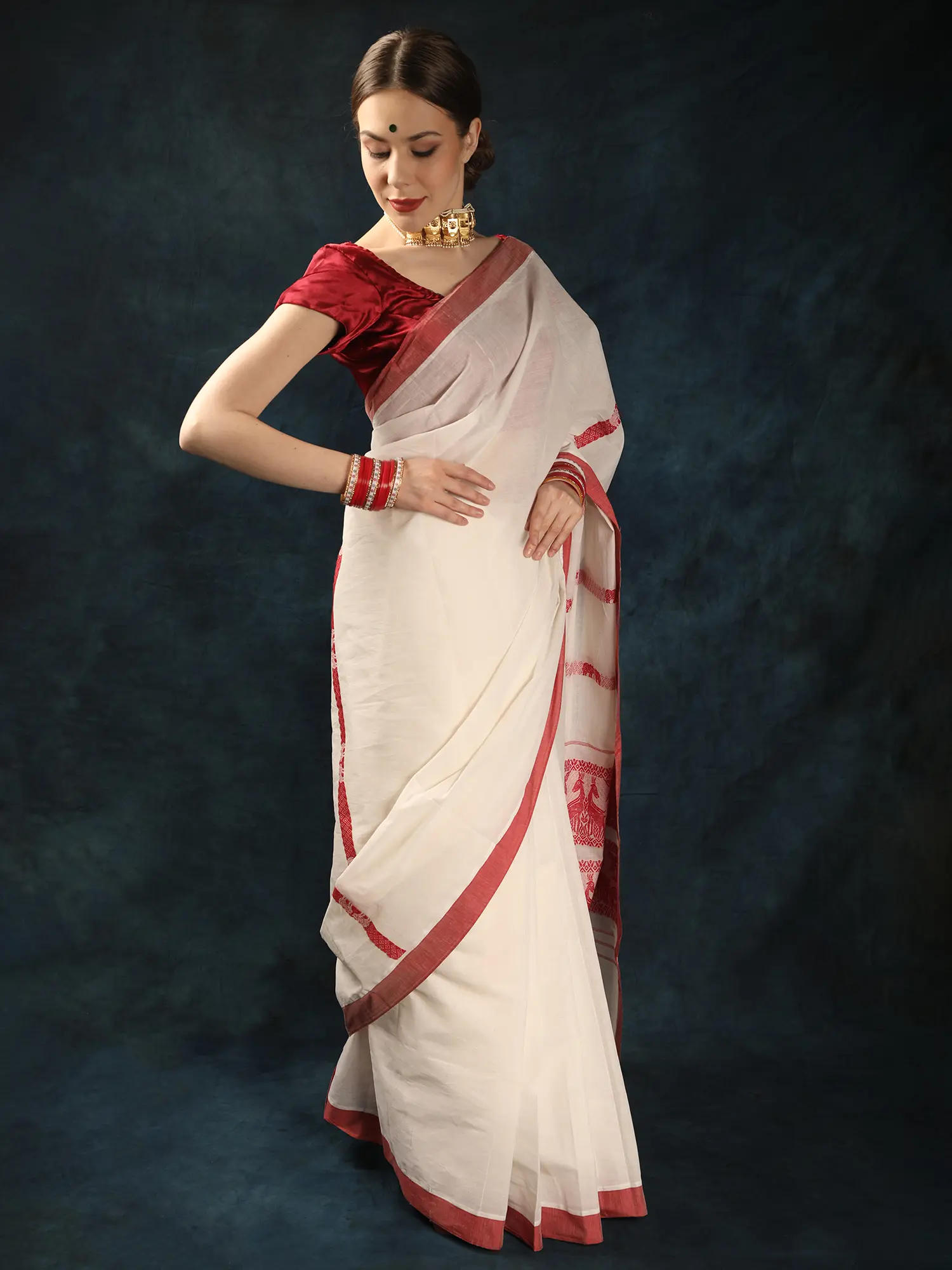 With this stunning Assamese handloom saree, you may immerse yourself in the fantasy realm of the region. It is a finely woven piece made of pure cotton that captures the essence of Assam's rich legacy. The mesmerising Jungle Scene on its Anchal, which captures the natural splendour of Assam’s rich surroundings, is what distinguishes it.