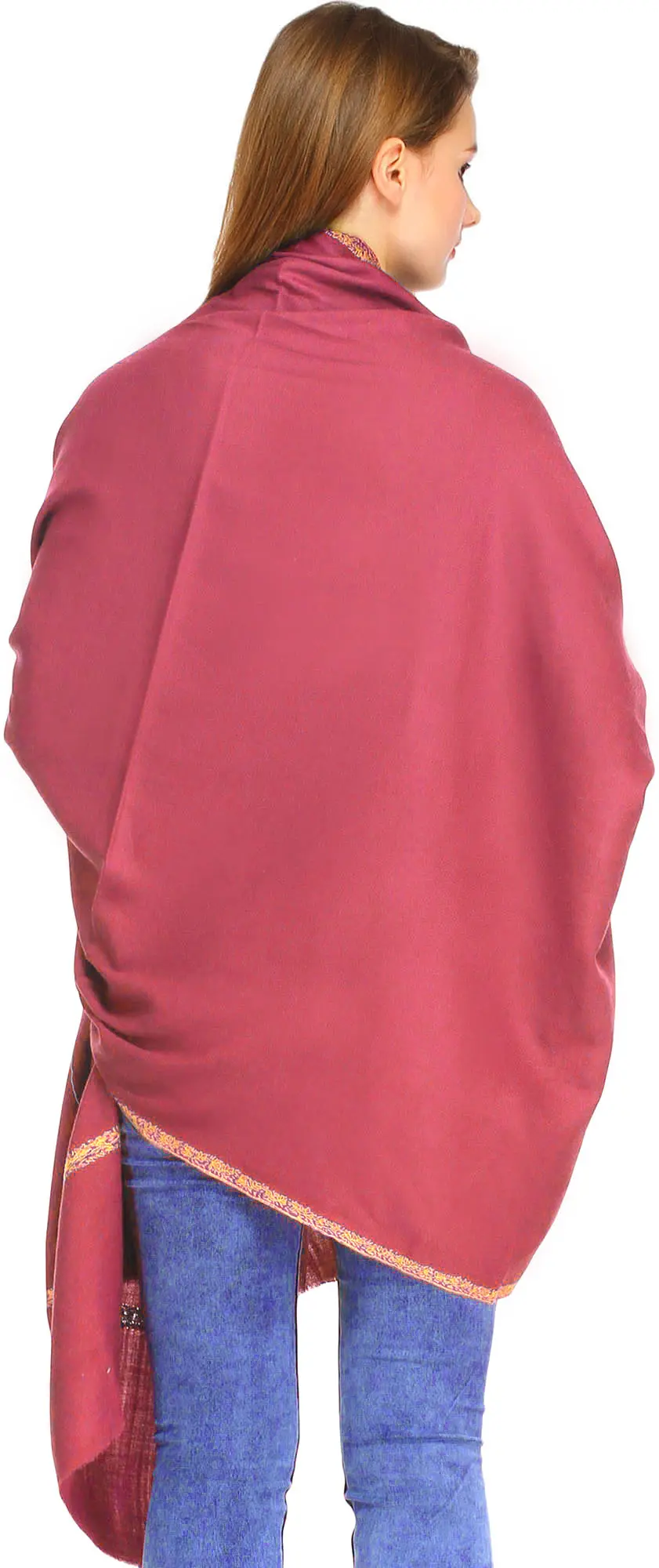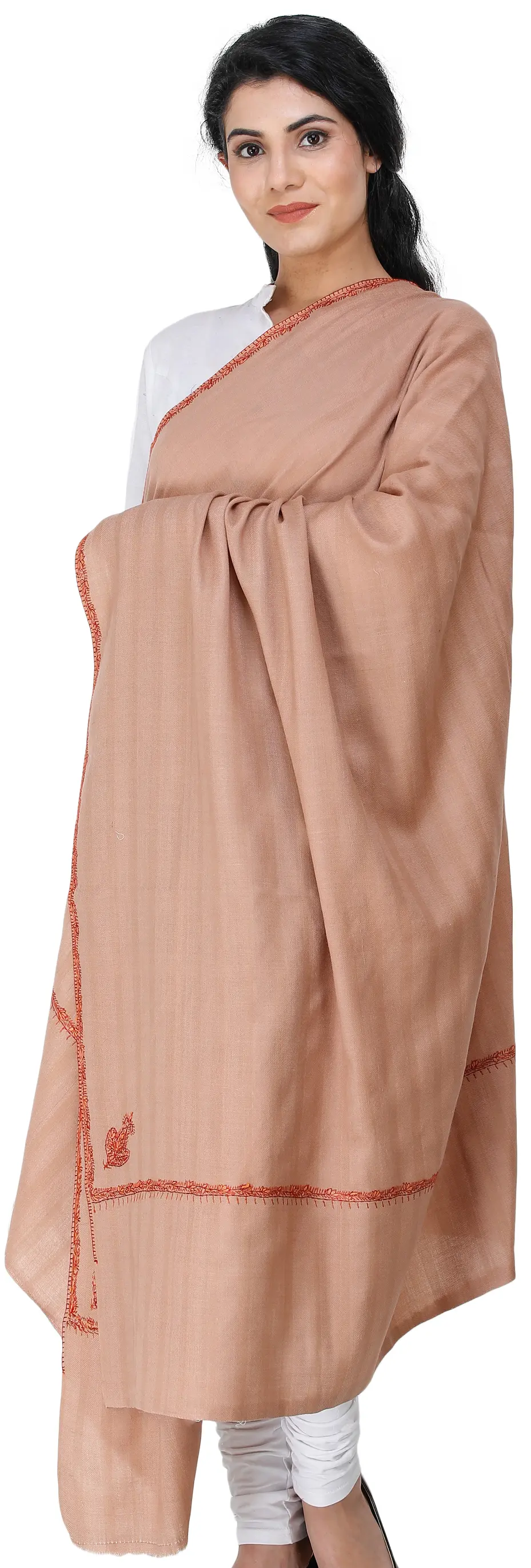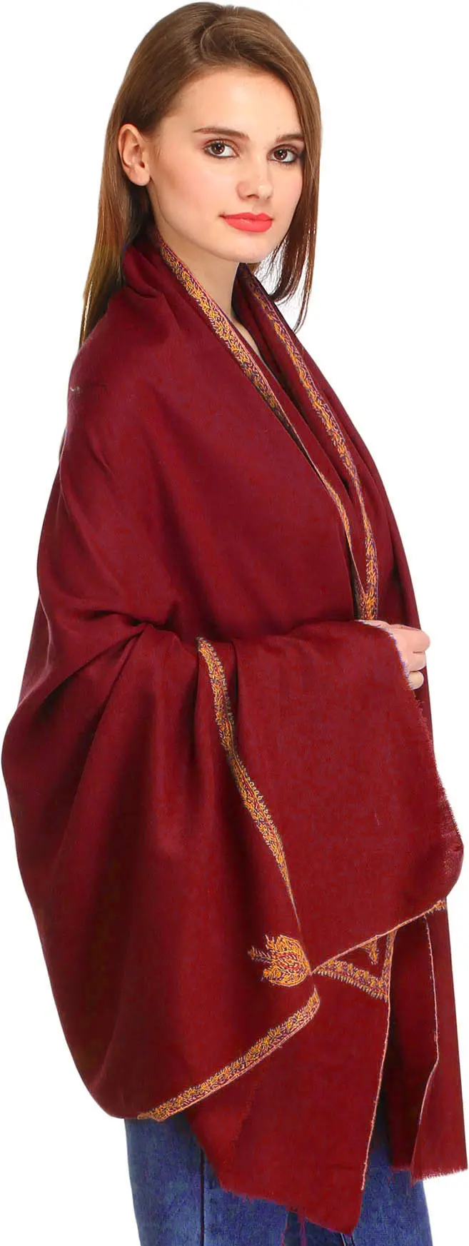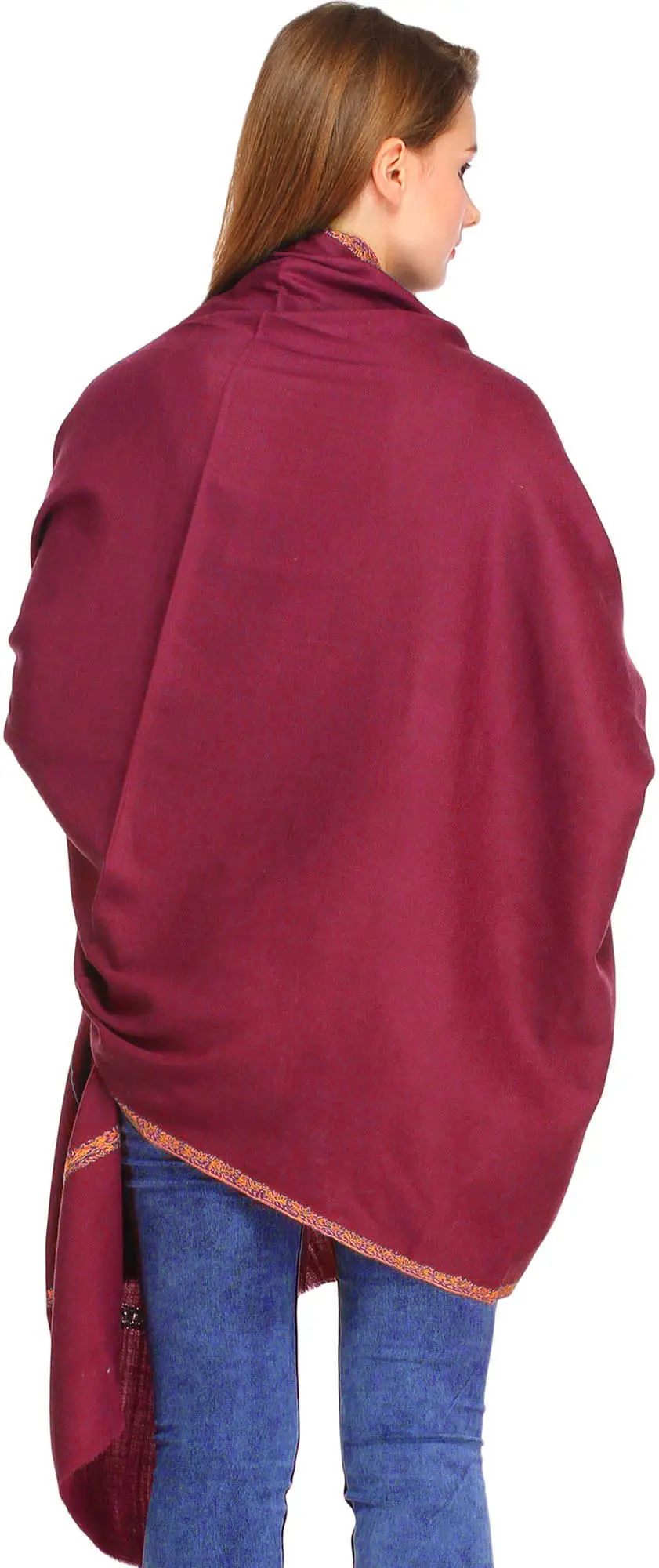 Besides being known for its mind-boggling beauty, Kashmir is very prominently known for its massive textile industry. Year after year, Kashmir has been surpassing every other state who have made India's mark globally through its textile industry. There is no way that you would not be able to distinctively spot Kashmiri shawls since most of them display unique symmetrically aligned motifs and embroidery of ancient art. Once a Kashmiri shawl has been made a part of your existing collection of shawls, you wouldn't be able to gauge the ever-lasting value added to your wardrobe. This alluring piece of accessory which you can see in the picture has been the most sophisticated and graceful Kashmiri Kingri shawl you will ever come across. With the minimal sozni embroidery accompanying the borders of the shawl, you would certainly want to buy this piece of accessory once you have your eyes on it. With the availability of 7 colors, get ready to feel the warmest this winter with our amazing collection of Kashmiri shawls that are made with love and 100% pure wool, to make you feel the warmest in winters.