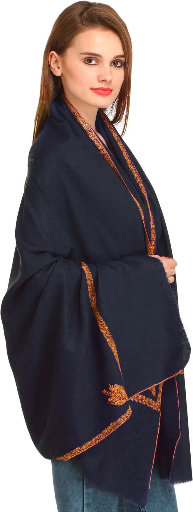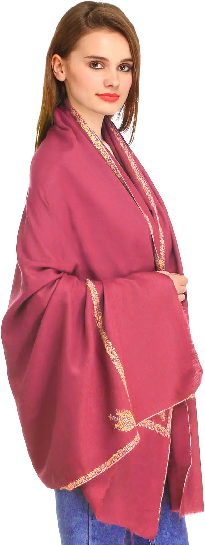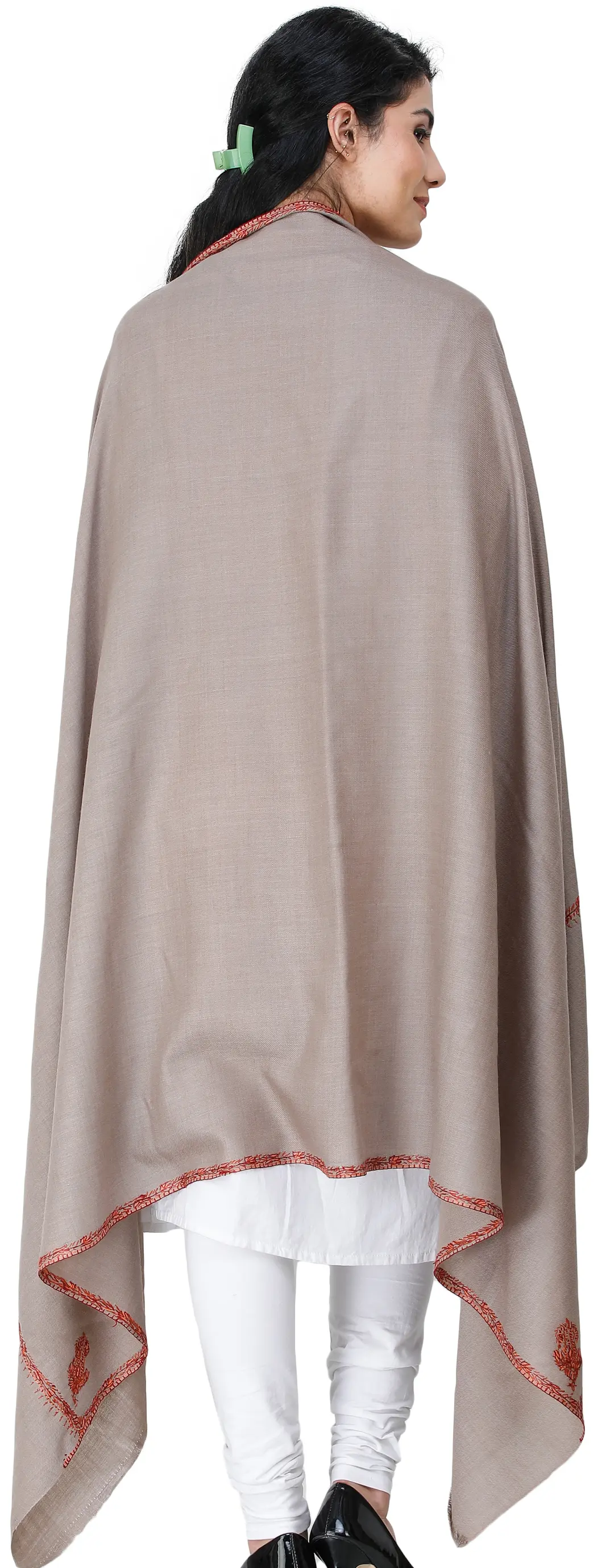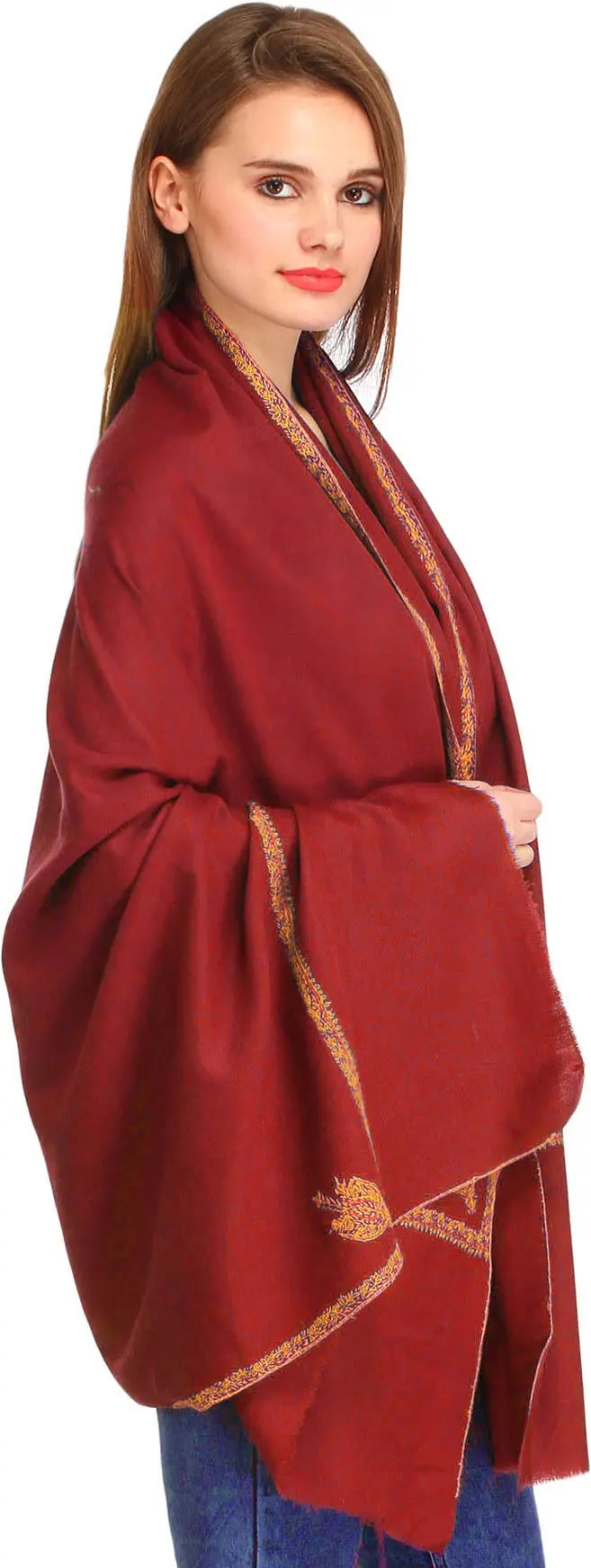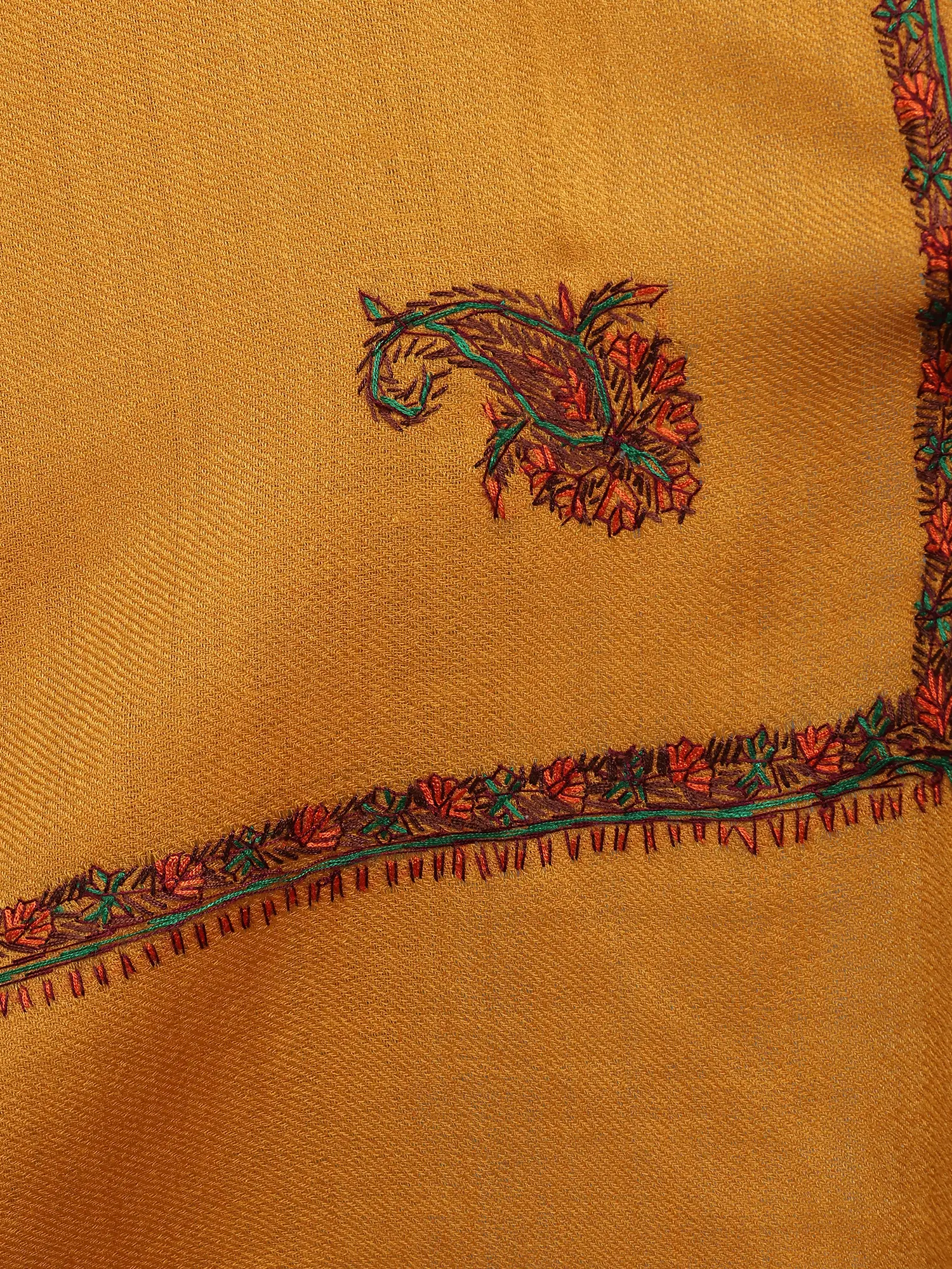 Besides being known for its mind-boggling beauty, Kashmir is very prominently known for its massive textile industry. Year after year, Kashmir has been surpassing every other state who have made India's mark globally through its textile industry. There is no way that you would not be able to distinctively spot Kashmiri shawls since most of them display unique symmetrically aligned motifs and embroidery of ancient art. Once a Kashmiri shawl has been made a part of your existing collection of shawls, you wouldn't be able to gauge the ever-lasting value added to your wardrobe. This alluring piece of accessory which you can see in the picture has been the most sophisticated and graceful Kashmiri Kingri shawl you will ever come across. With the minimal sozni embroidery accompanying the borders of the shawl, you would certainly want to buy this piece of accessory once you have your eyes on it. With the availability of 7 colors, get ready to feel the warmest this winter with our amazing collection of Kashmiri shawls that are made with love and 100% pure wool, to make you feel the warmest in winters.