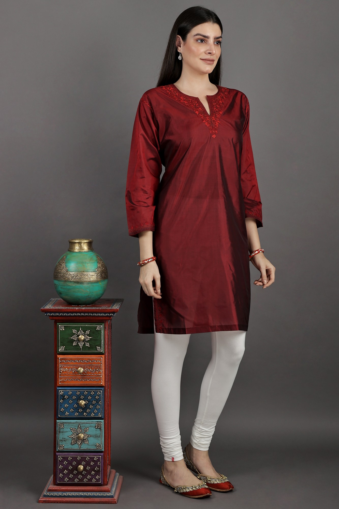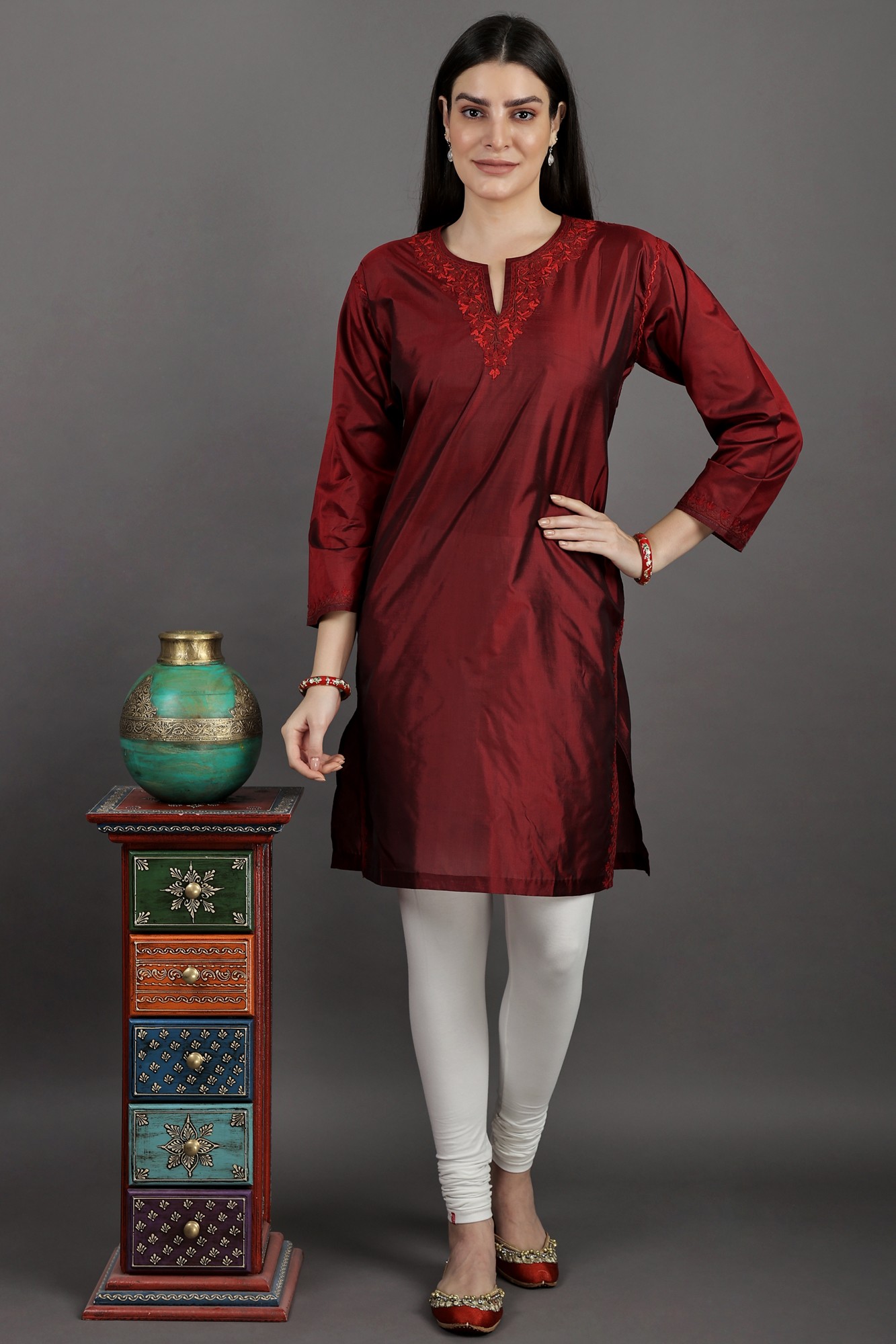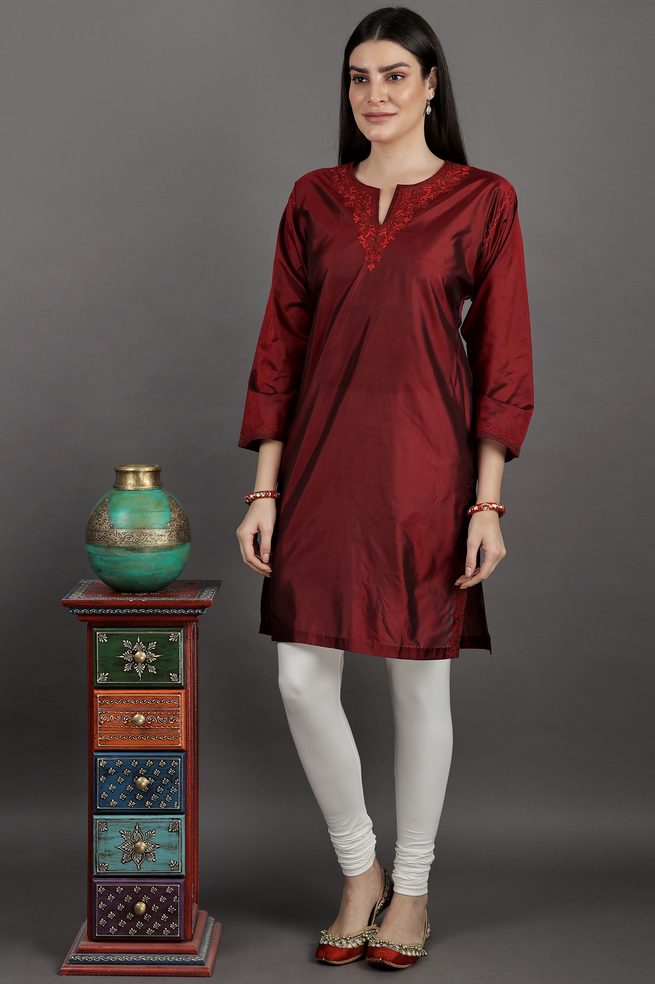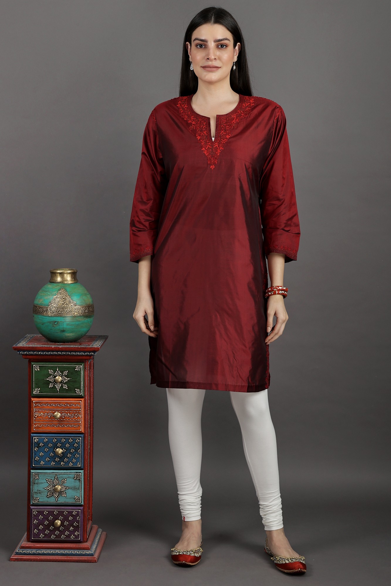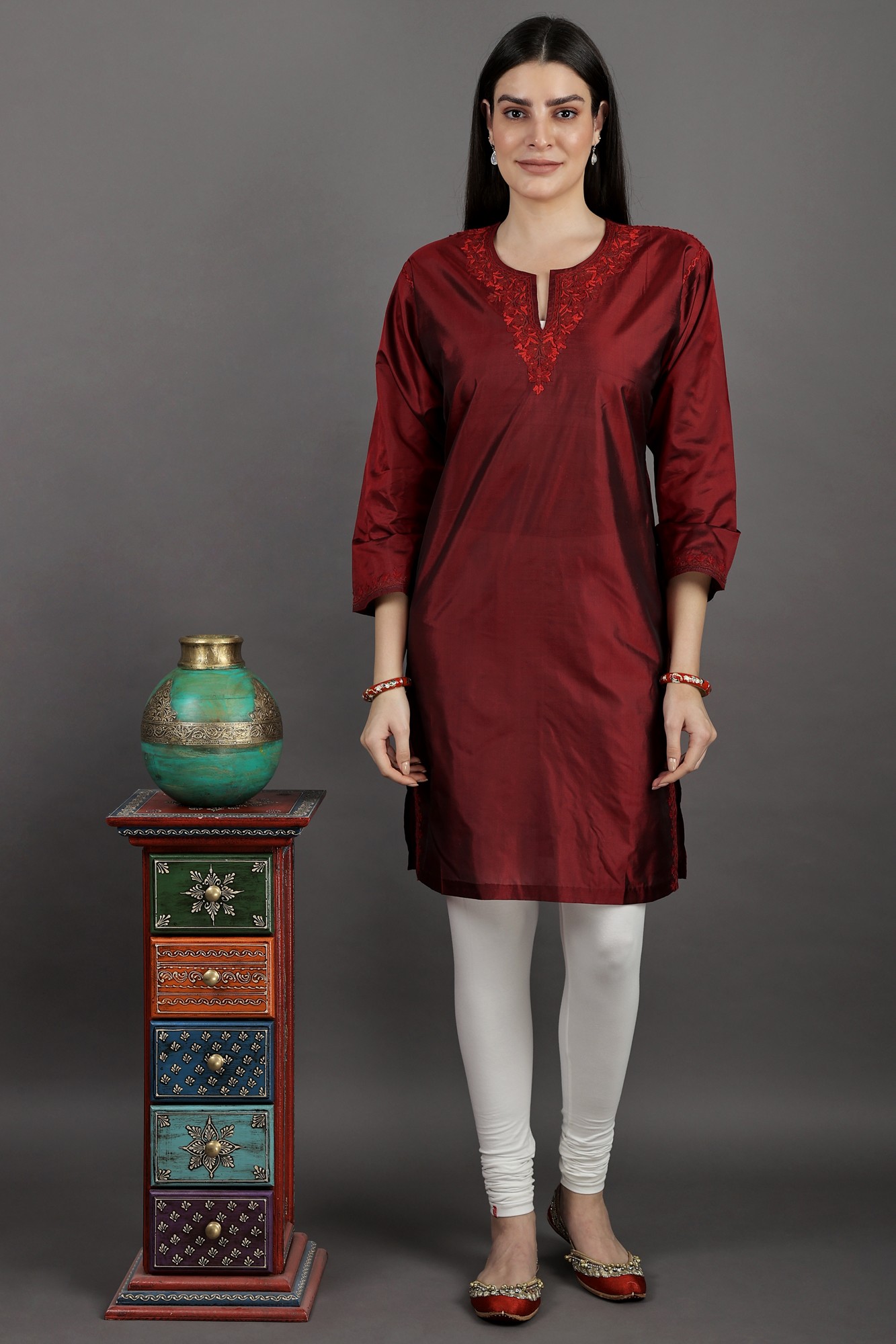 Experience the regalia of Kashmiri clothes with this plain silk kurta from Kashmir. Crafted with premium silk in lovely colors, the kurta has a hint of intricacy on the neckline created by the classic Aari work, using thick and colorful threads. Floral patterns along the neckline bring a charming feel to the kurta, making it a perfect addition of luxury to your ensembles.