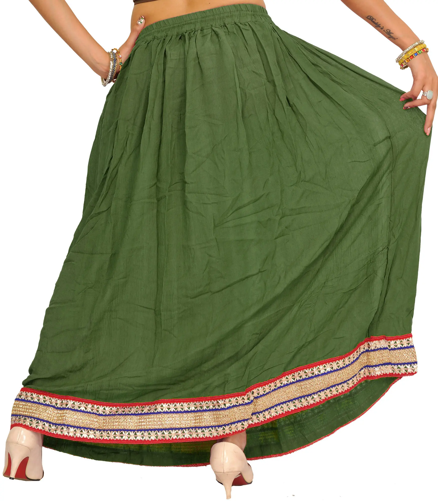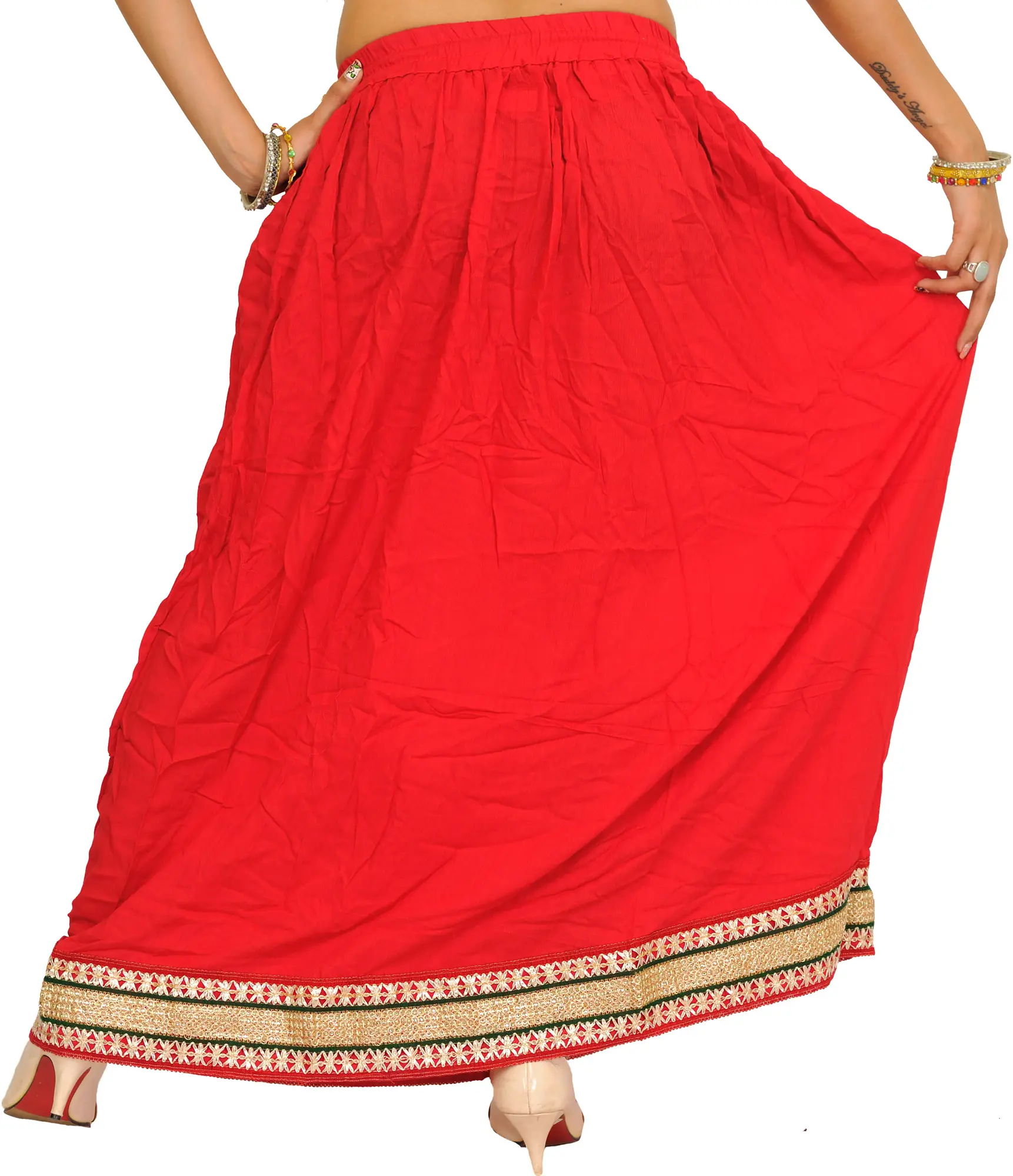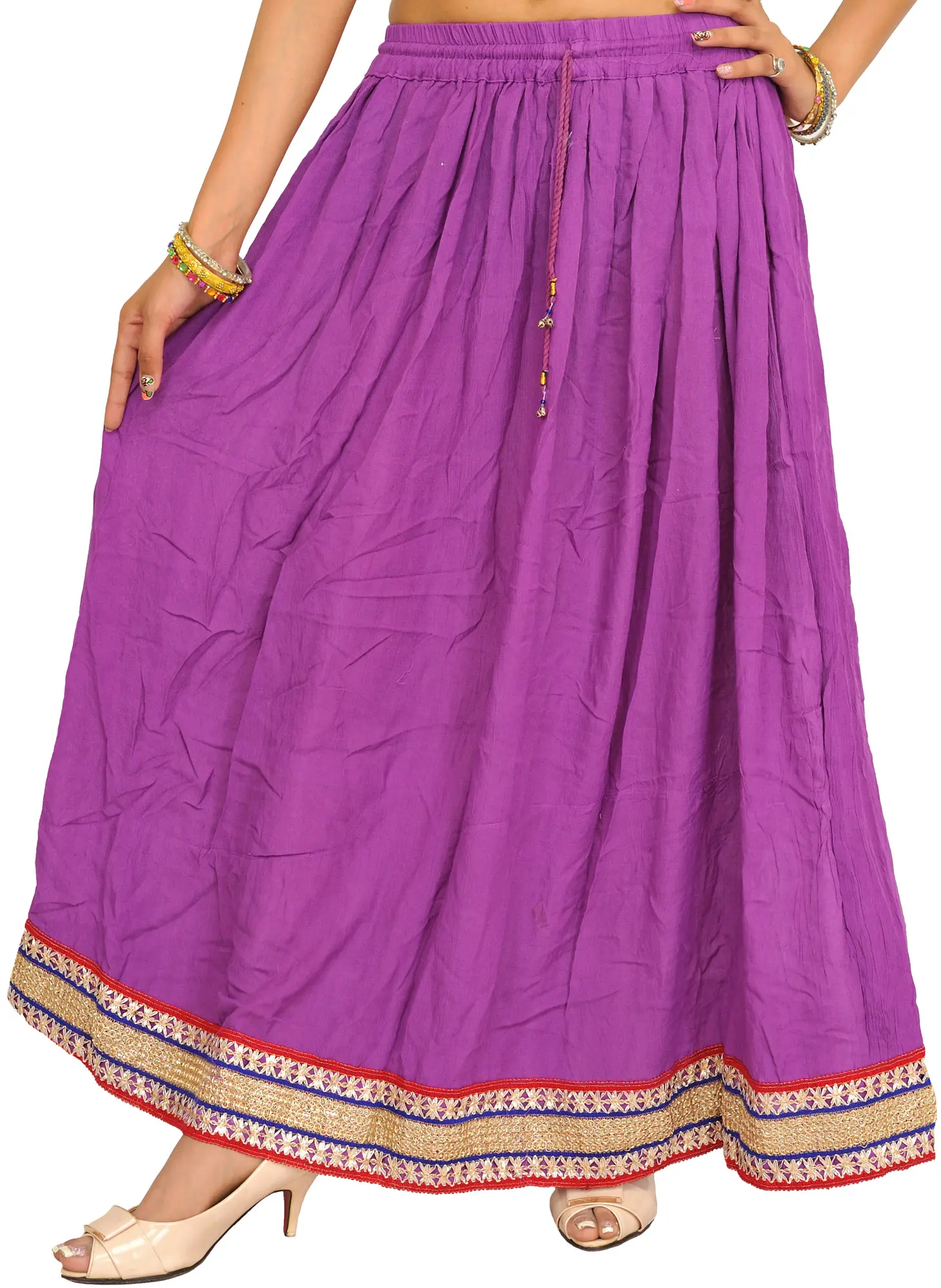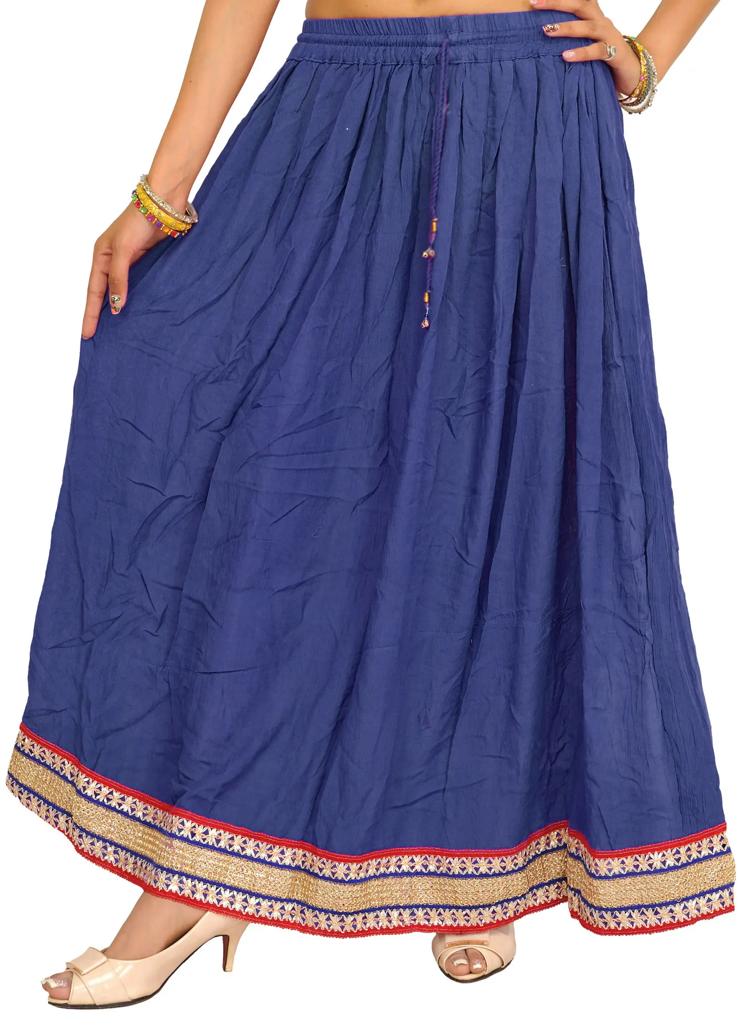 Embellished with patch borders, this “plain long skirt” is a heavenly muse, weaving narratives of enchanting beauty. Made from the finest rayon strands, it wraps the wearer in a whisper of luxury, swaying with each step like poetry in motion. Its simplicity, accented with beautiful patch borders, elevates it above plain cloth and transforms it into a canvas for artistic expression.