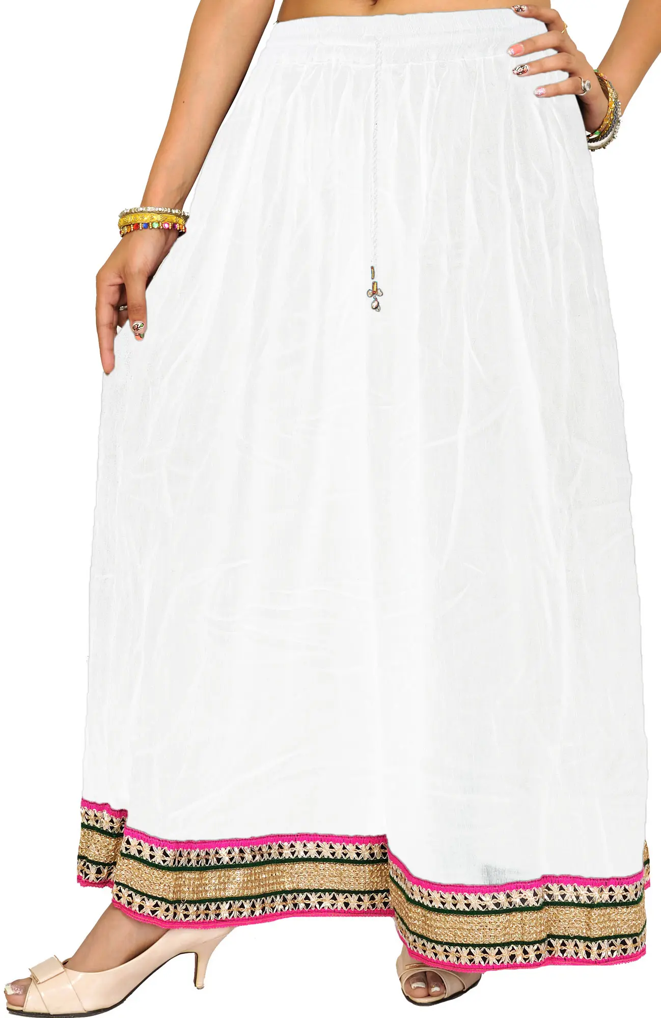 Embellished with patch borders, this “plain long skirt” is a heavenly muse, weaving narratives of enchanting beauty. Made from the finest rayon strands, it wraps the wearer in a whisper of luxury, swaying with each step like poetry in motion. Its simplicity, accented with beautiful patch borders, elevates it above plain cloth and transforms it into a canvas for artistic expression.