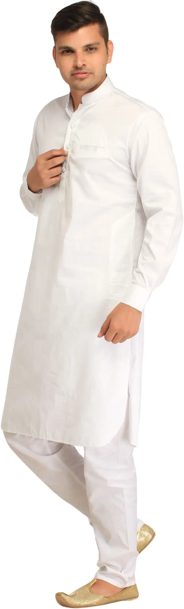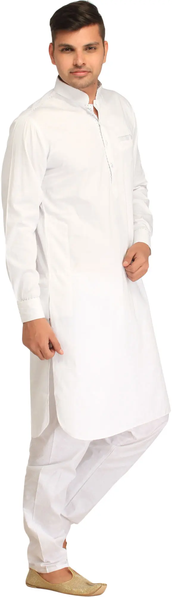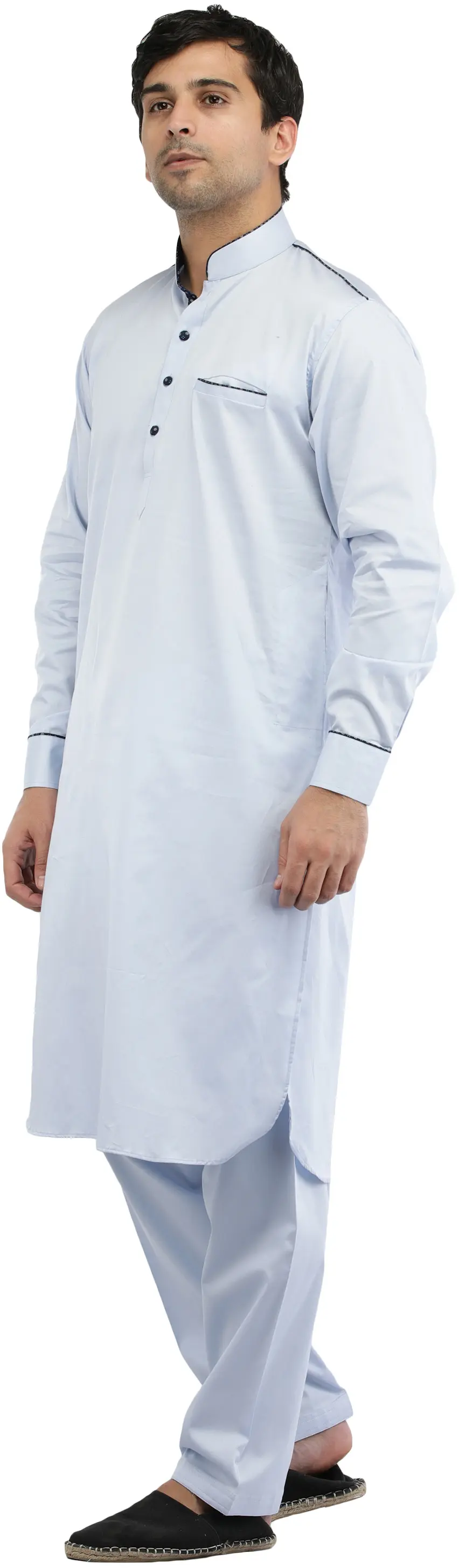 With this Plain Pathani Kurta Salwar Set, which has beautiful piping work, you may immerse yourself in enchanting beauty. This suit, made from pure cotton, flawlessly balances comfort and style. The breathable fabric provides a comfortable fit, making it suitable for any occasion.