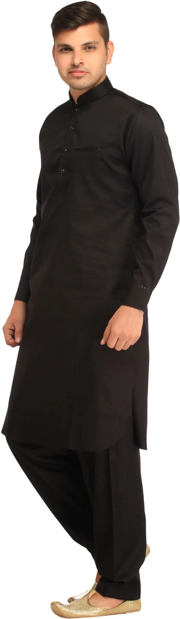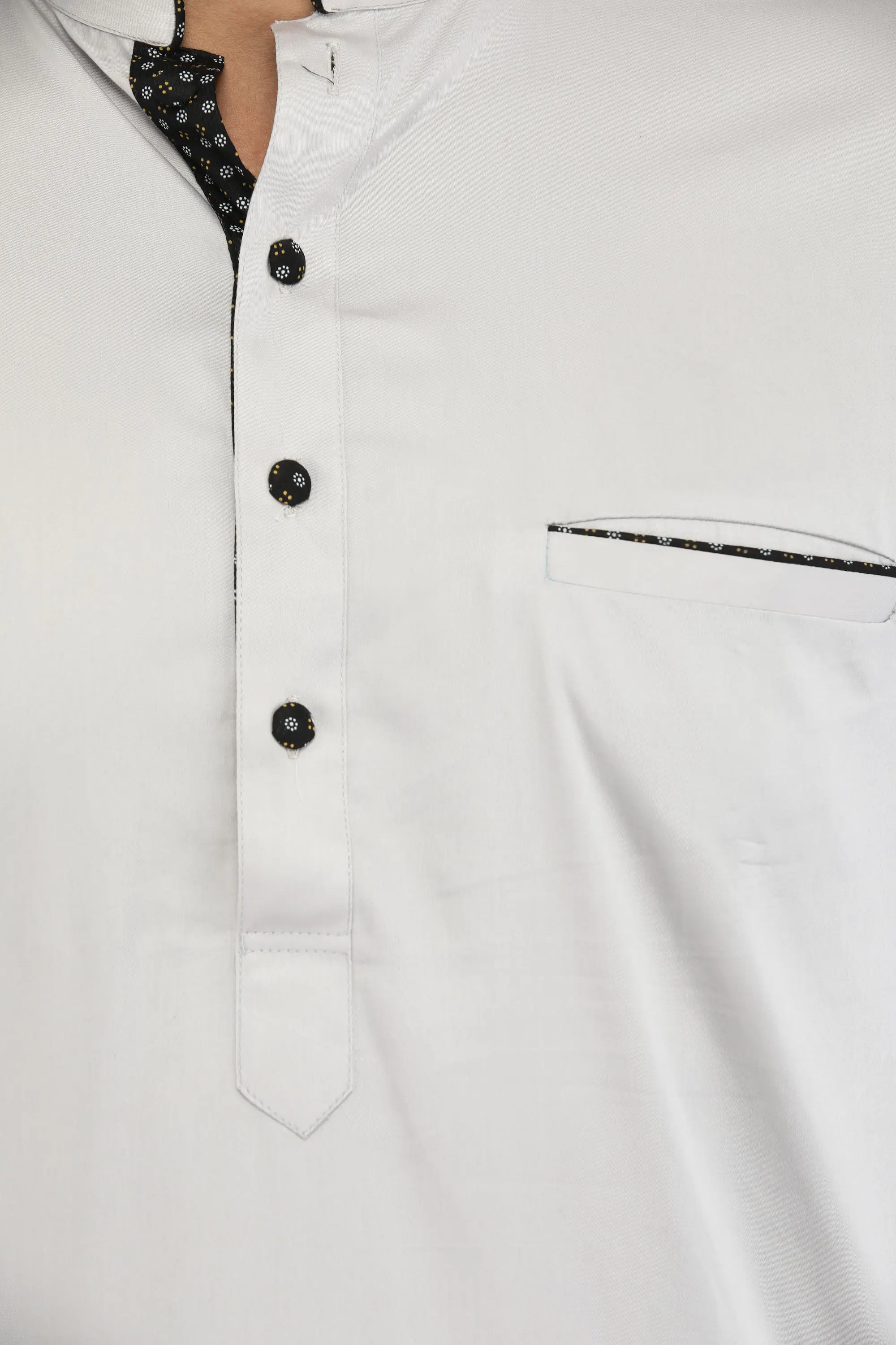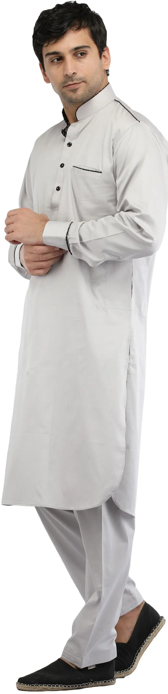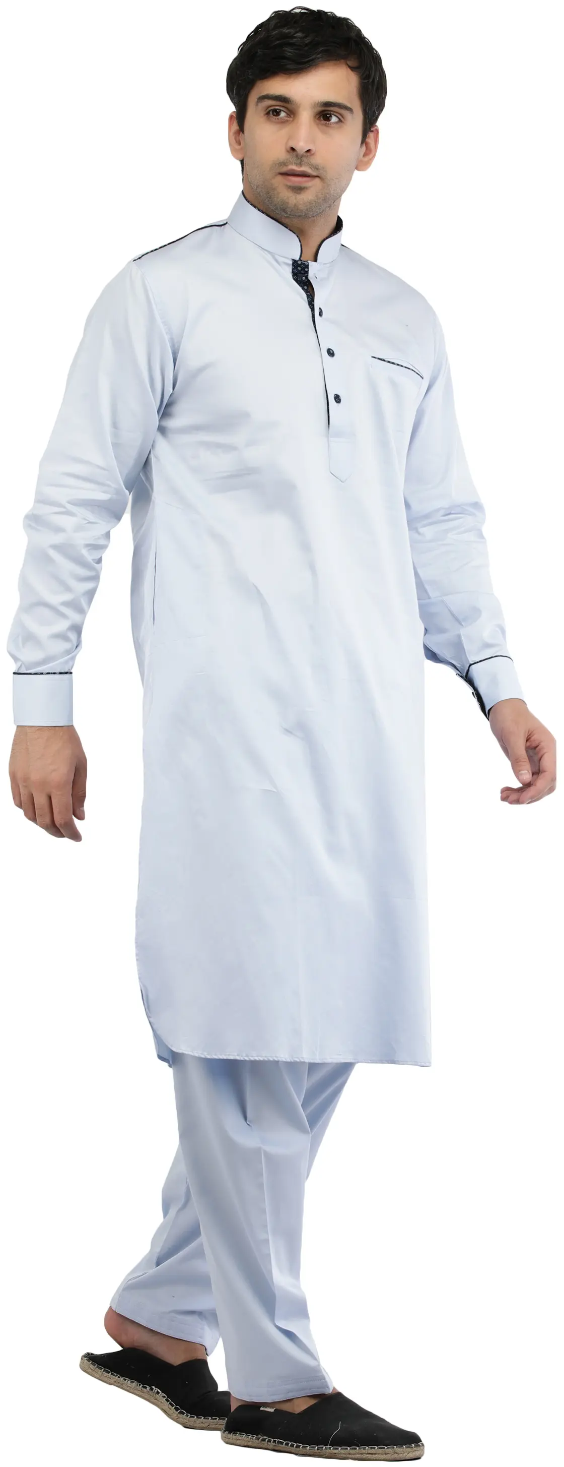 With this Plain Pathani Kurta Salwar Set, which has beautiful piping work, you may immerse yourself in enchanting beauty. This suit, made from pure cotton, flawlessly balances comfort and style. The breathable fabric provides a comfortable fit, making it suitable for any occasion.