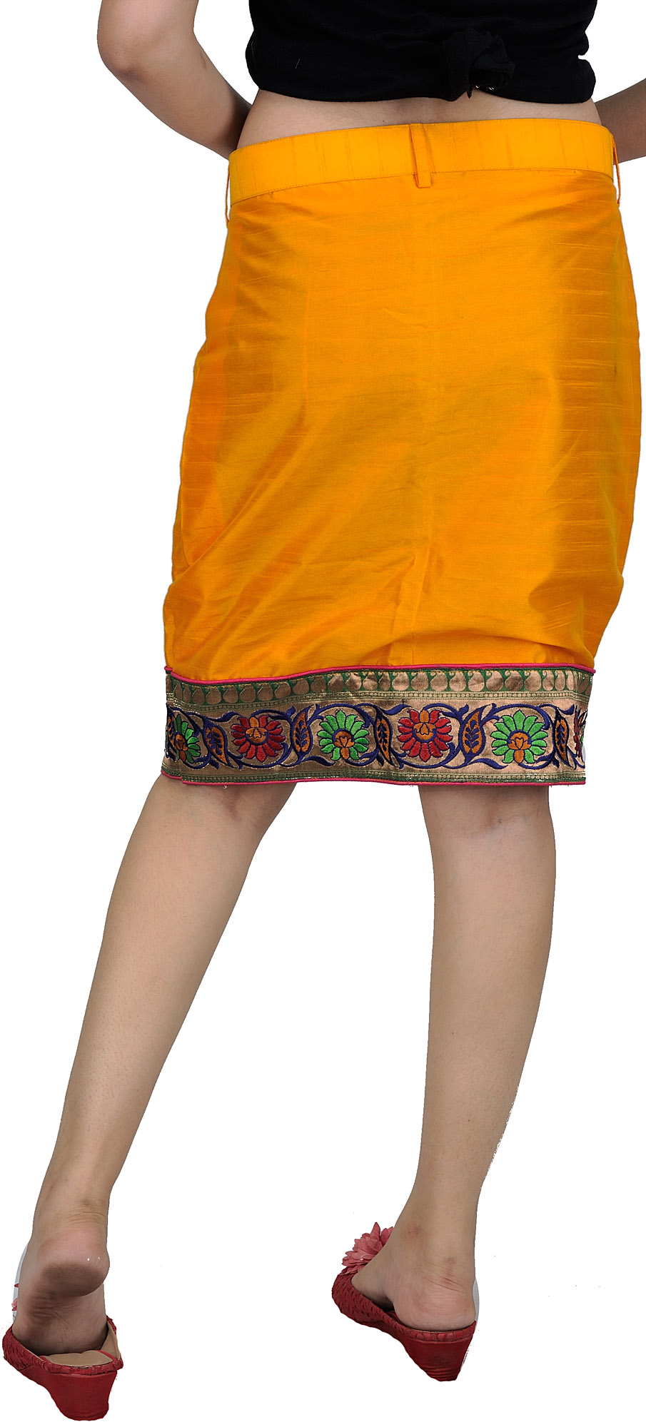 Set the bar of fashion high with this stunning pencil skirt, which perfectly blends modern style with the appeal of ethnic patterns and material. The plain knee-length pencil skirt is crafted with soft art silk, which provides you with a luxurious appeal. On the hem of the skirt, a floral patch border with gorgeous vines and paisley patterns beautifies the piece, extending to you a chance to strike a stylish equilibrium between your love for contemporary and traditional fashion.