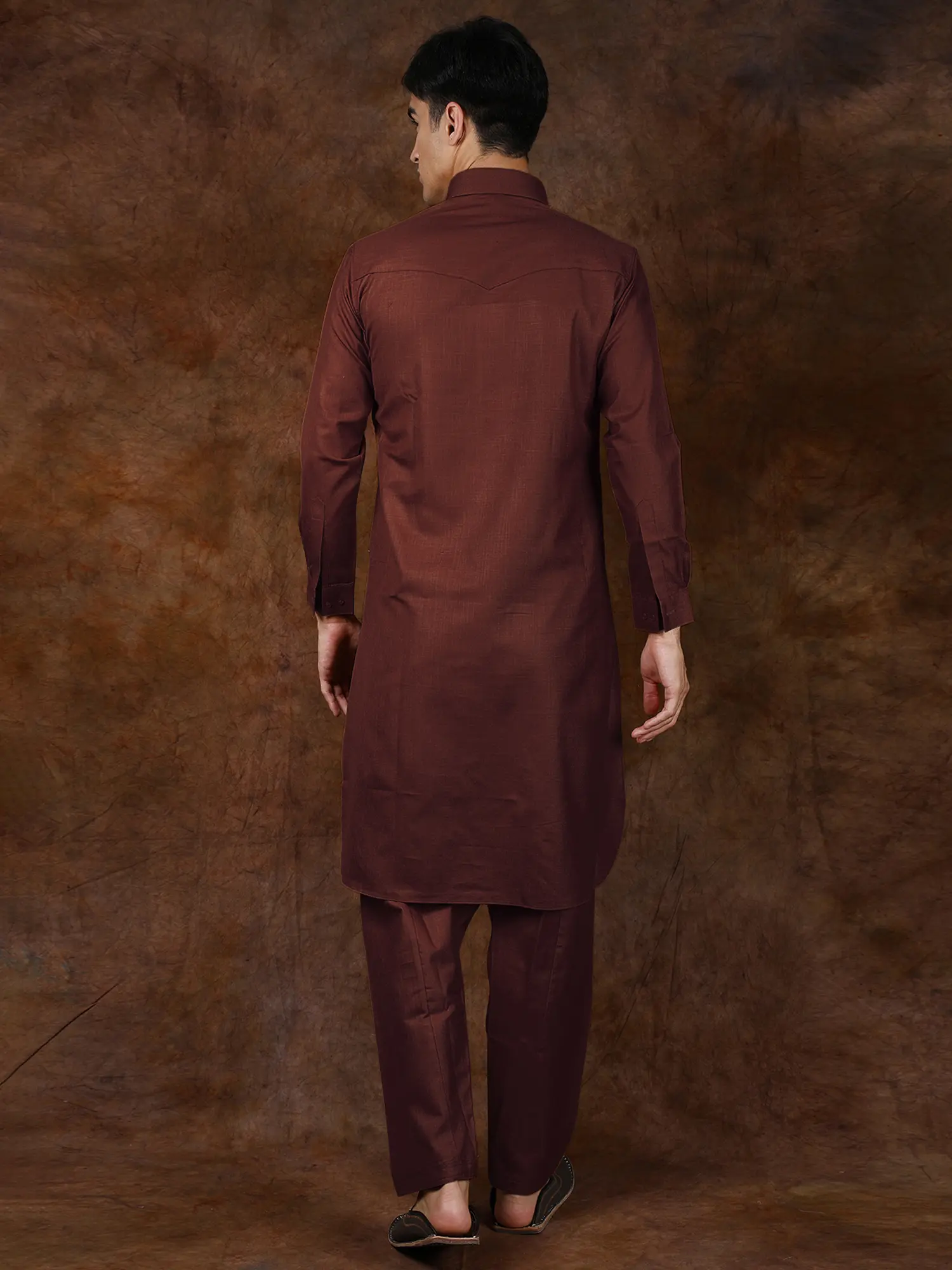 Burnt-Maroon Pathani Style Kurta Pajama Set with Front Pocket