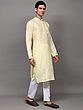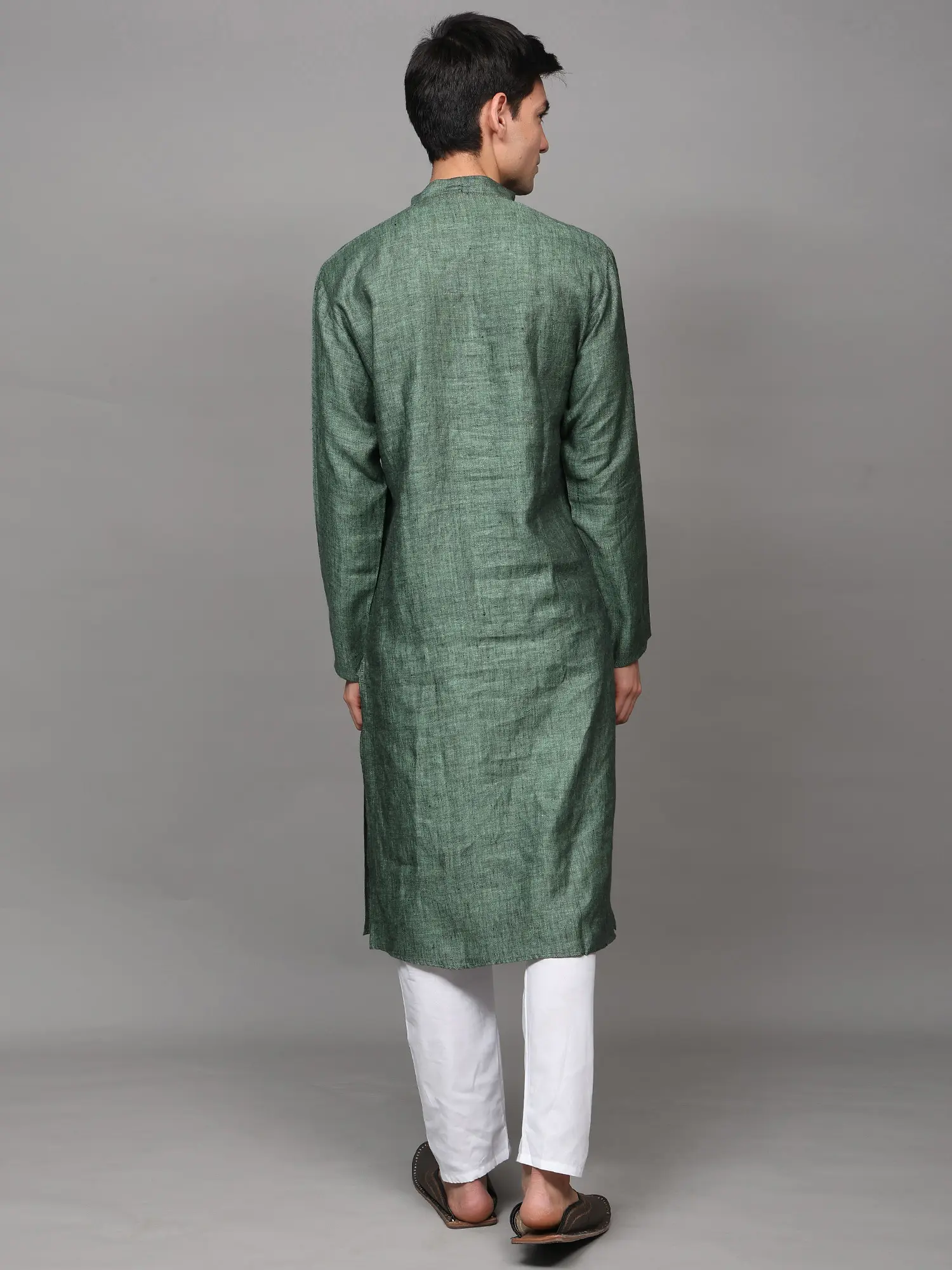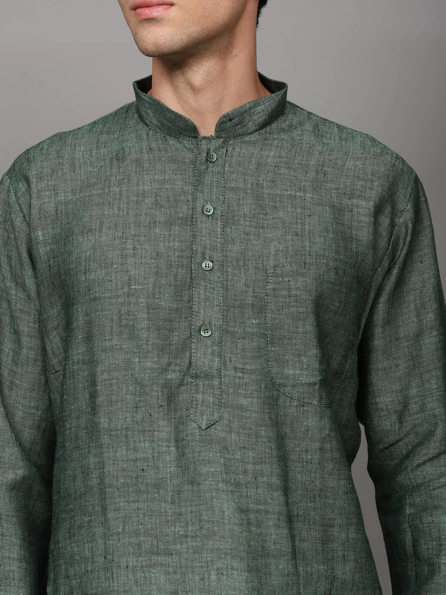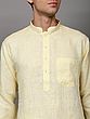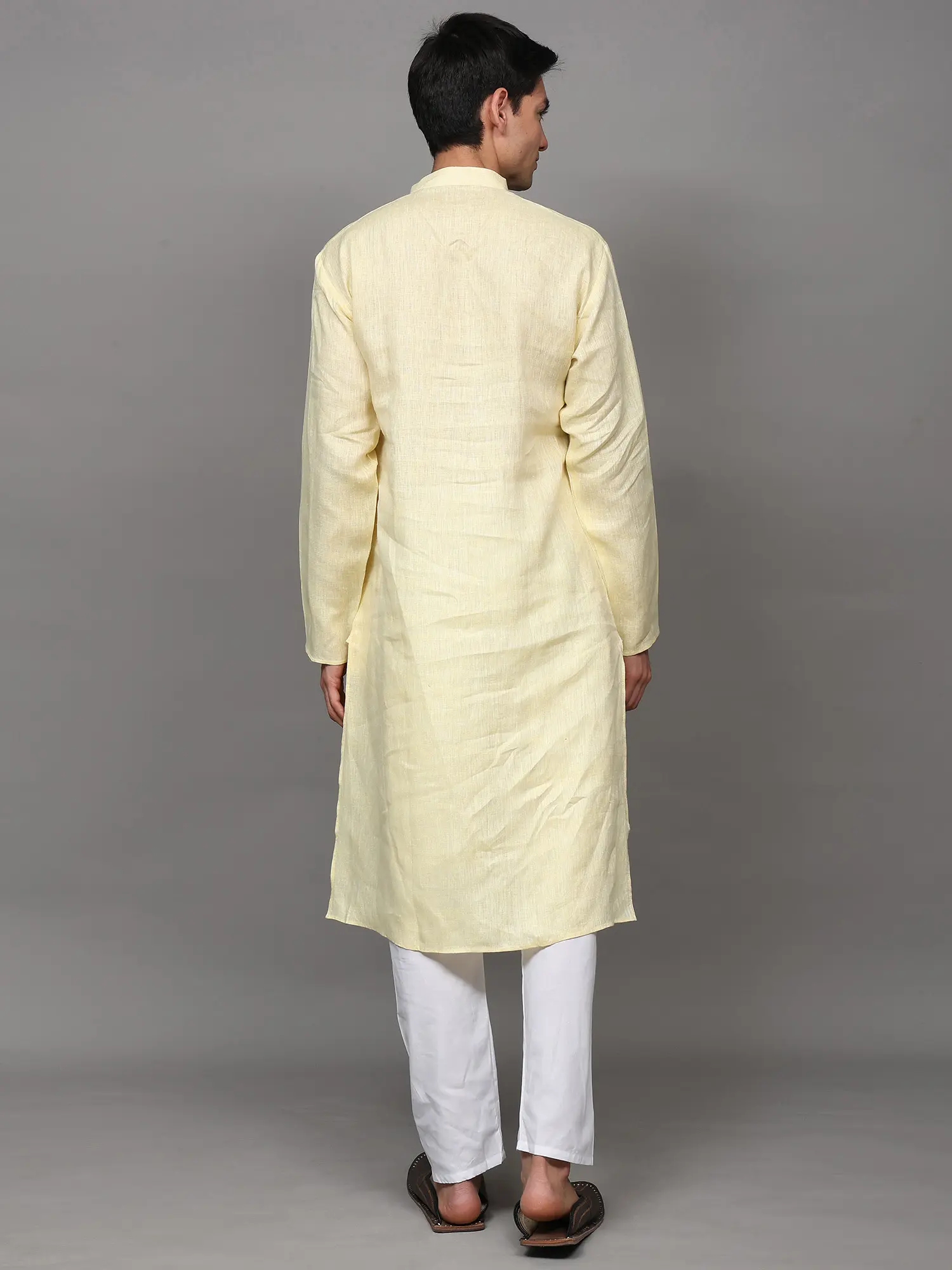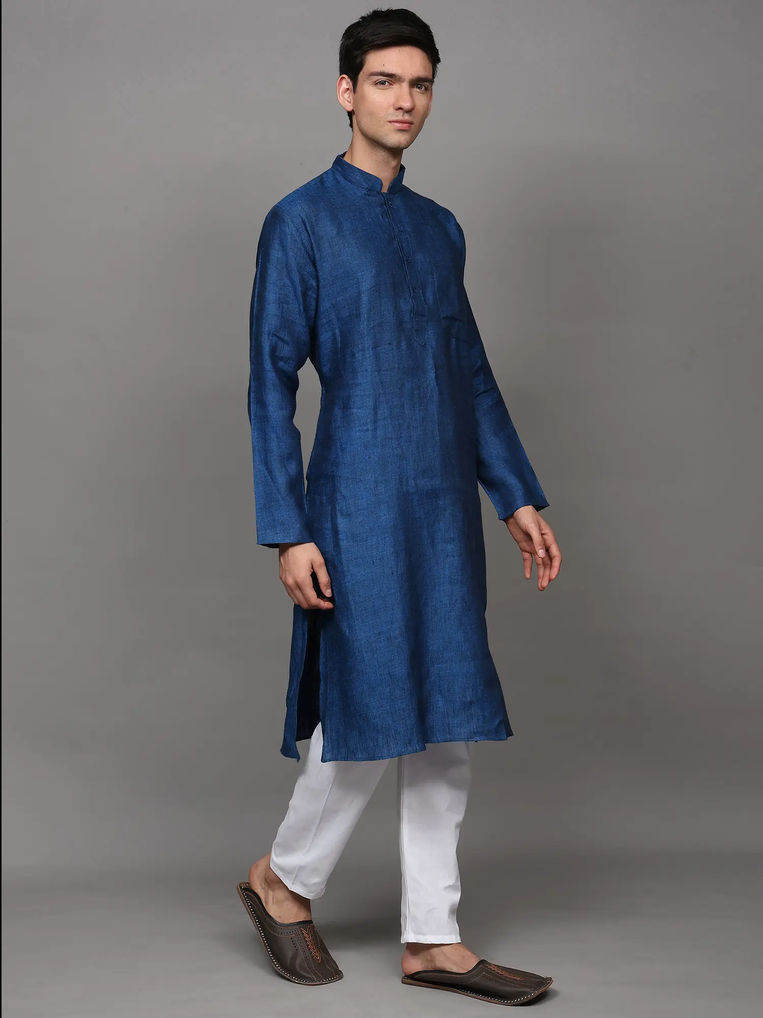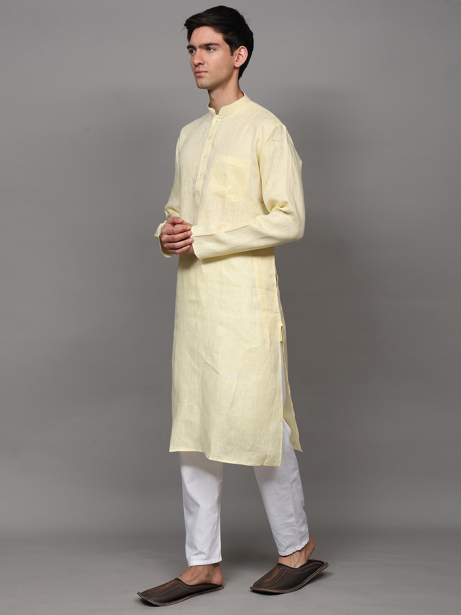 The kurta is woven in a high-neck four buttoned collar, full sleeves and length till the knees, which makes it one of the best wears for puja ceremonies or other Indian ritual events like mehendi or haldi ceremony. We help you out with an ample collection of colors to choose from, ranging from all varieties of light to dark shades like the unique grey-blue, bright yellow, dark royal green, bright blue, lustrous grey, soothing lavender, peach and the oceanic blue. All the colors of kurtas are paired with snow white colored linen pajama and a single pocket on the left side of the chest to create the best set of Indian fashion wear for men.