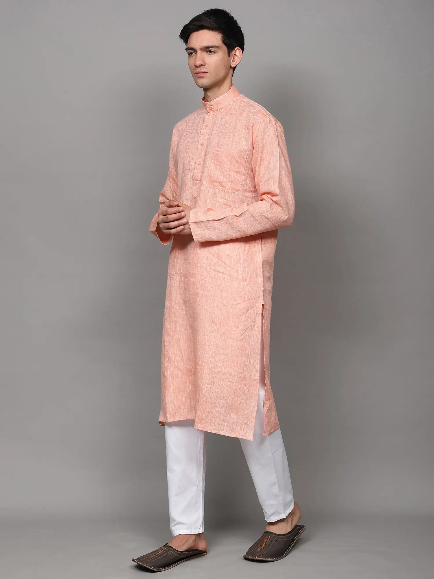 Indian fashion wear has the most changing trend, so to be in level with the great fashionistas it is mandatory to keep a regular check on the ongoing and upcoming fashion ways for both men and women. Keeping this in mind, our expert team brings out the best from the lot, for you, to keep your wardrobes filled with the latest fashion trends. This linen kurta pajama set is the most highly demanded Indian men fashion wear, as its 100% pure quality fabric allows it to be worn in scorching sun. Linen has a natural looking texture and can withstand high temperatures. The finest quality of a linen fabric is that it is strong and it can easily absorb and draw away heat from the body, which makes it a comfortable wear for summers. As you zoom in to the image, you can see the self-textured pattern and a slight sheen on the fabric, which gives it a semi-formal look.