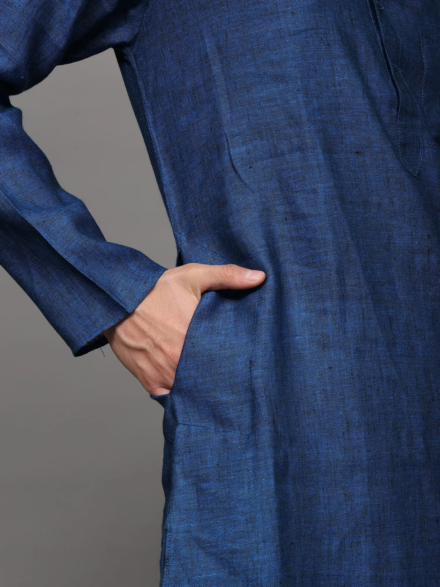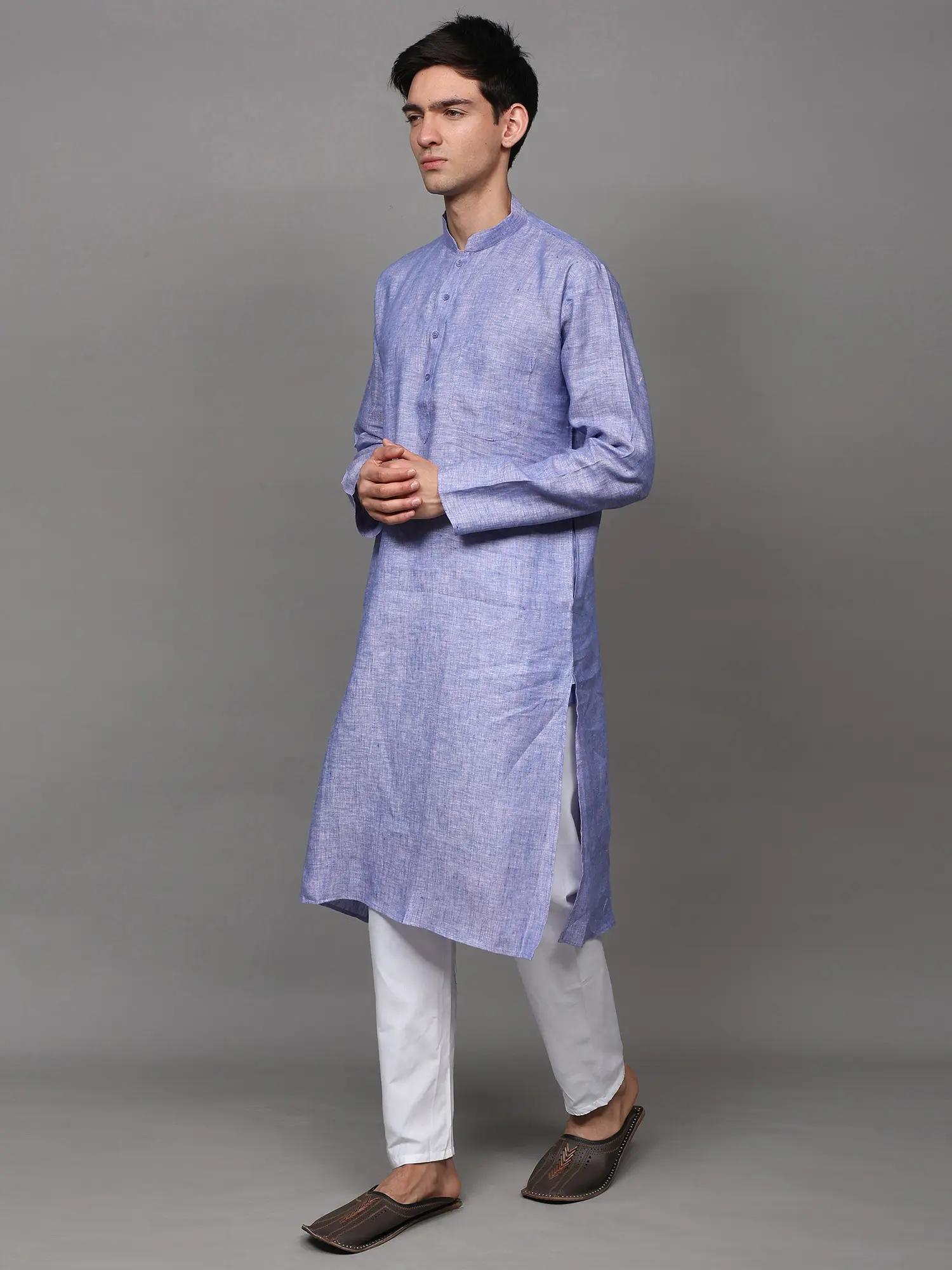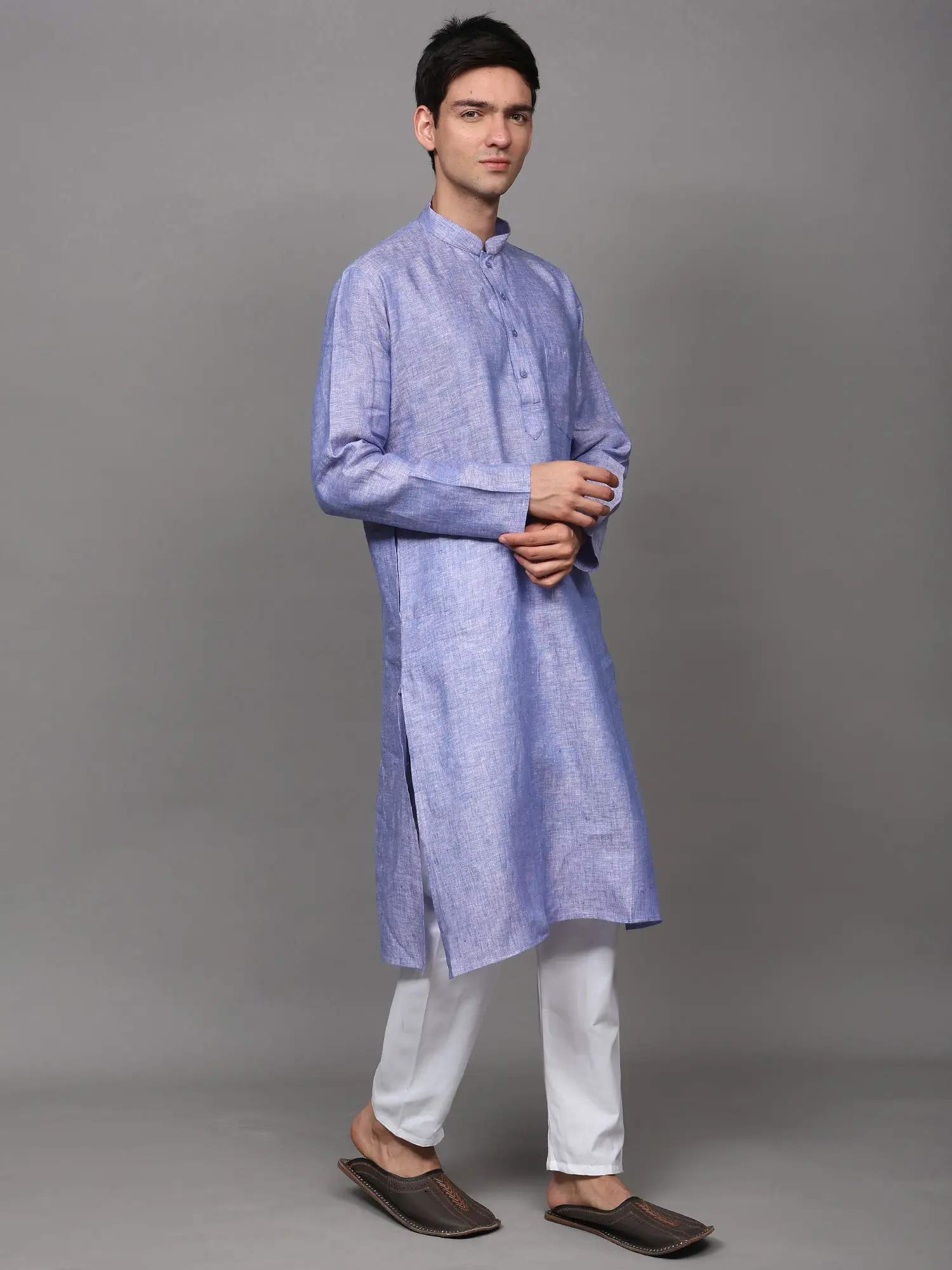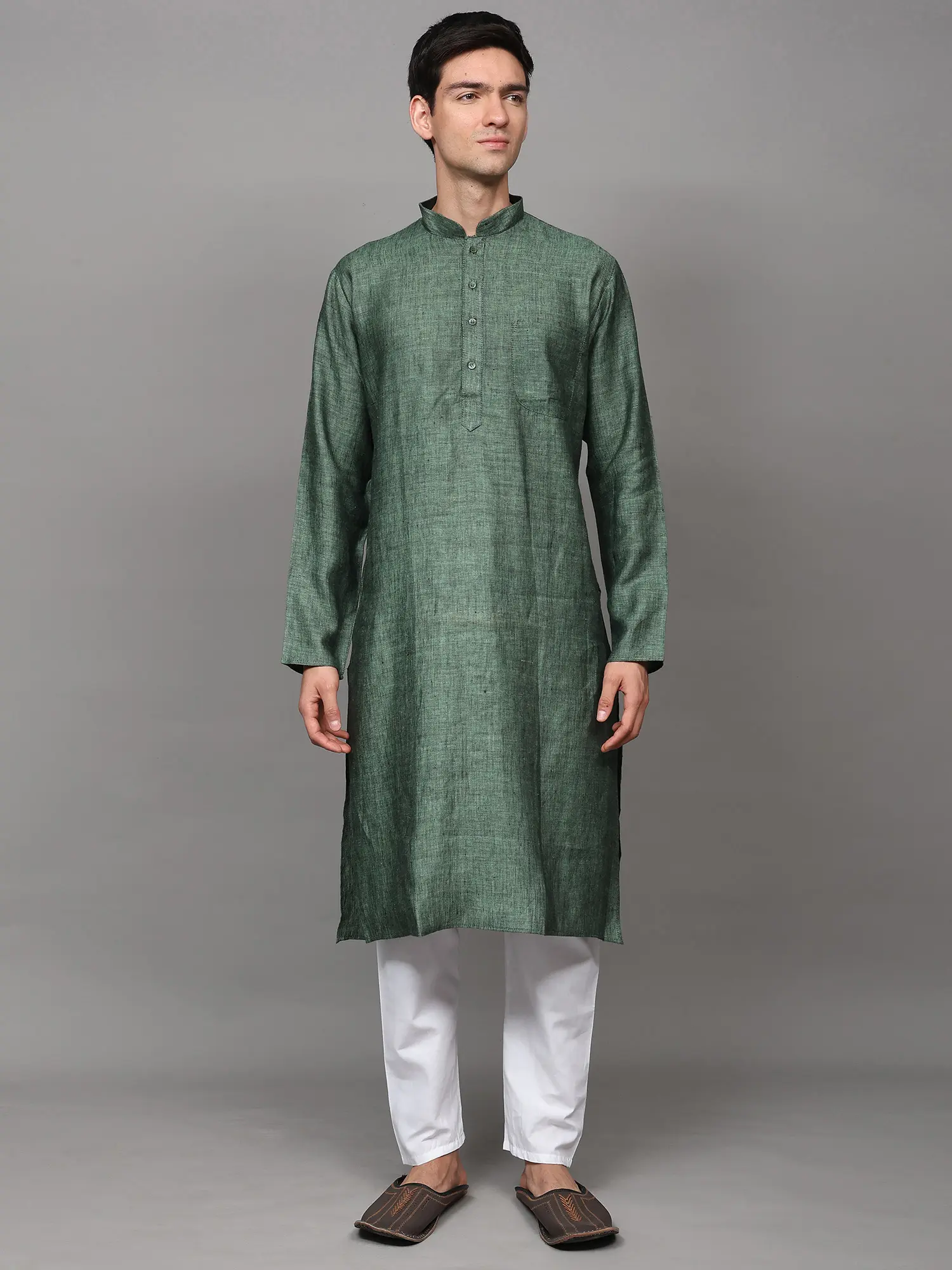 The kurta is woven in a high-neck four buttoned collar, full sleeves and length till the knees, which makes it one of the best wears for puja ceremonies or other Indian ritual events like mehendi or haldi ceremony. We help you out with an ample collection of colors to choose from, ranging from all varieties of light to dark shades like the unique grey-blue, bright yellow, dark royal green, bright blue, lustrous grey, soothing lavender, peach and the oceanic blue. All the colors of kurtas are paired with snow white colored linen pajama and a single pocket on the left side of the chest to create the best set of Indian fashion wear for men.