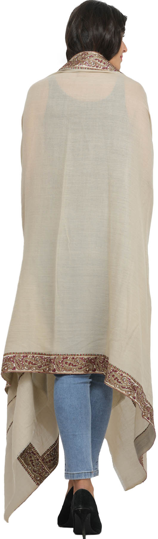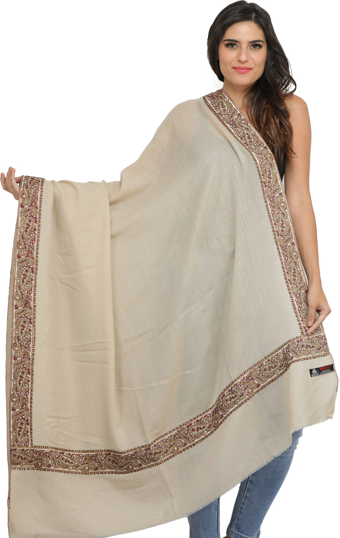 Cannoli-Cream Pure Pashmina Shawl with Sozni Hand-Embroidered Flowers and Patch Palla from Srinagar