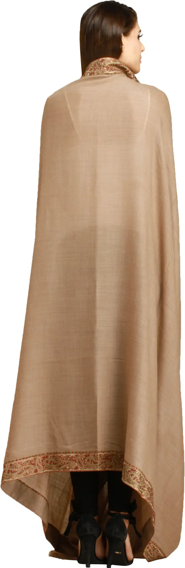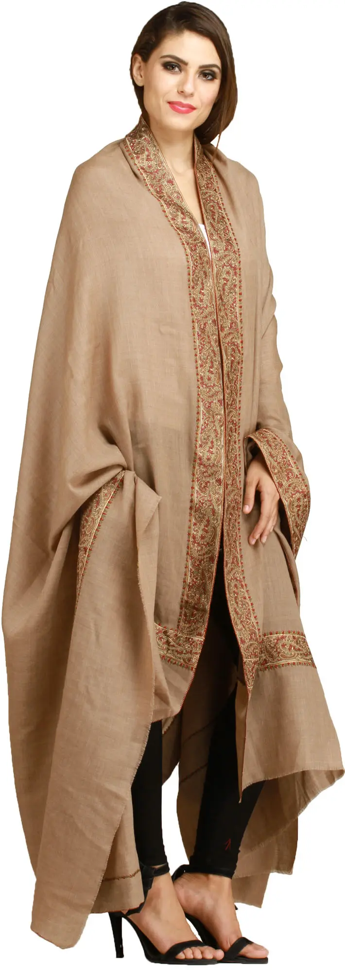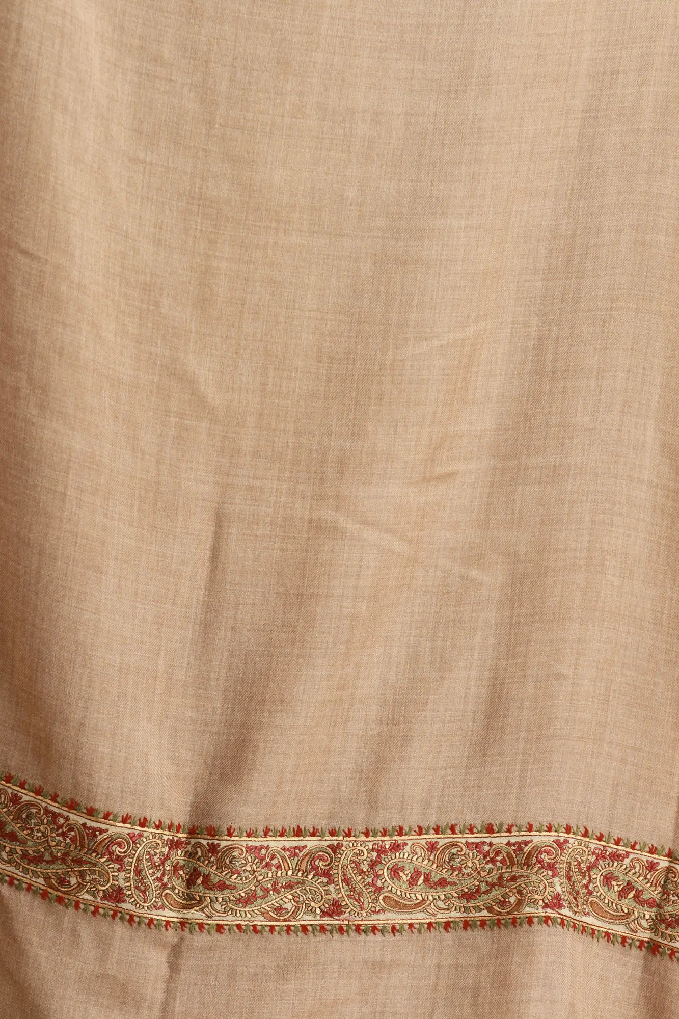 Discover the exquisite craftsmanship of Amritsar with this luxurious pure wool shawl, a true testament to traditional Indian artistry. Draped in a rich, earthy tone, this shawl offers a sophisticated foundation for its standout feature: a meticulously embroidered border showcasing the iconic paisley motif. The intricate embroidery, rendered in warm hues of red and gold, forms a rich tapestry that frames the entire piece, adding a touch of regal charm and artisanal flair.