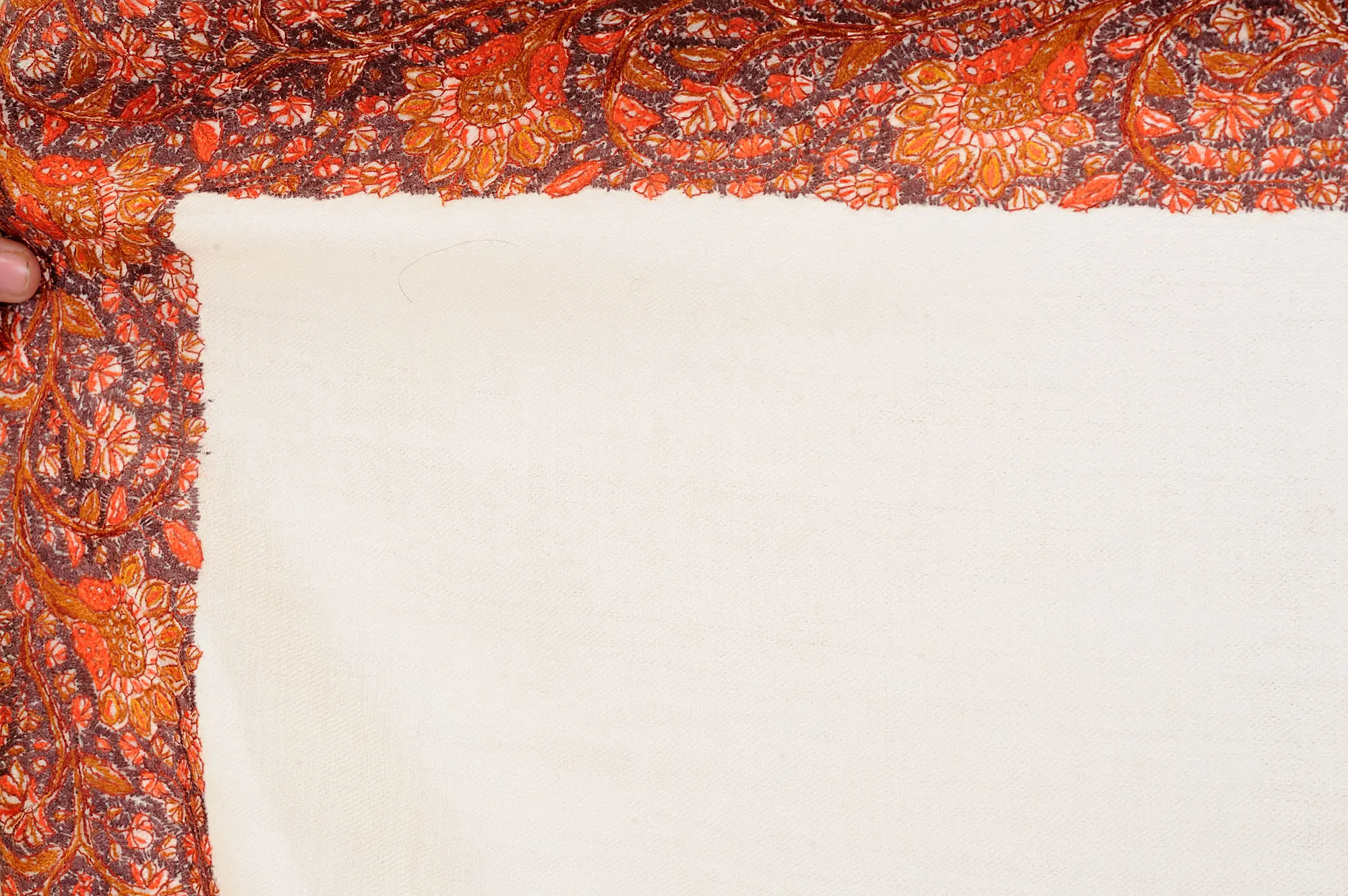 The Sozni embroidery on this shawl is a visual delight. Delicate floral motifs and paisley designs bloom along the entire length of the borders, rendered in vibrant hues of orange and red that contrast beautifully with the creamy expanse of the wool. This embroidery technique, known for its fine detail and precision, adds a touch of opulence and sophistication. The skilled handwork creates a raised texture, giving the embroidered elements a tangible depth and dimension that draws the eye. The patterns are not merely decorative; they are a language of symbols and stories passed down through time, each telling a tale of nature, beauty, and cultural expression.