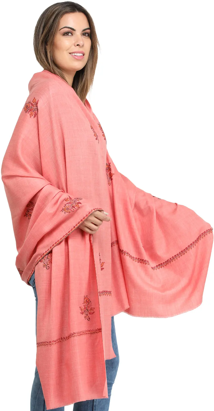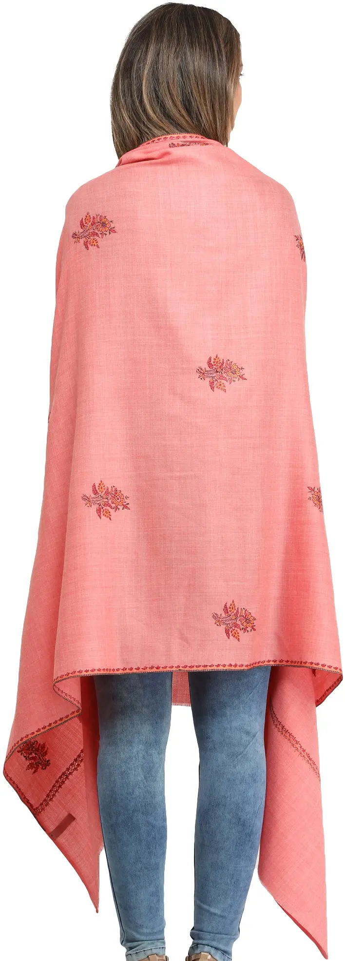 North India is known for the exquisite shawls it produces. Of the variety of endemic styles of embroidery that come from this region, sozni is arguably the most desirable of them all. Set against the pure wool of the foundation cloth dyed a pale, peachy pink, the vibrant threads of the sozni-embroidered petals and foliage along the edges are sure to catch everyone's eye. The colour is distinctly feminine, so layering this over something ethnic or even dressy would best bring out its beauty.