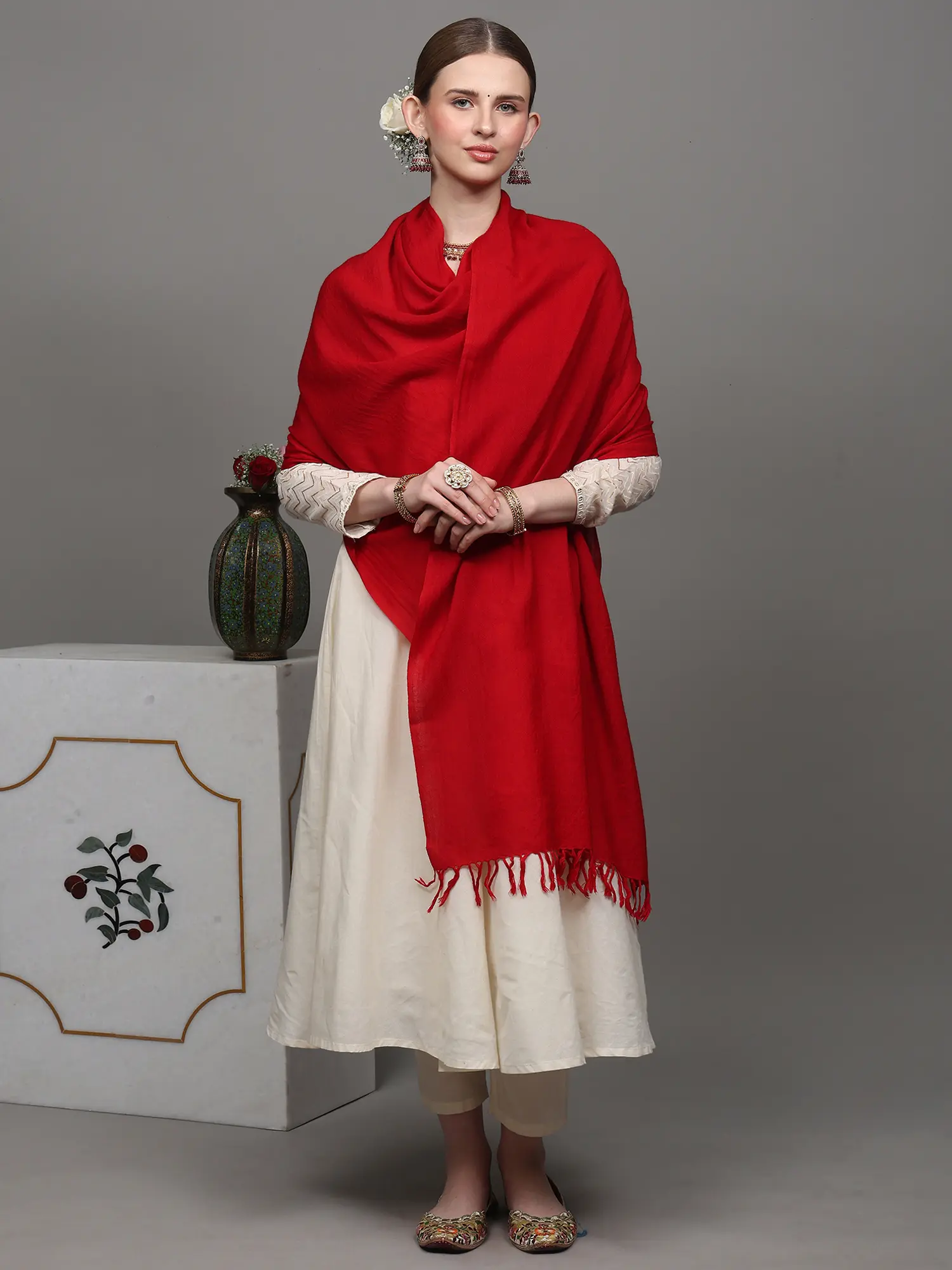 The Rich heritage of Kashmir is radiating through this stunning yet Plain Tusha Stole from Kashmir, specially handcrafted by experienced artisans. Tusha is a fine and delicate form of fabric, that originates from the cocoon of the Himalayan silkworm. The natural sheen of the fabric and its breathability make it a cherished textile. The stole reflects a sense of simplicity through its design and allows the fabric's beauty to shine. These stoles have beyond any time as they embody the soul of tradition while seamlessly blending with contemporary fashion trends. The experience of fine luxury can enter your life once you are wrapped in the soft embrace of Tusha, you'll experience luxury, comfort, and a connection to Kashmir's artistic legacy.
