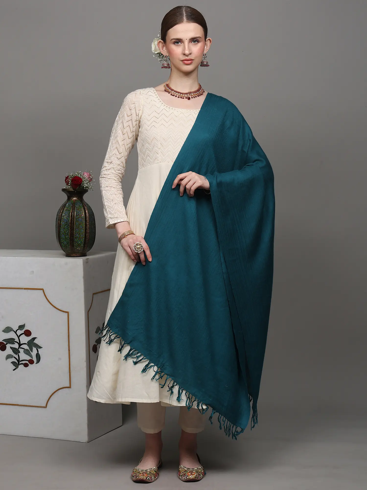 The Rich heritage of Kashmir is radiating through this stunning yet Plain Tusha Stole from Kashmir, specially handcrafted by experienced artisans. Tusha is a fine and delicate form of fabric, that originates from the cocoon of the Himalayan silkworm. The natural sheen of the fabric and its breathability make it a cherished textile. The stole reflects a sense of simplicity through its design and allows the fabric's beauty to shine. These stoles have beyond any time as they embody the soul of tradition while seamlessly blending with contemporary fashion trends. The experience of fine luxury can enter your life once you are wrapped in the soft embrace of Tusha, you'll experience luxury, comfort, and a connection to Kashmir's artistic legacy.