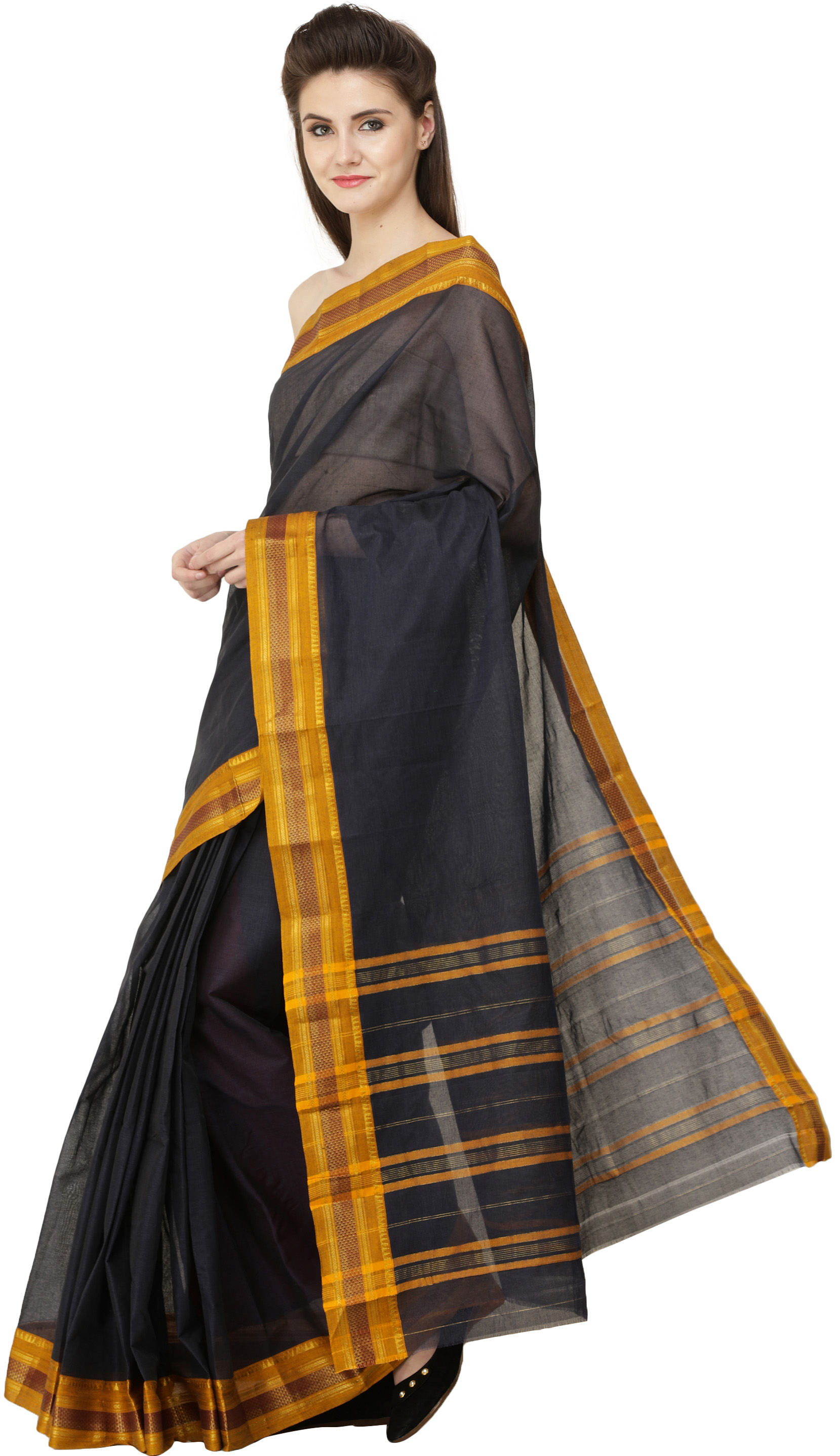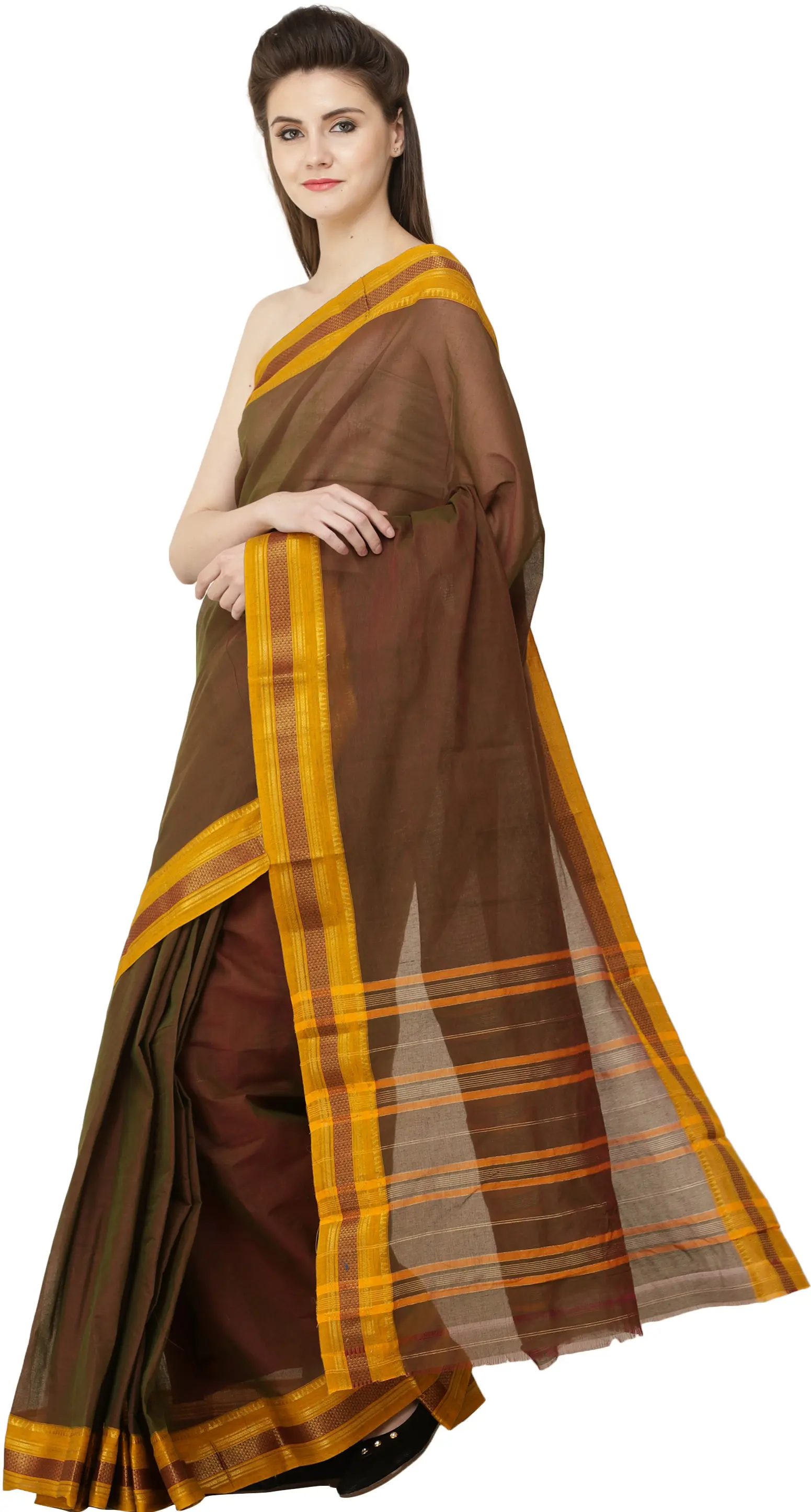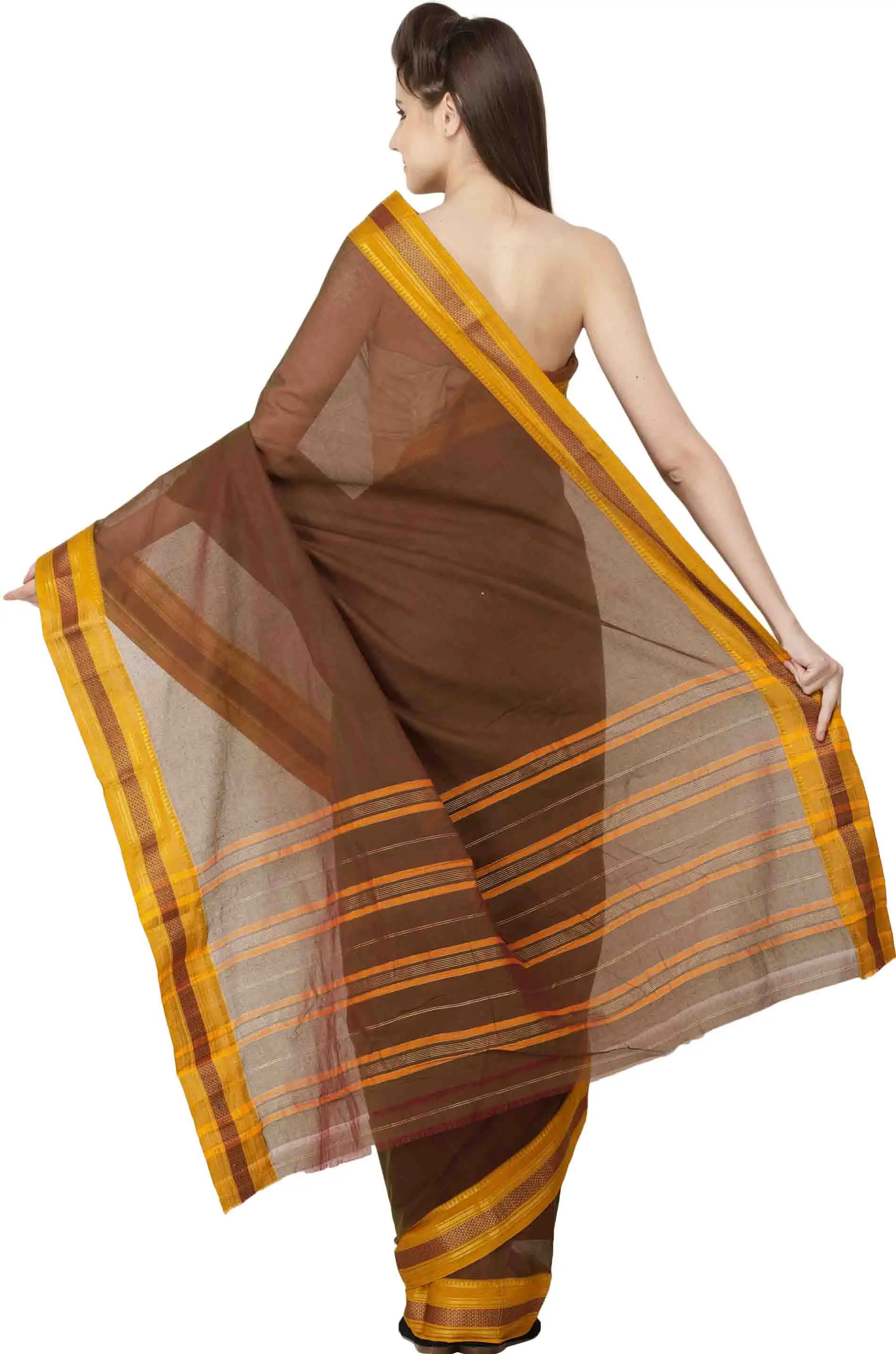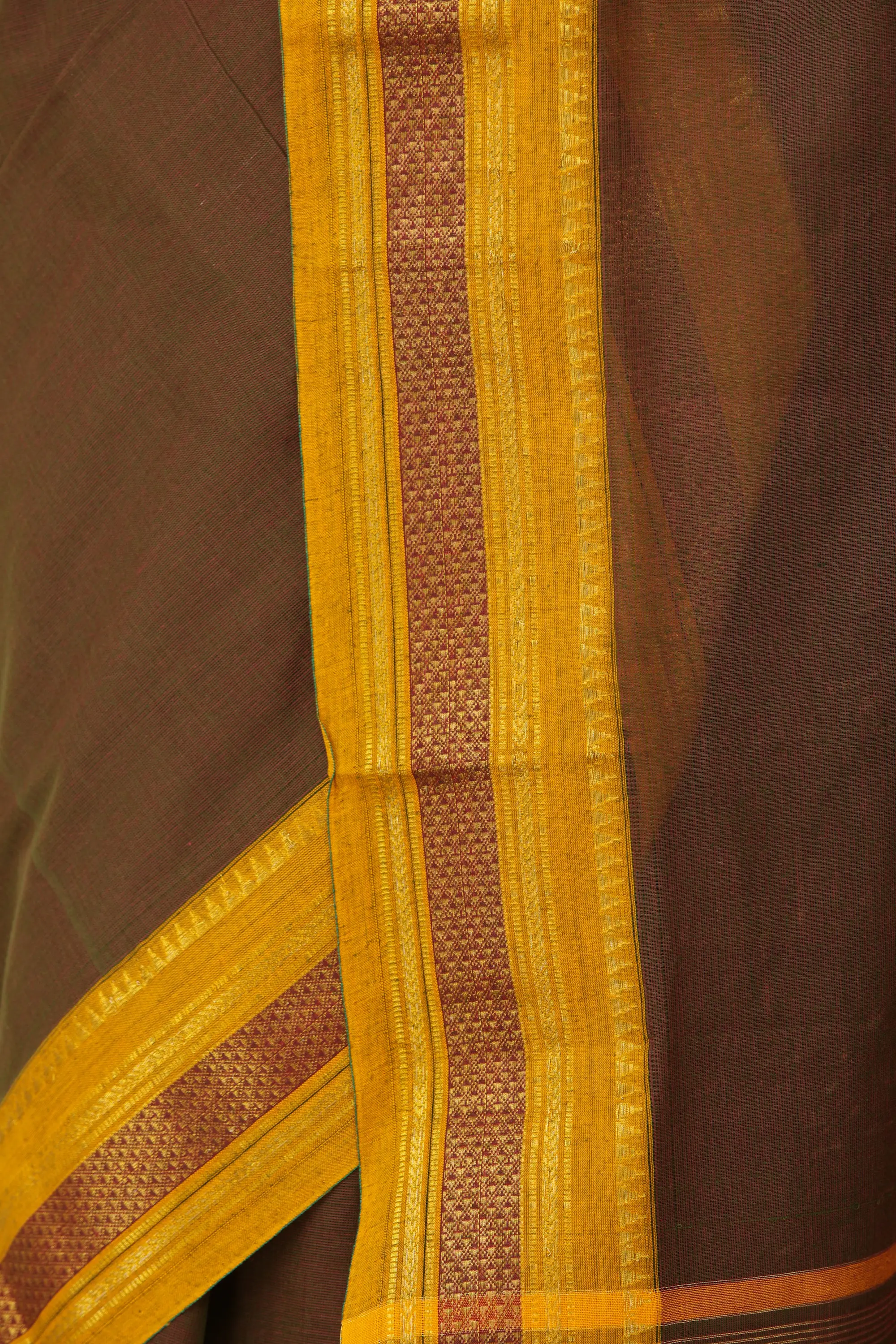 Venkatagiri sarees are renowned for their fine texture, light weight, and the characteristic zari borders. This particular piece carries forward that legacy with its smooth cotton weave that feels gentle against the skin. The rich brown hue offers a sophisticated base, allowing the vibrant yellow and complementary striped detailing within the zari border to truly stand out. Whether you're attending a wedding, a festive gathering, or a formal event, this saree promises to make a statement of understated grace and timeless style.