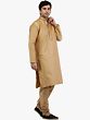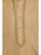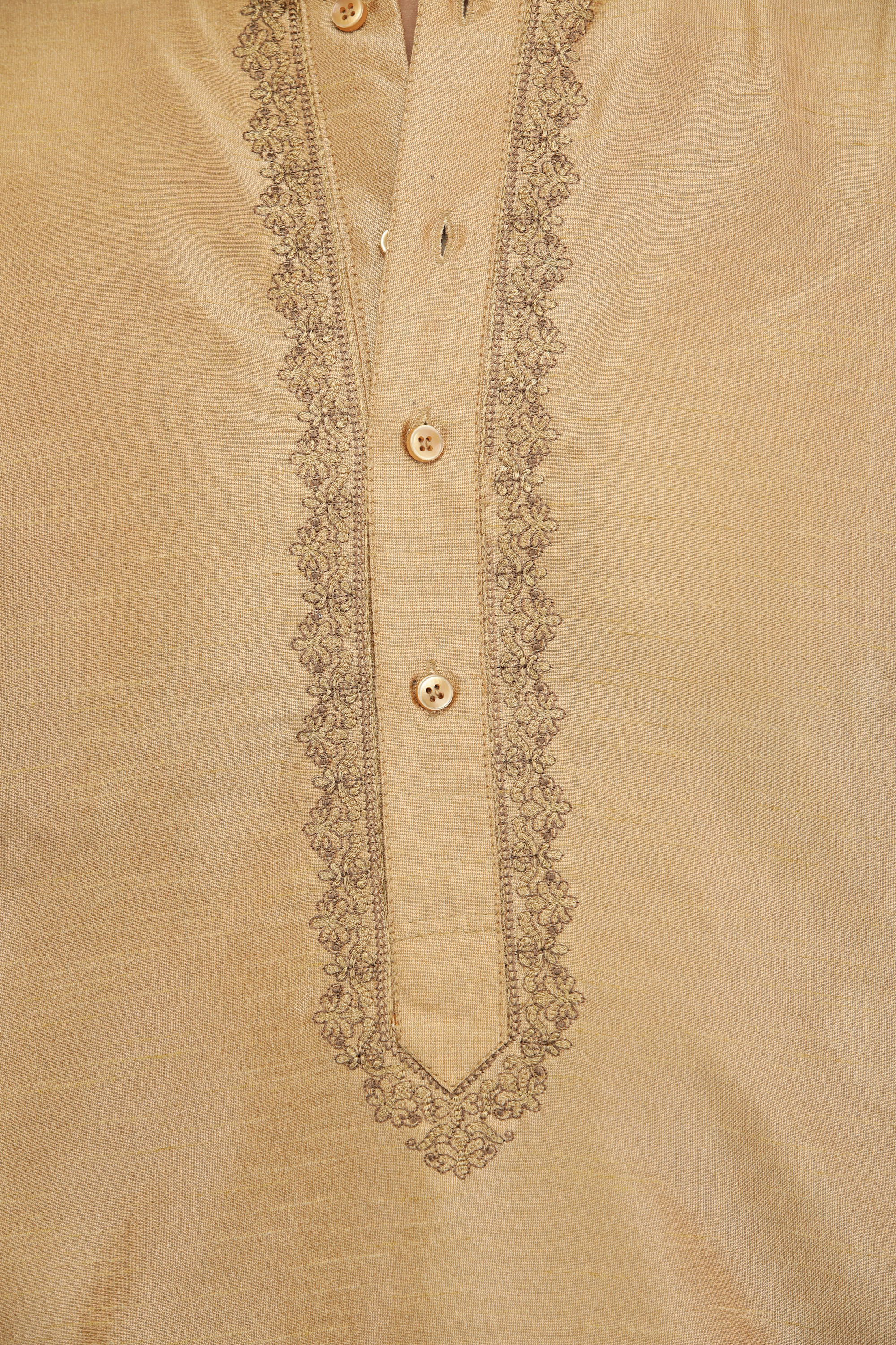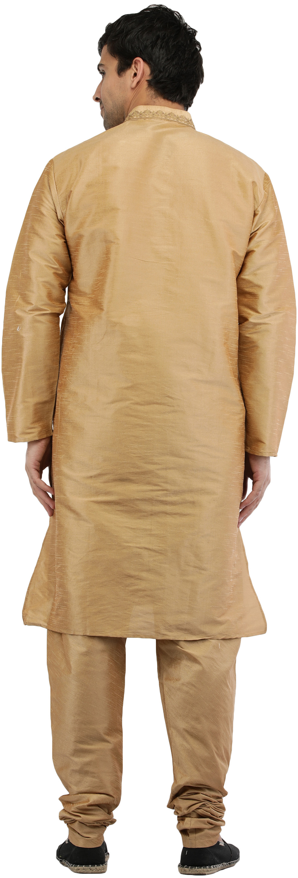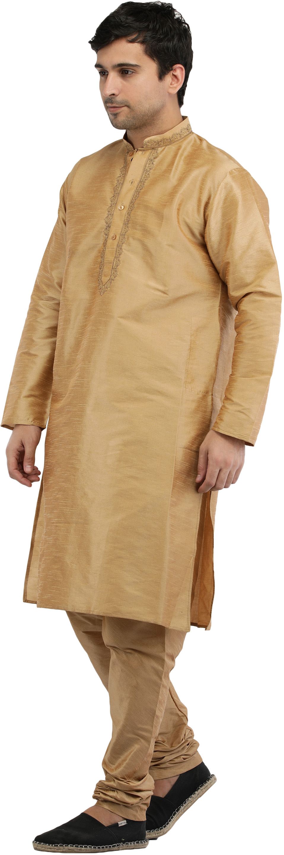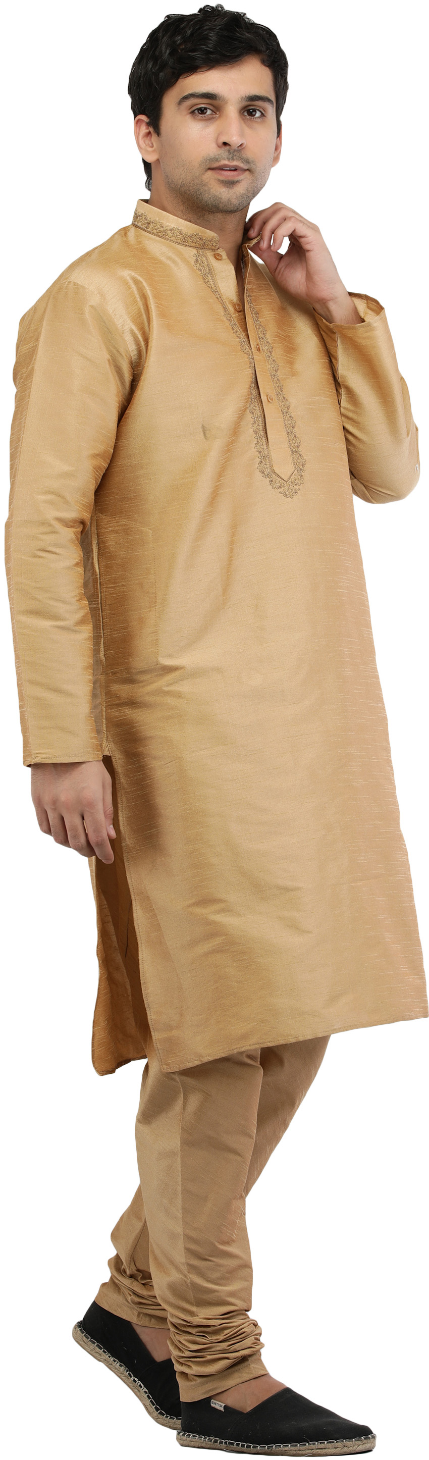 This kurta abounding in rare lustre has been crafted out of a textile length known as art-silk. Imitating silk-like texture, similar appearance and even same softness in touch as has a silk piece, art silk is also called imitation silk. The fabric used in manufacturing this kurta, otherwise, artificial synthetic fibre and economical substitute of real silk, both in initial cost is also in maintenance, manufactured with greater technical accomplishment obtaining the same look as genuine silk, is known in the textile industry as art silk as also imitation silk. Such synthetic art silk or imitation silk is made using rayon, mercerised cotton, polyester, a blend of these materials or just that of rayon and silk.