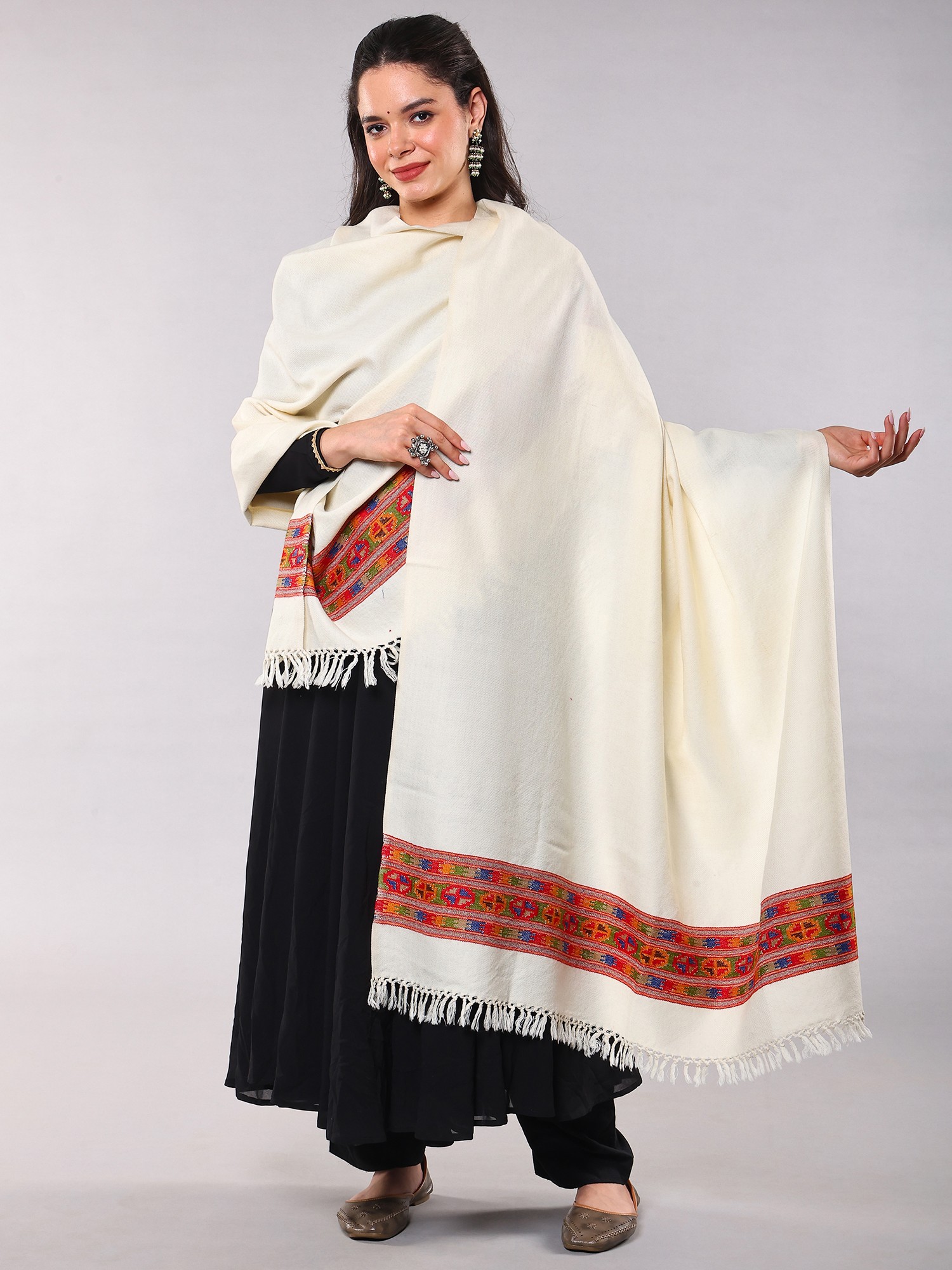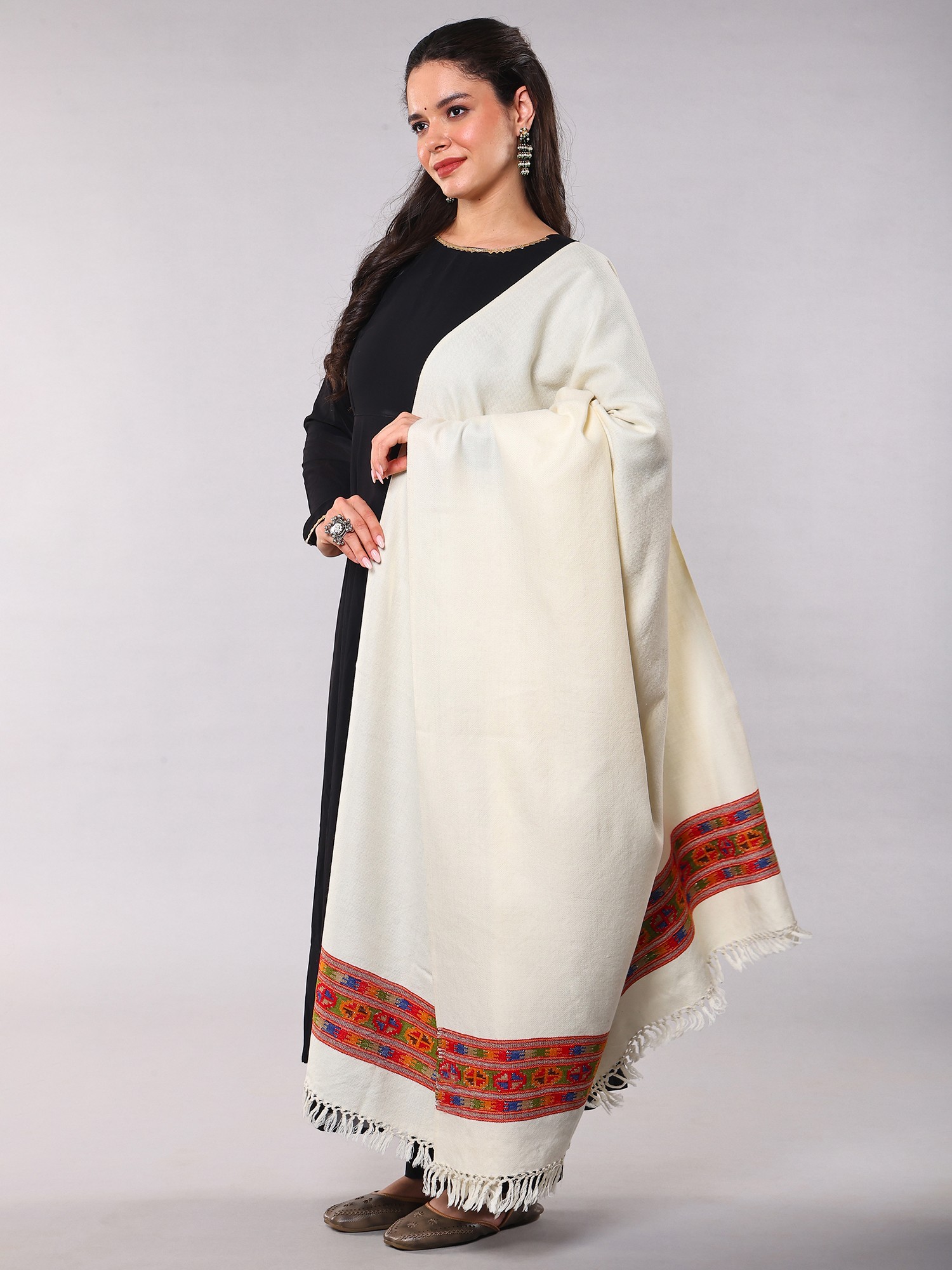Plain Yak Wool Shawl from Kullu with Multicolor woven Kinnauri Border
