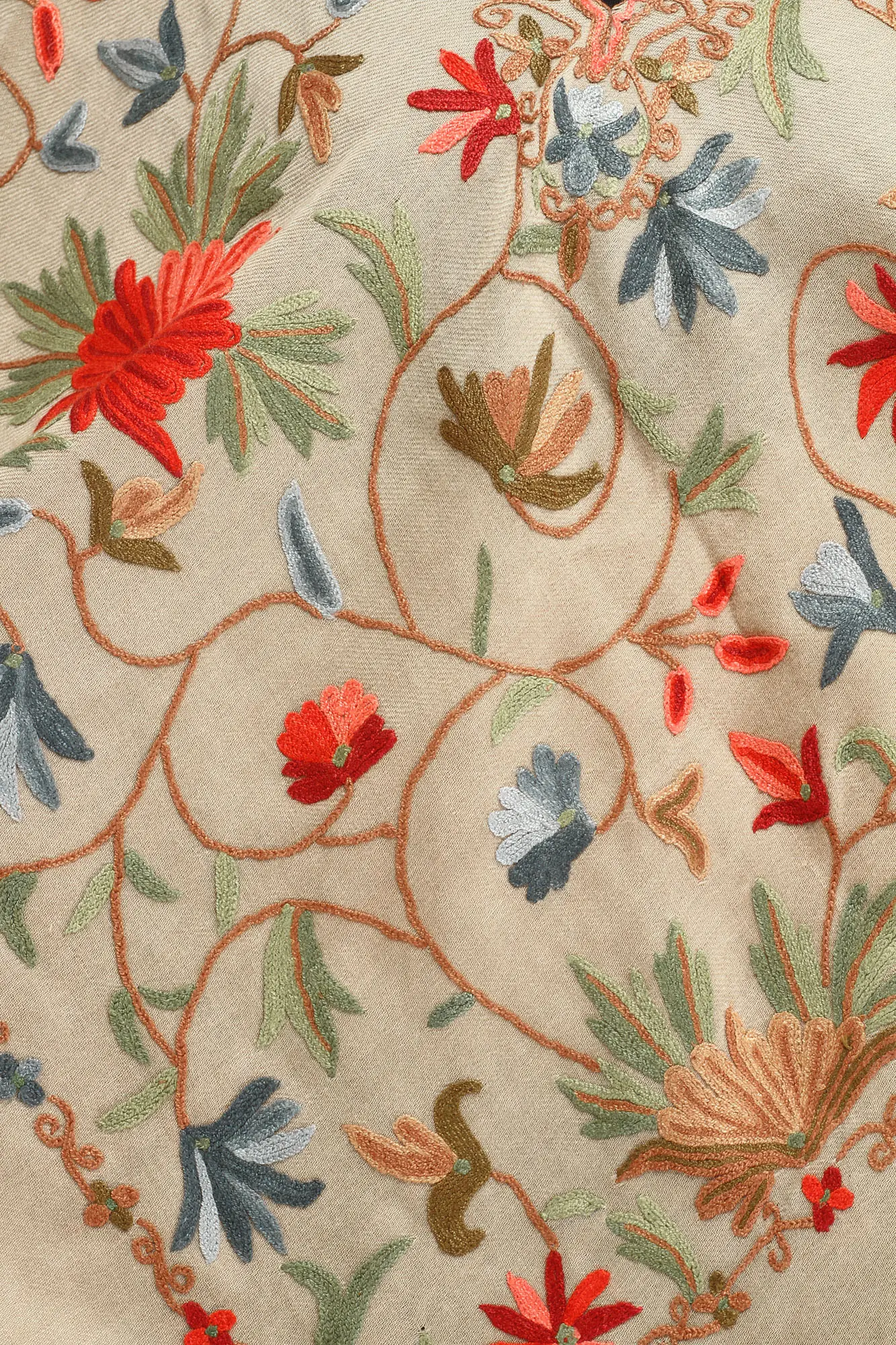 The true magic of this poncho lies in its breathtaking Aari hand-embroidery. Skilled artisans have meticulously stitched a mesmerizing pattern of flowers and delicate vine-like tendrils across the fabric. The embroidery features a captivating palette of colors, including vibrant reds, soft blues, earthy greens, and warm oranges, creating a visually stunning contrast against the taupe background. Each stitch is a tiny masterpiece, showcasing the dedication and artistry passed down through generations. The floral motifs are rendered with remarkable detail, appearing to bloom and flourish across the poncho, lending it an aura of natural beauty and sophisticated charm.