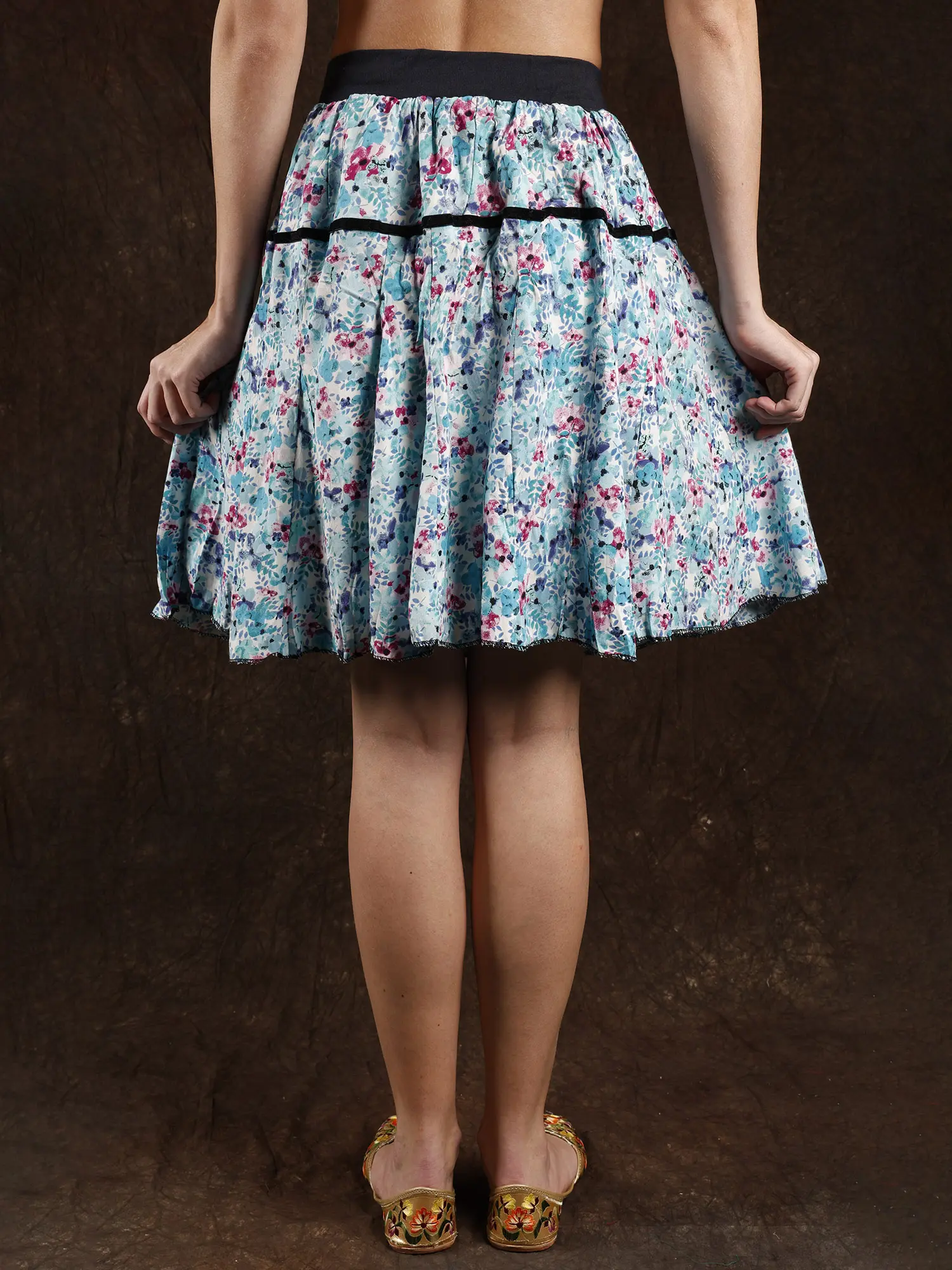 Peppy and young in its appeal, this cotton plume-blue short skirt is a stylish addition to your everyday wardrobe. The charming floral prints which are a classic element of Indian and world fashion, make the skirt a beautiful piece of clothing that comes with a comfy waistline and elastic so that you enjoy your day carrying an effortless floral flair.
