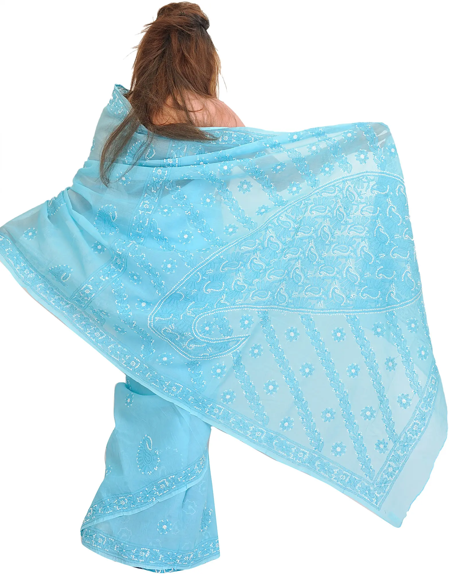 Egret-White Georgette Saree from Lucknow with Chikan Embroidered Paisleys by Hand