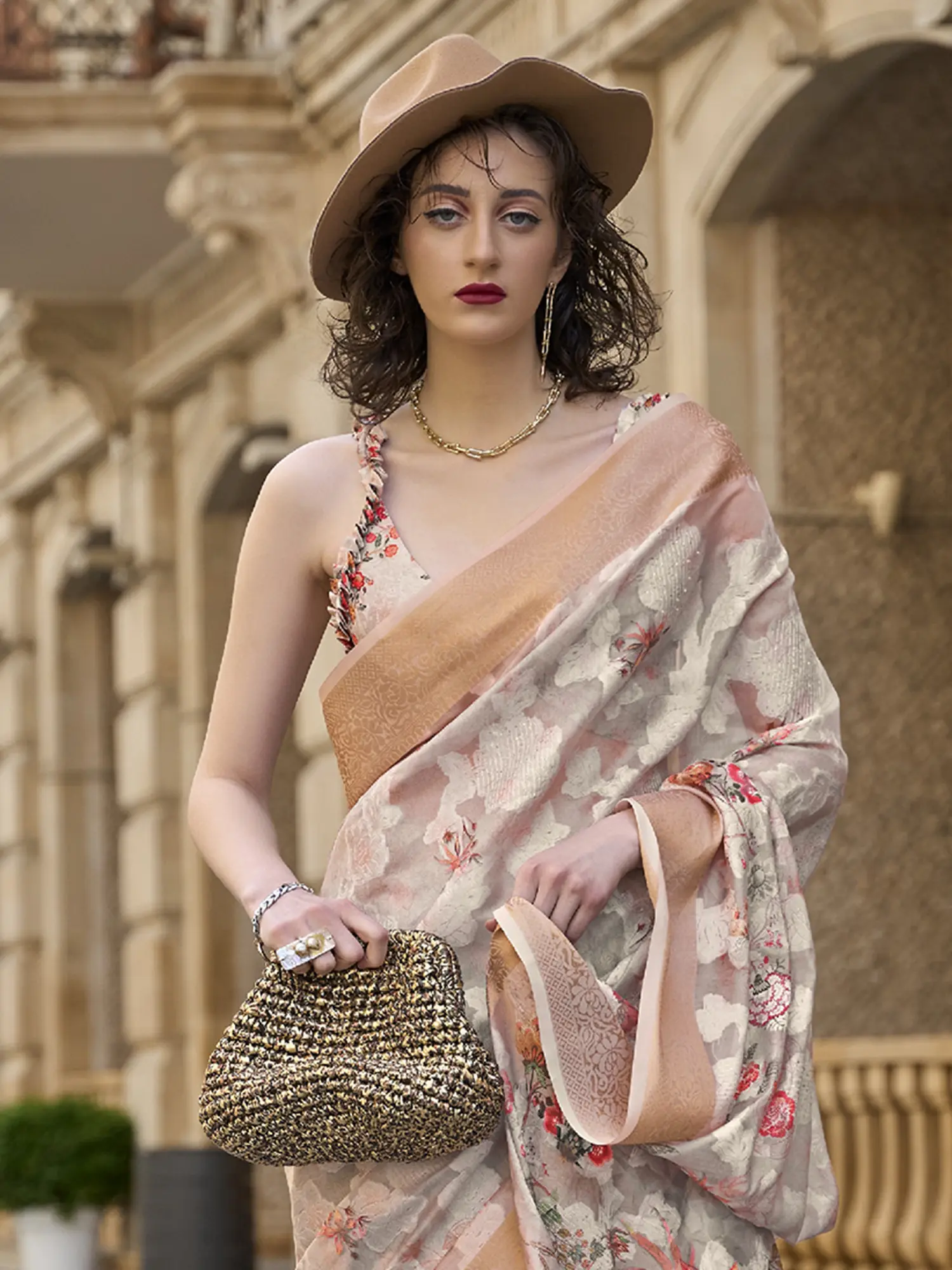 Immerse yourself in the artistry of traditional weaving with this exquisite saree, a true testament to skilled craftsmanship. The fabric, a delicate Poly Brasso, provides a canvas for a breathtaking floral print that seems to bloom with life. Each motif is rendered with a painterly touch, featuring soft petals and vibrant accents that evoke the charm of a secret garden. The subtle sheen of the Brasso weave catches the light, adding an understated elegance to the overall design. This is more than just a garment; it's a wearable piece of art that speaks of heritage and refined taste.