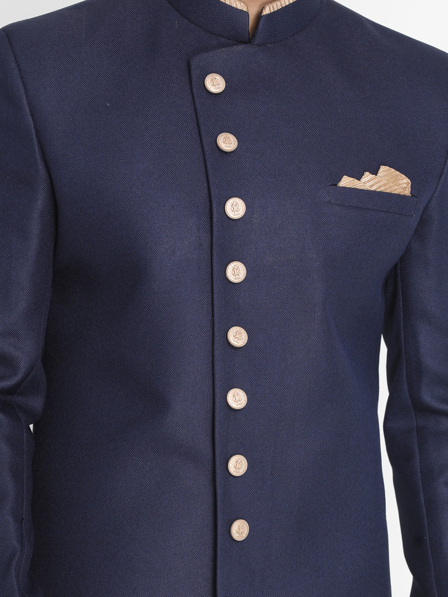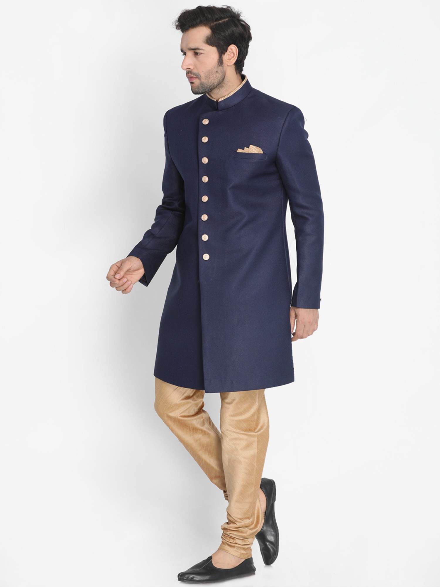 This resplendent Polyester Lurex Blend Indo-Western Style Sherwani paired with a Silk Blend Churidar Pajama – a harmonious union of contemporary flair and traditional elegance. Crafted with meticulous attention to detail, the sherwani features a luxurious polyester lurex blend fabric that exudes sophistication and opulence. Its Indo-Western style seamlessly blends modern trends with timeless charm, making it the perfect choice for special occasions.