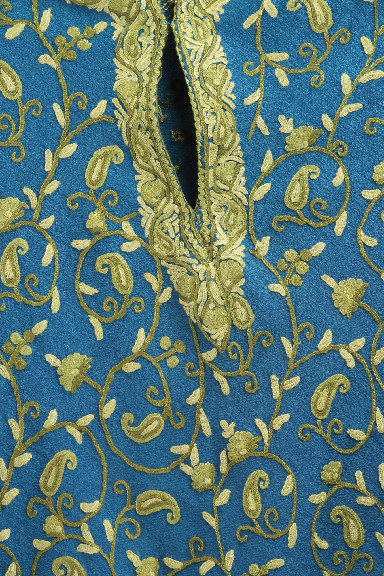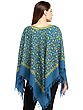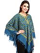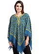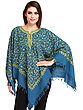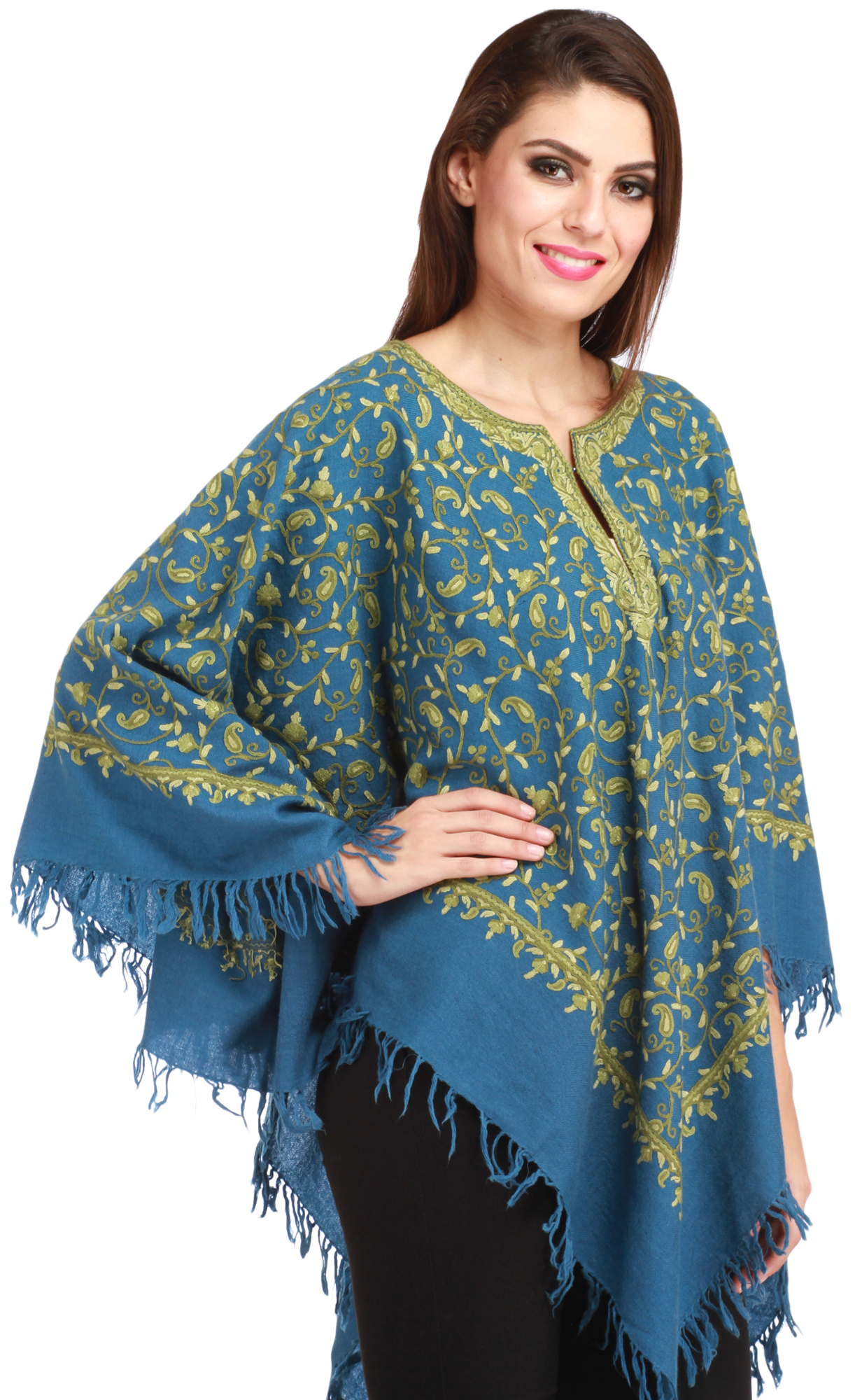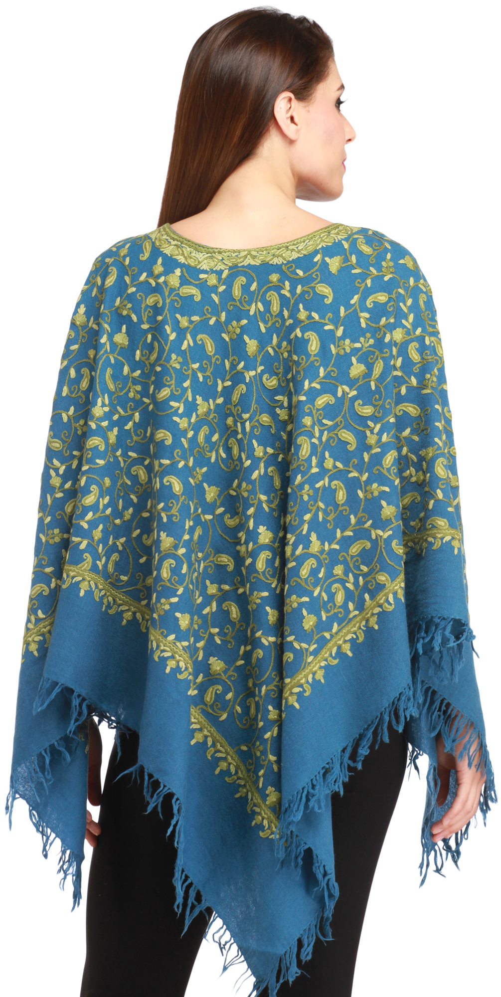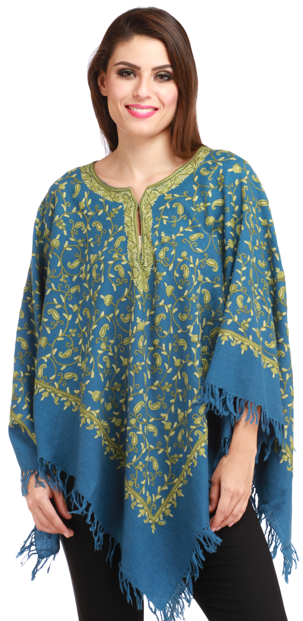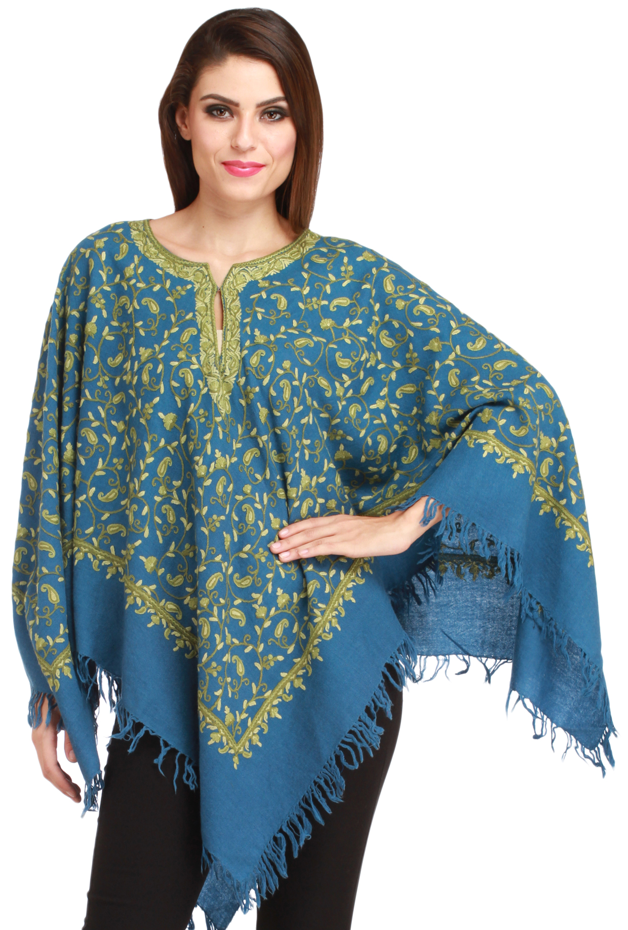 A poncho is an outer garment traditionally used to keep the body warm and safe from rain and wind, but now it is popularly designed as a fashion statement. Earlier it was worn majorly as a South American culture garment, but now its style is recognized and followed worldwide. Like the one shown here, ponchos are a single large sheet of fabric with a hole in the center for the head and the remaining part is open and is let loose to fall for easy breathing and comfort. The two-color choices you see here are woven on a pure woolen fabric and hand-embroidered in ari style by expert weavers from Kashmir in a dense pattern of flowers, paisleys, and vines.