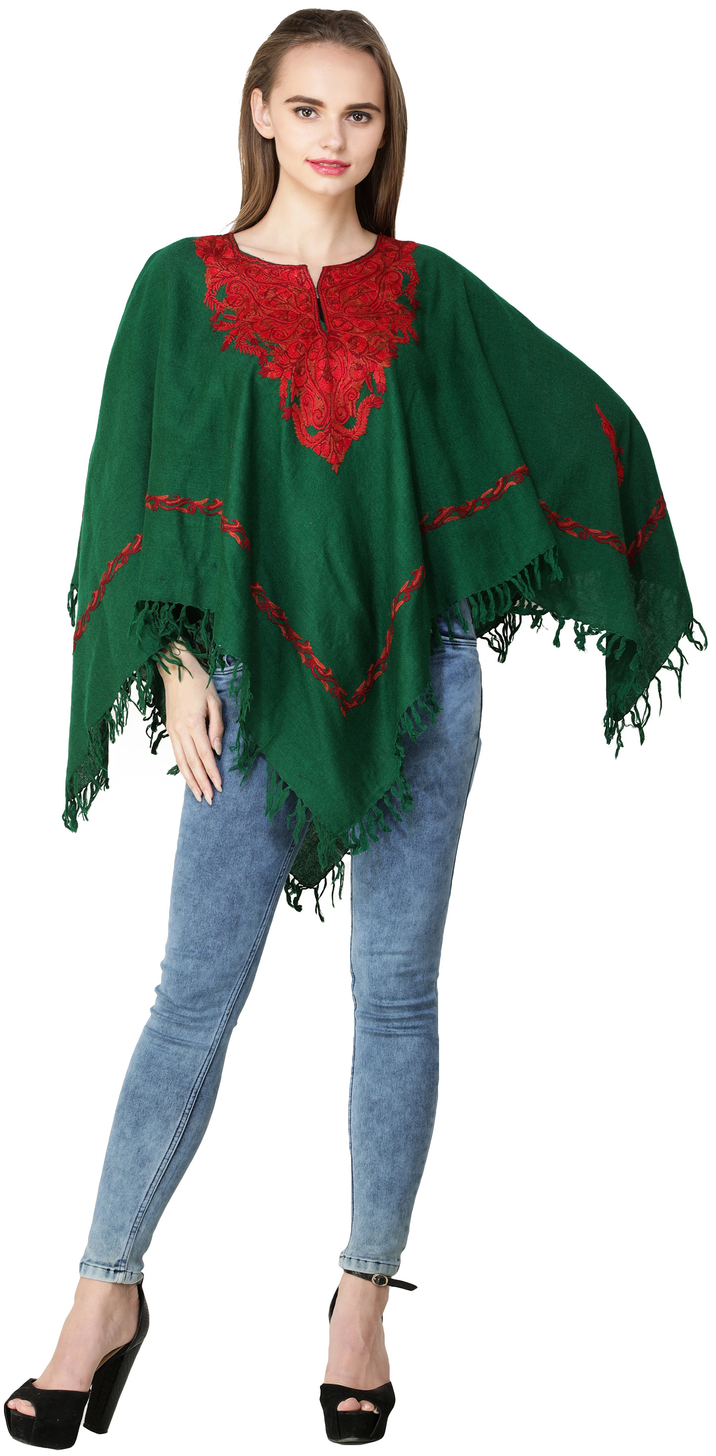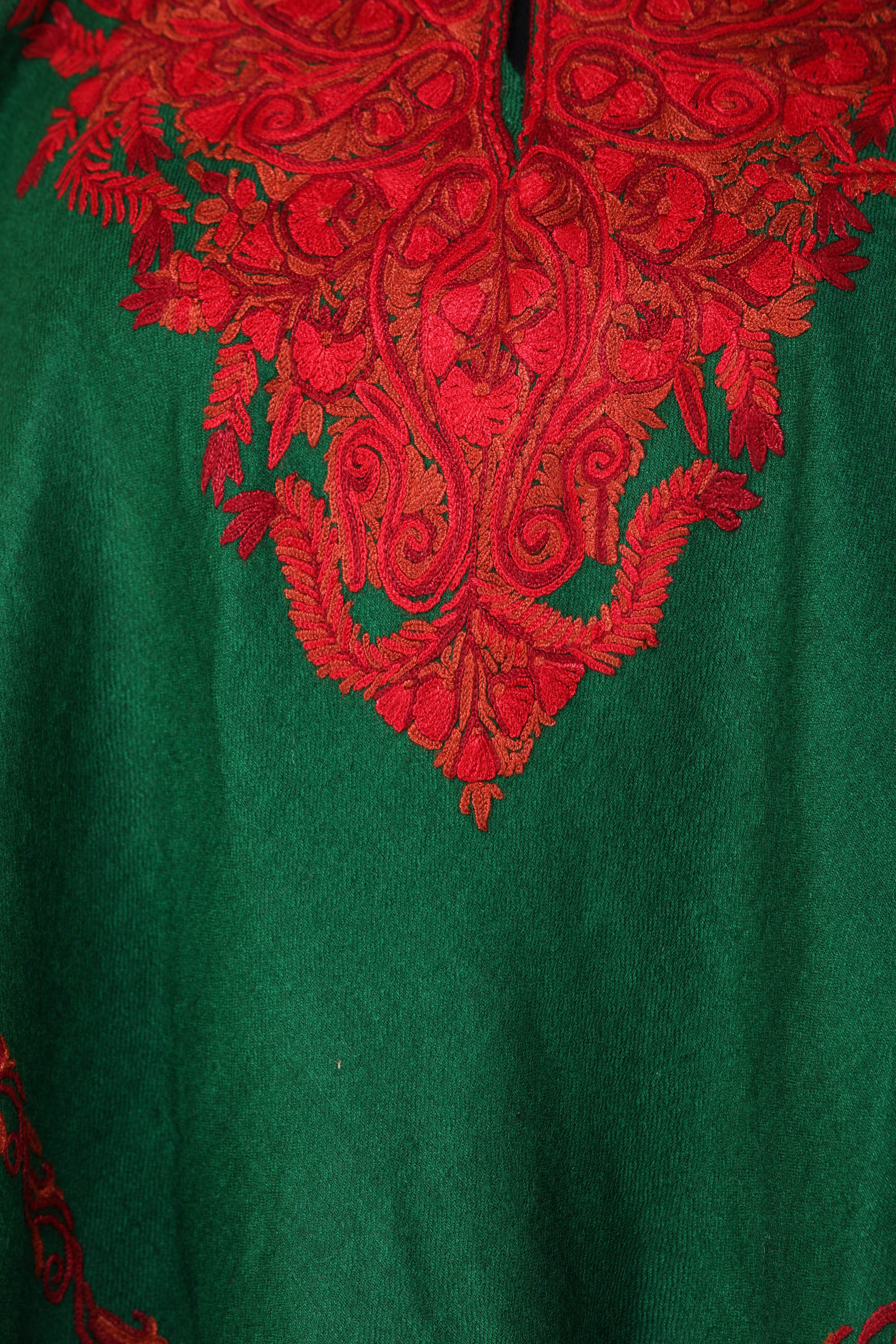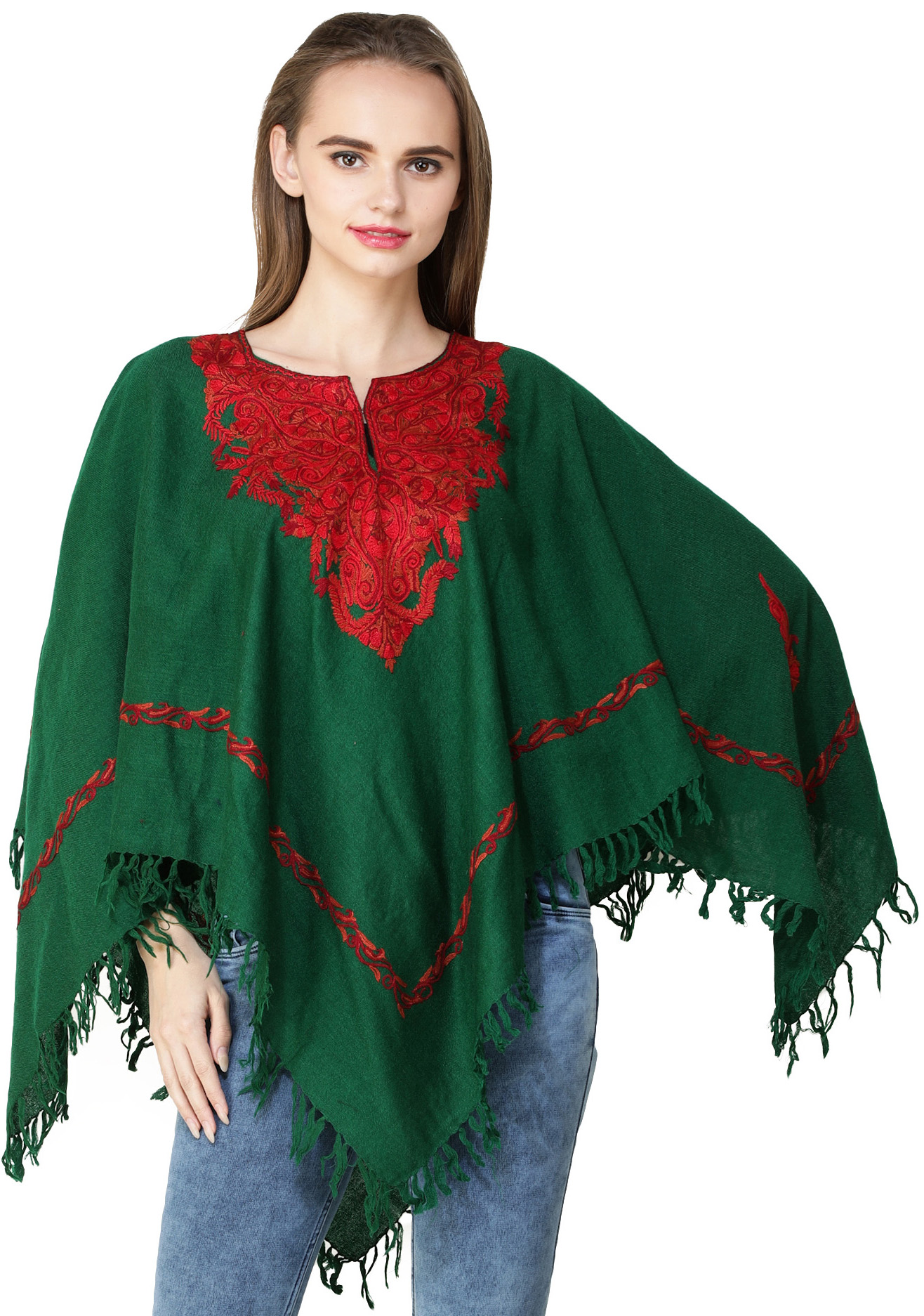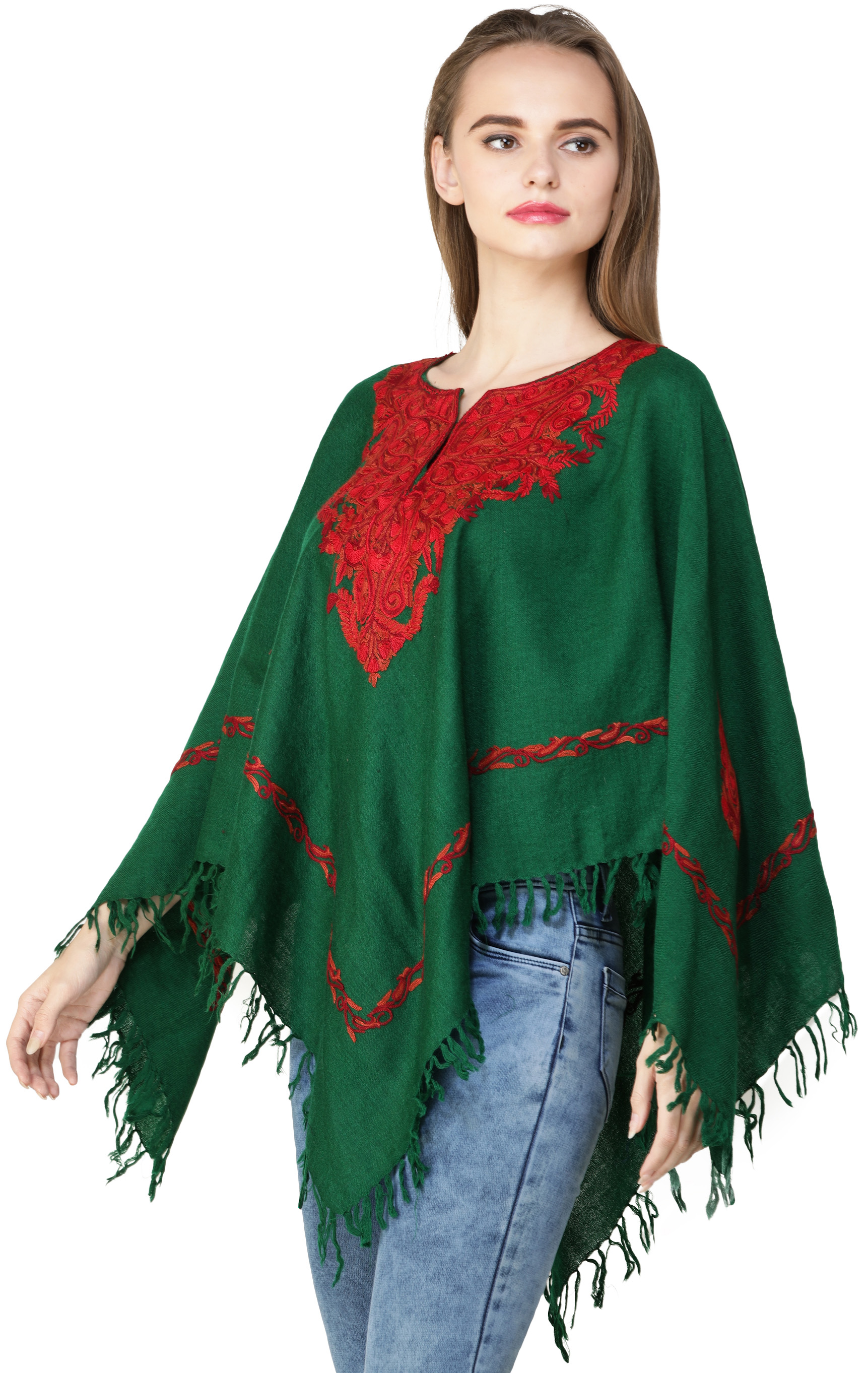 Drape yourself in the timeless charm of this Kashmiri Poncho featuring intricate Aari hand-embroidered paisleys adorning the neckline. This simple weaved poncho is fashioned with raveled Aari embroidery precisely on the borders and neck area. The superlative paisley motifs are rendered with meticulous work, with an artistic touch to this stylish piece.
