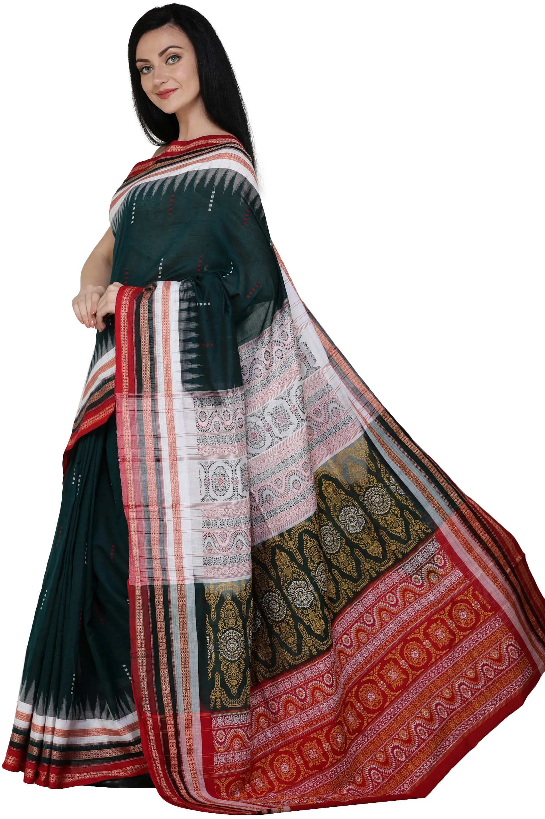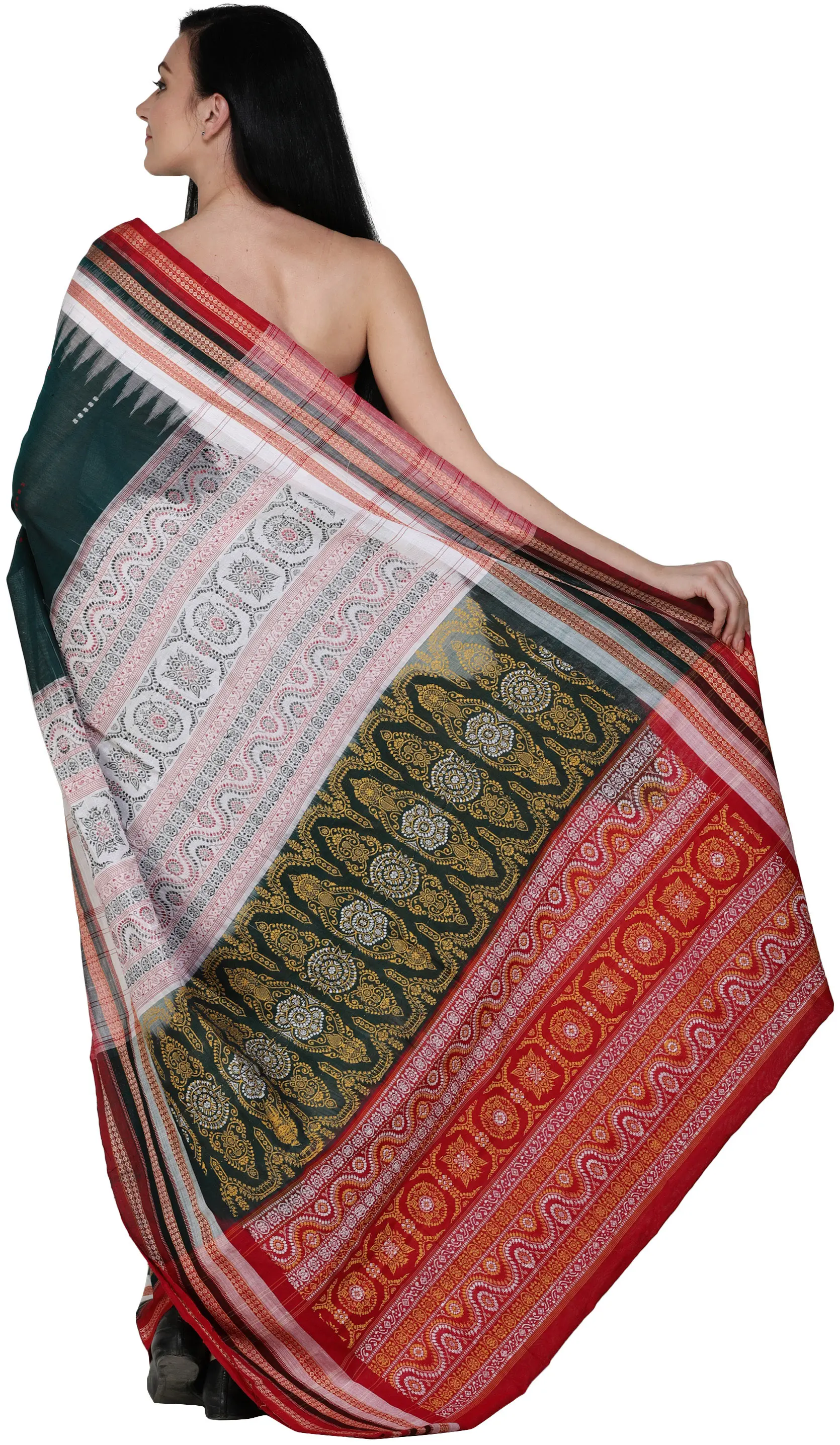 Immerse yourself in the rich textile heritage of India with this exquisite handloom sari, a masterpiece from the heart of Orissa. Crafted from pure, breathable cotton, this sari embodies the traditional artistry and meticulous craftsmanship that has been passed down through generations. Its deep, Ponderosa-pine hue forms a striking backdrop for the intricate woven motifs, creating a garment that is both sophisticated and deeply rooted in cultural tradition.