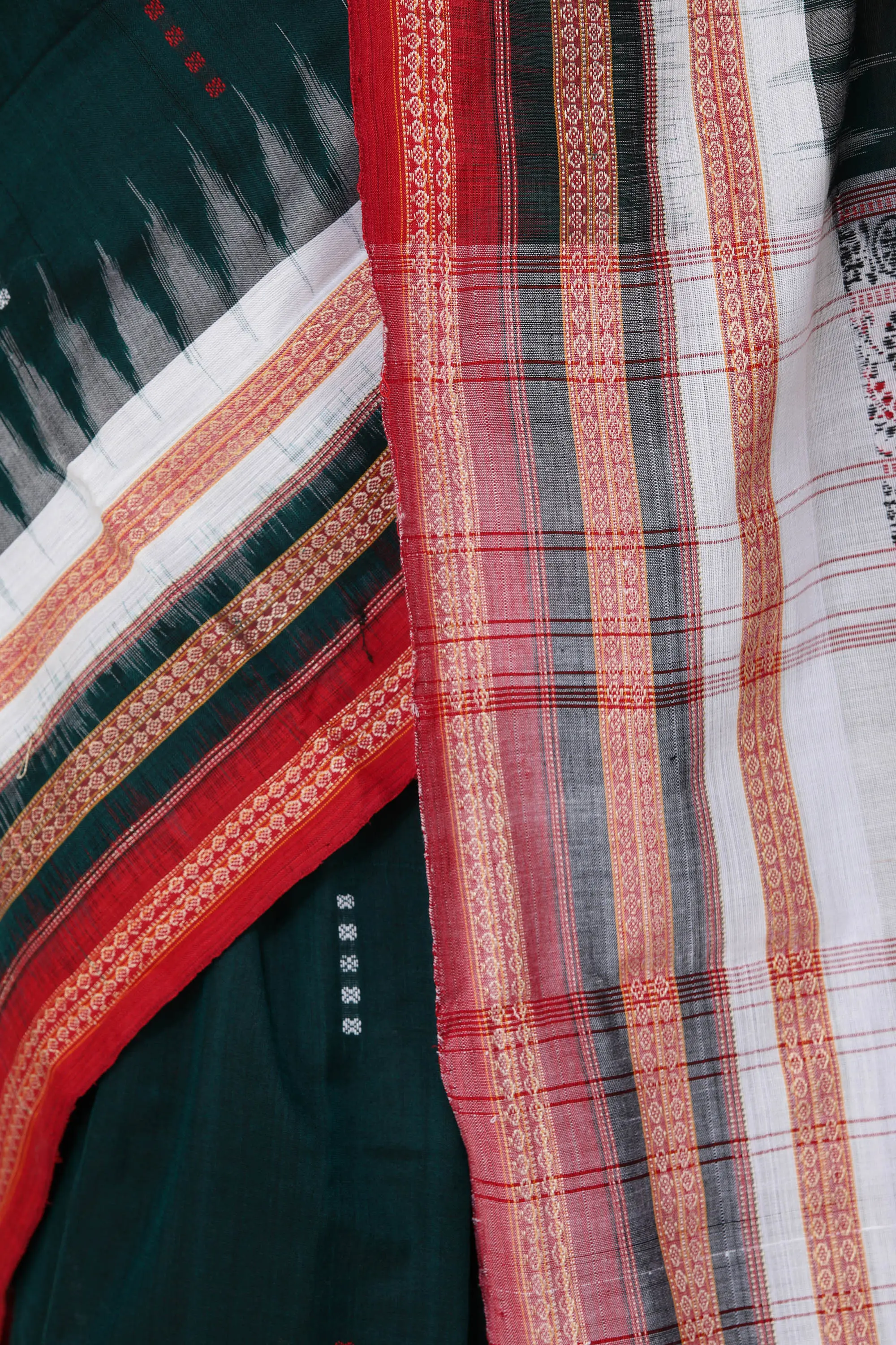 The beauty of this sari lies in its breathtaking details. Adorning the border and the pallu, you'll find delicately woven bootis, small, exquisite patterns that showcase the weaver's skill. These bootis, rendered in contrasting threads, create a captivating visual rhythm against the deep green fabric. The border features a vibrant interplay of red, white, and gold threads, interspersed with a sharp, zigzag ikat pattern, adding a dynamic edge. The pallu unfolds a story of traditional motifs, meticulously woven to create a stunning focal point that will undoubtedly draw admiring glances. Each thread is placed with precision, transforming the sari into a wearable work of art.