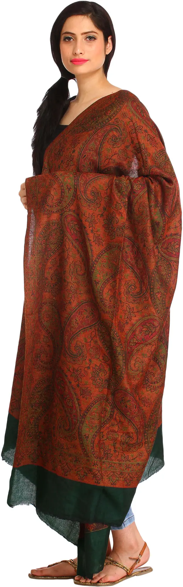 Adding to its exceptional value, this shawl features a reversible design. One side showcases the full glory of the intricately woven paisleys, while the reverse offers a striking contrast with a solid, deep border. This duality in design means you can effortlessly switch up your look, tailoring the shawl to complement different outfits and moods. The rich, solid border provides a clean, grounding element that enhances the vibrancy of the paisley pattern, offering two distinct yet equally stunning ways to wear this beautiful piece.