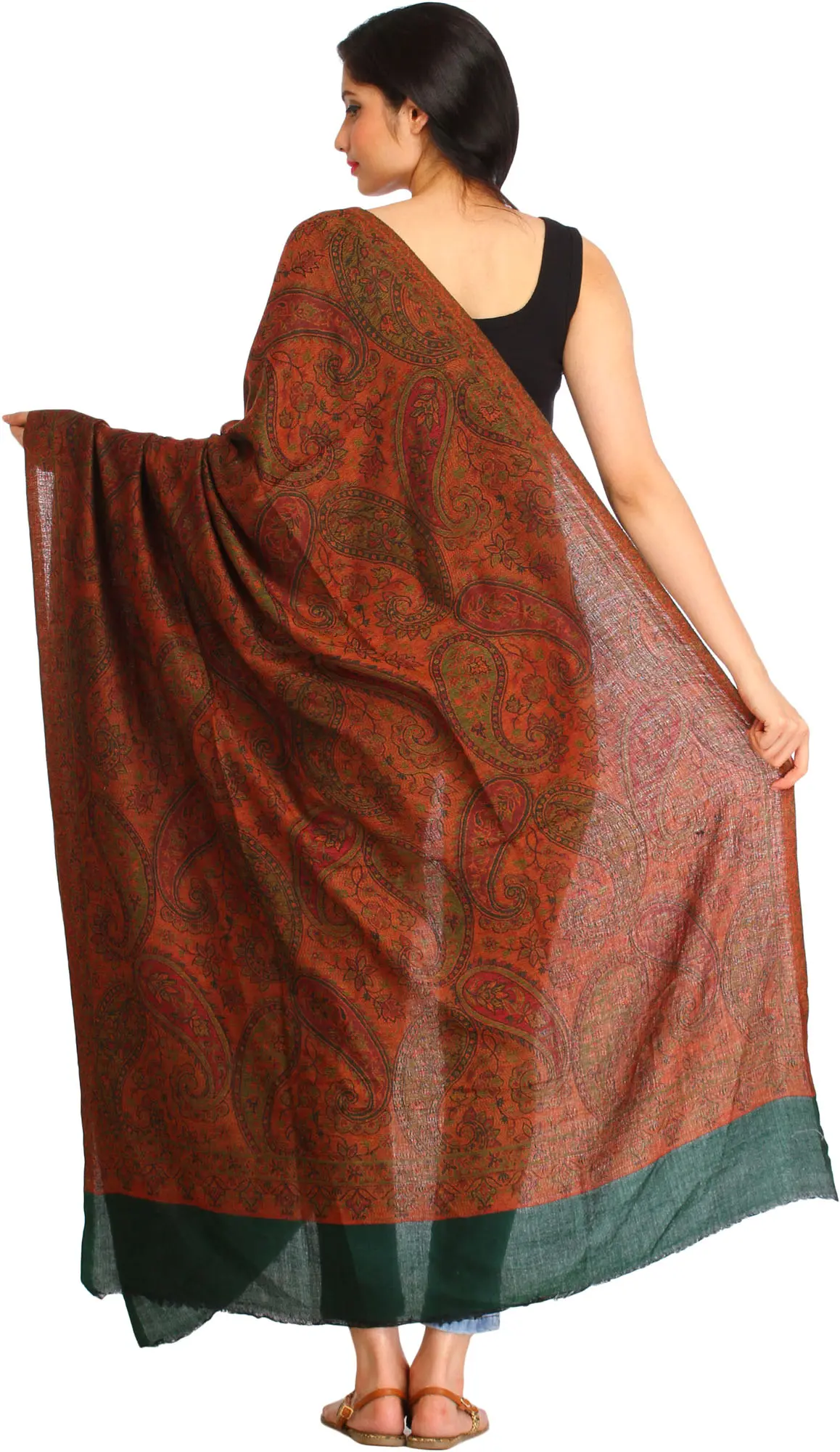 The true artistry of this shawl lies in its captivating design. The main body of the shawl is adorned with a rich tapestry of woven paisleys, a classic motif renowned for its intricate beauty and timeless appeal. The warm, earthy tones of the paisleys create a visually stunning effect, evoking a sense of tradition and natural beauty. The subtle interplay of colors within the paisley pattern adds depth and dimension, ensuring that this shawl will be a conversation starter wherever you go.