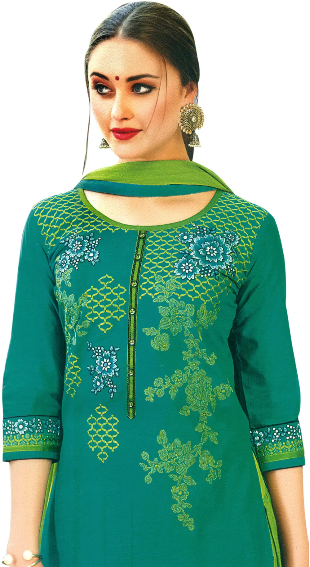 The accompanying Patiala salwar embodies the quintessential Indian silhouette, renowned for its comfort and voluminous grace. Crafted in a lively lime green that beautifully complements the kameez, the salwar features a subtle, all-over scattering of small, dark green star-like motifs, adding a playful texture and depth to the design. The ample pleats and gathered waist ensure a flattering drape, offering both freedom of movement and a chic, traditional look. Completing this captivating ensemble is a flowing chiffon dupatta. In a matching shade of vibrant lime green, this lightweight dupatta drapes effortlessly, adding an ethereal touch to the outfit. It is finished with a slender, contrasting porcelain-green border that seamlessly ties the entire look together. This chiffon dupatta provides a delicate layer of sophistication and can be styled in numerous ways to suit your personal preference. This Patiala suit is more than just an outfit; it's an expression of style, tradition, and the joy of dressing up. The breathable cotton fabric ensures comfort throughout the day, making it a practical yet stunning choice for any discerning wardrobe.