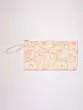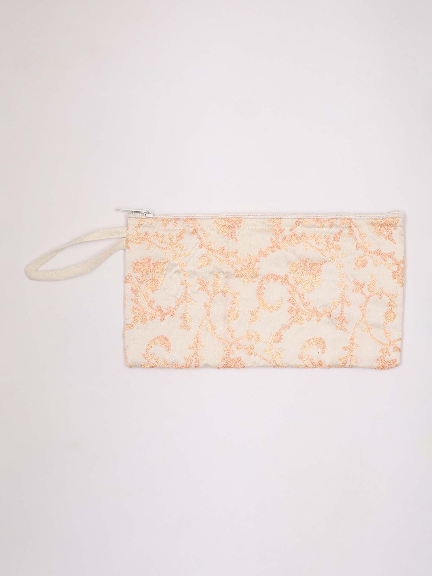 The vibrant hue serves as a perfect backdrop for the delicate, swirling vine patterns and paisley motifs, rendered in shimmering gold and subtle sky blue threads. A secure zipper closure, subtly integrated along the top, promises to safeguard your valuables with ease. Its compact dimensions, measuring nine inches in length and five inches in width, make it the ideal size for carrying your essentials without bulk. A slender wrist strap allows for effortless portability, adding a practical flourish to its design.