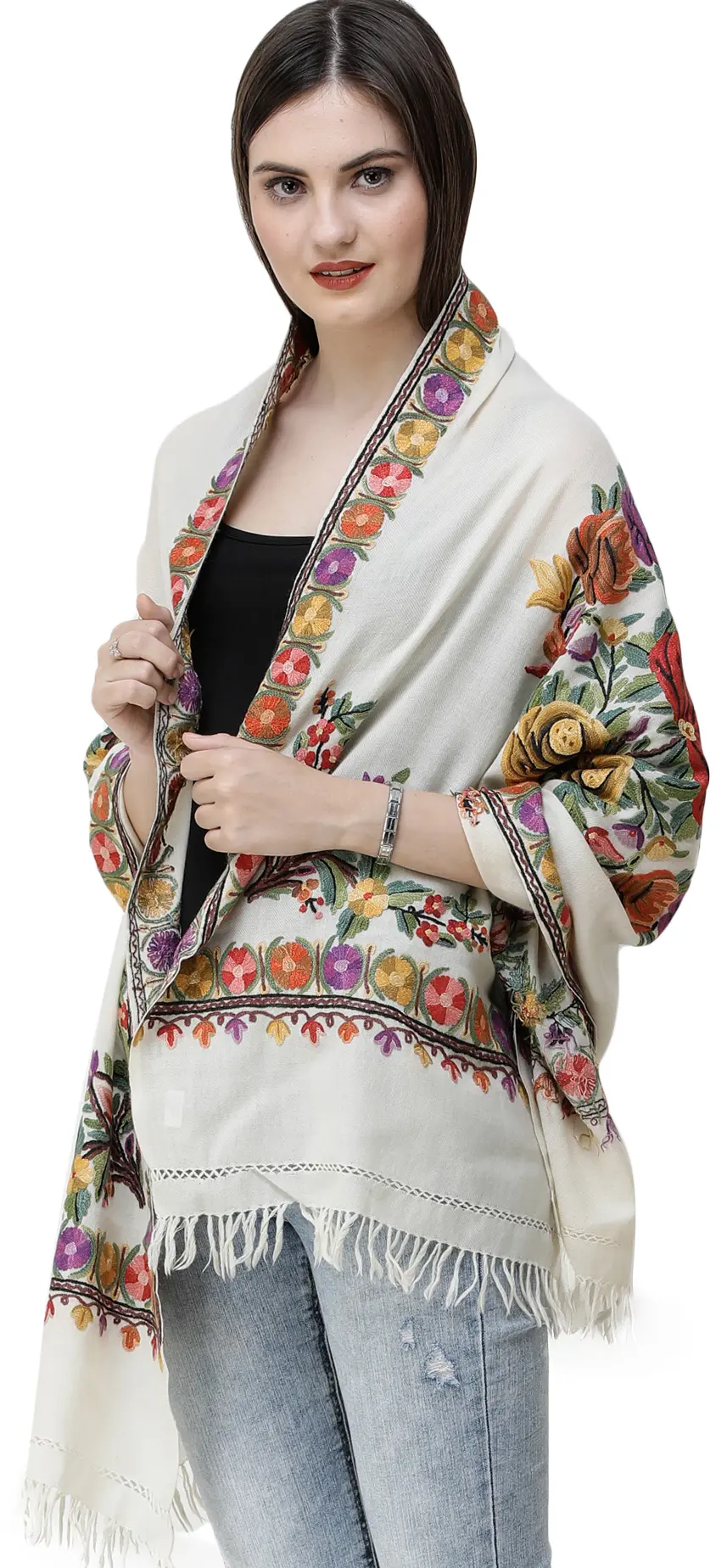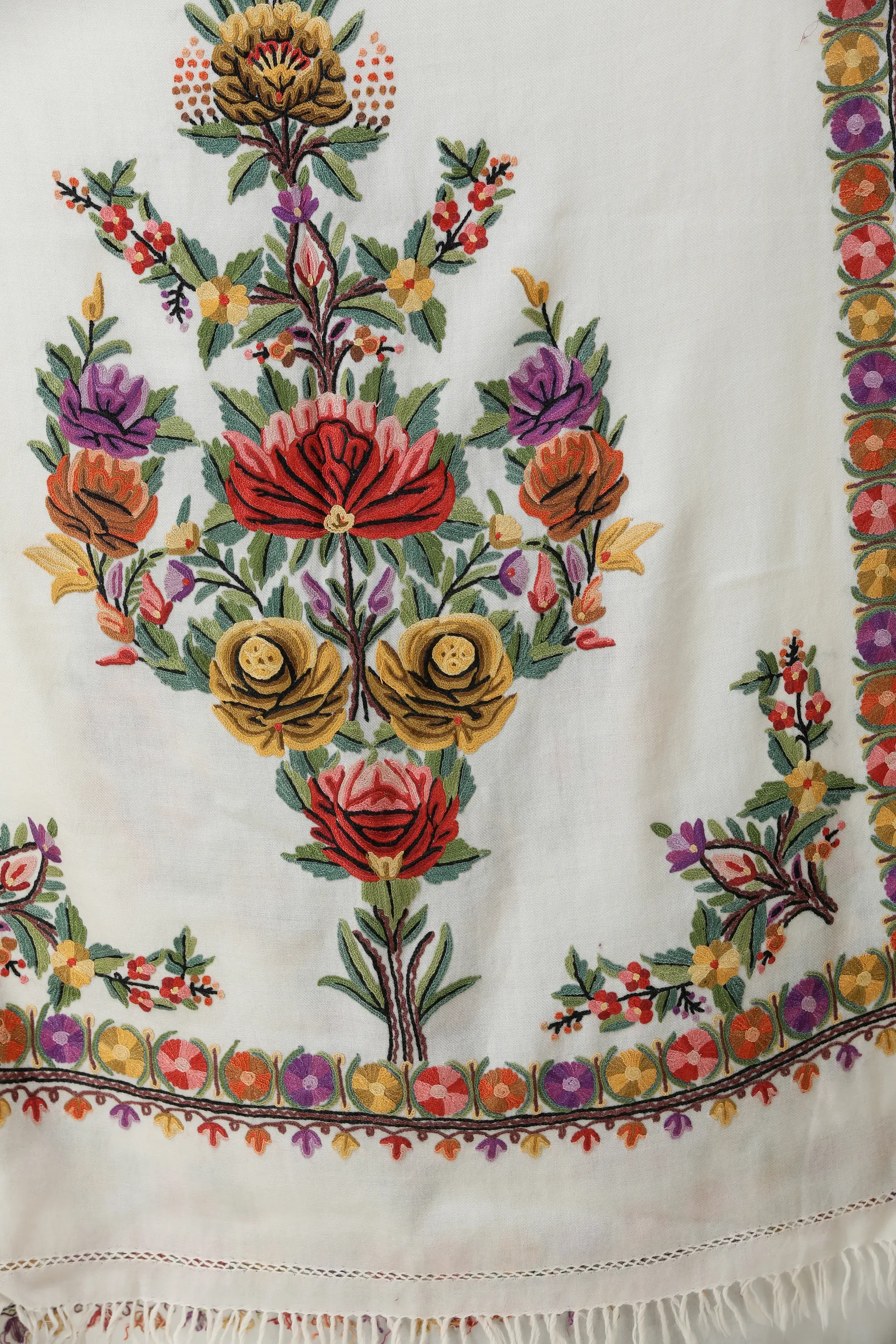 Experience the exquisite craftsmanship of Kashmir with this stunning stole, a true testament to the region's rich heritage of textile artistry. Crafted from the finest pure wool, this stole offers unparalleled softness and warmth, making it a luxurious addition to any wardrobe. The natural cream hue of the wool provides a perfect backdrop for the vibrant and intricate embroidery that adorns its entirety.