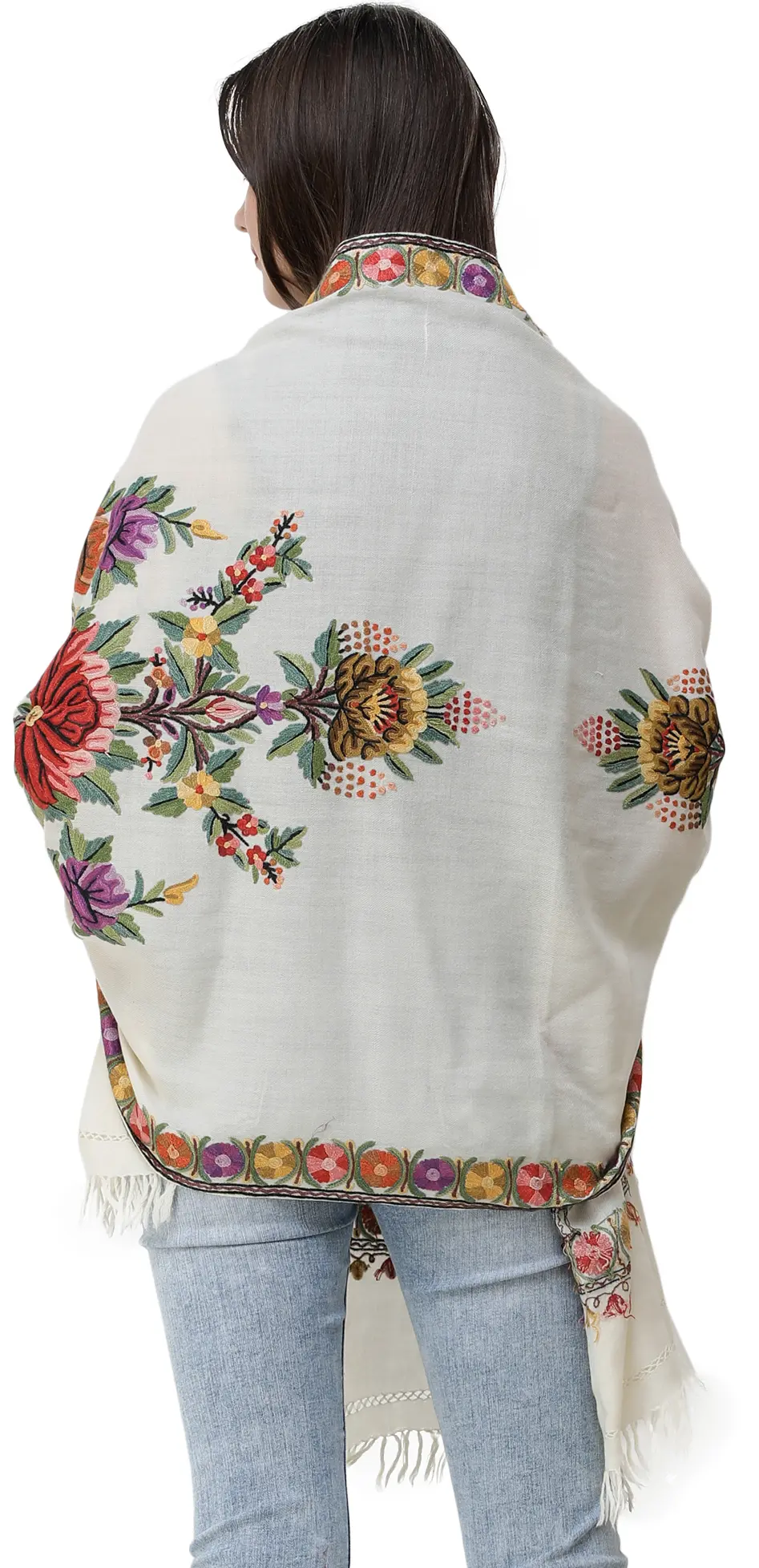 Ivory Pure Pashmina Shawl from Kashmir with Sozni-Embroidery by Hand