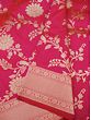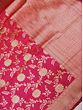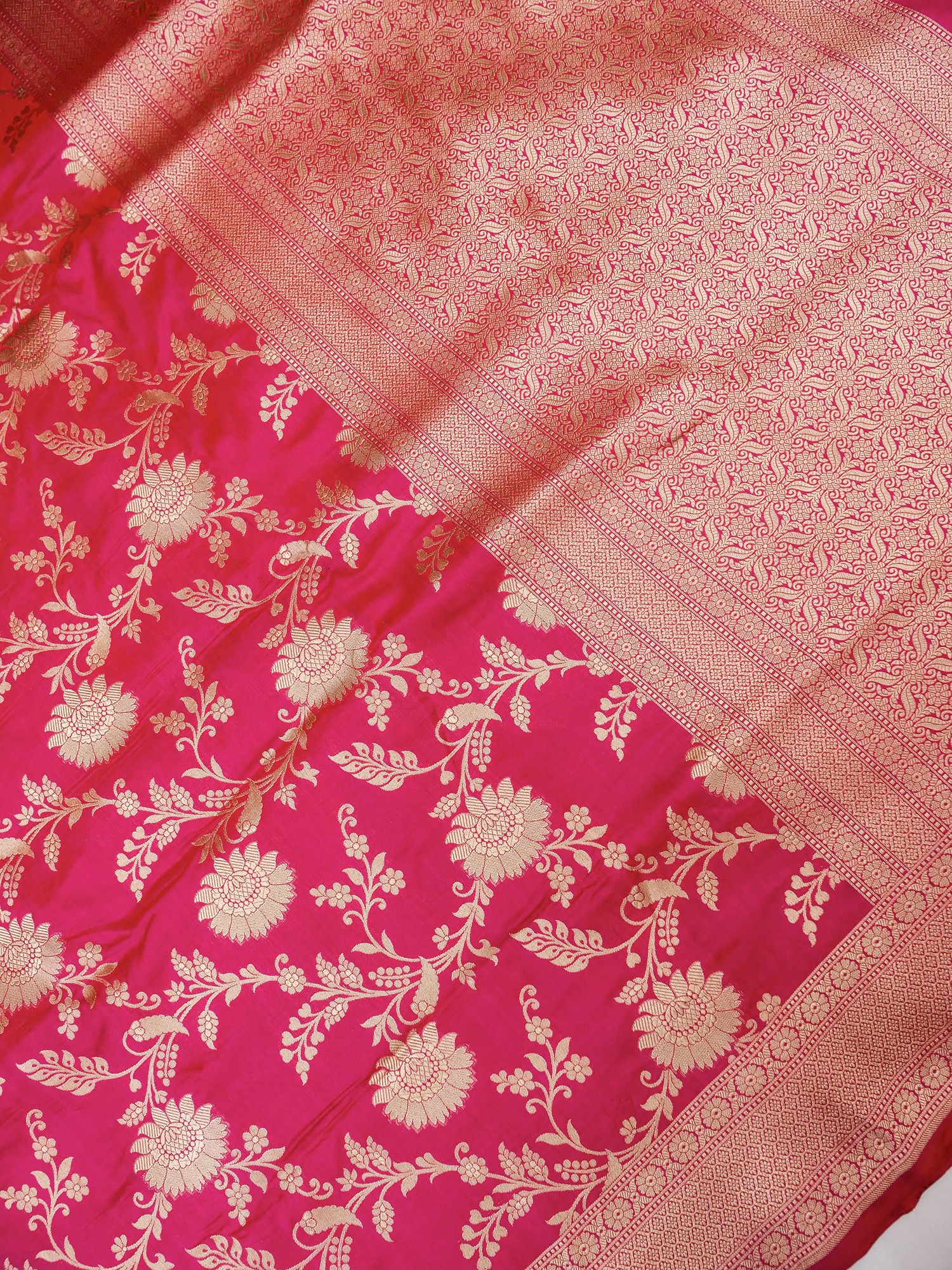 For the queen in you who doesn’t shy away from celebrating her femininity and grace, this brilliant pink Banarasi silk saree is the right choice. With the use of the traditional bel motif, associated in India with the idea of fertility and wealth, the sari is turned into an auspicious piece of traditional Indian clothing. A web of blooming vines on the body of the sari has given it an appealing exquisiteness while the border and the pallu are sheathed in tiny flowers that take us to the exotic fragrant Bagh (gardens).