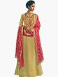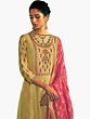 Down the bust is a plethora of flowers and vines, embroidered using the ariwork technique. Indian fashion connoisseurs would instantly recognise the endemic crewel-work of the Kashmir region, an unparalleled statement in femininity and wearable heritage. The deep velvety pink dupatta is printed with complementary motifs in a cheerful yellow hue. The colour of its embroidered edges goes with the kameez. Depending on the mood of the jewellery you team this with, this dress could be a great evening number or the perfect pick for a daytime gathering.