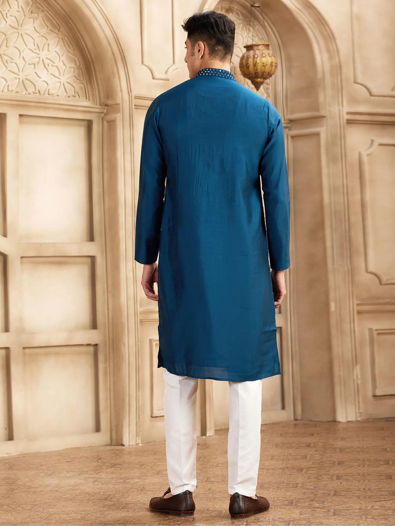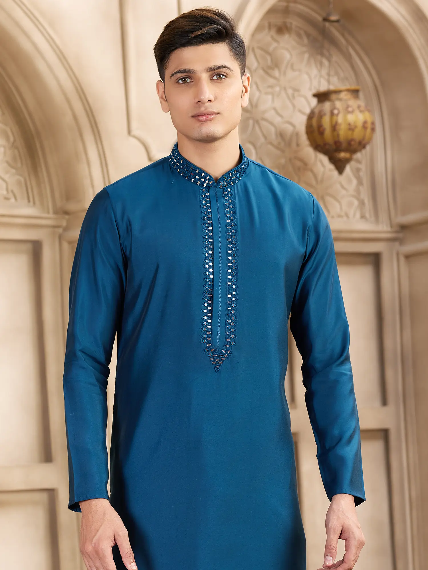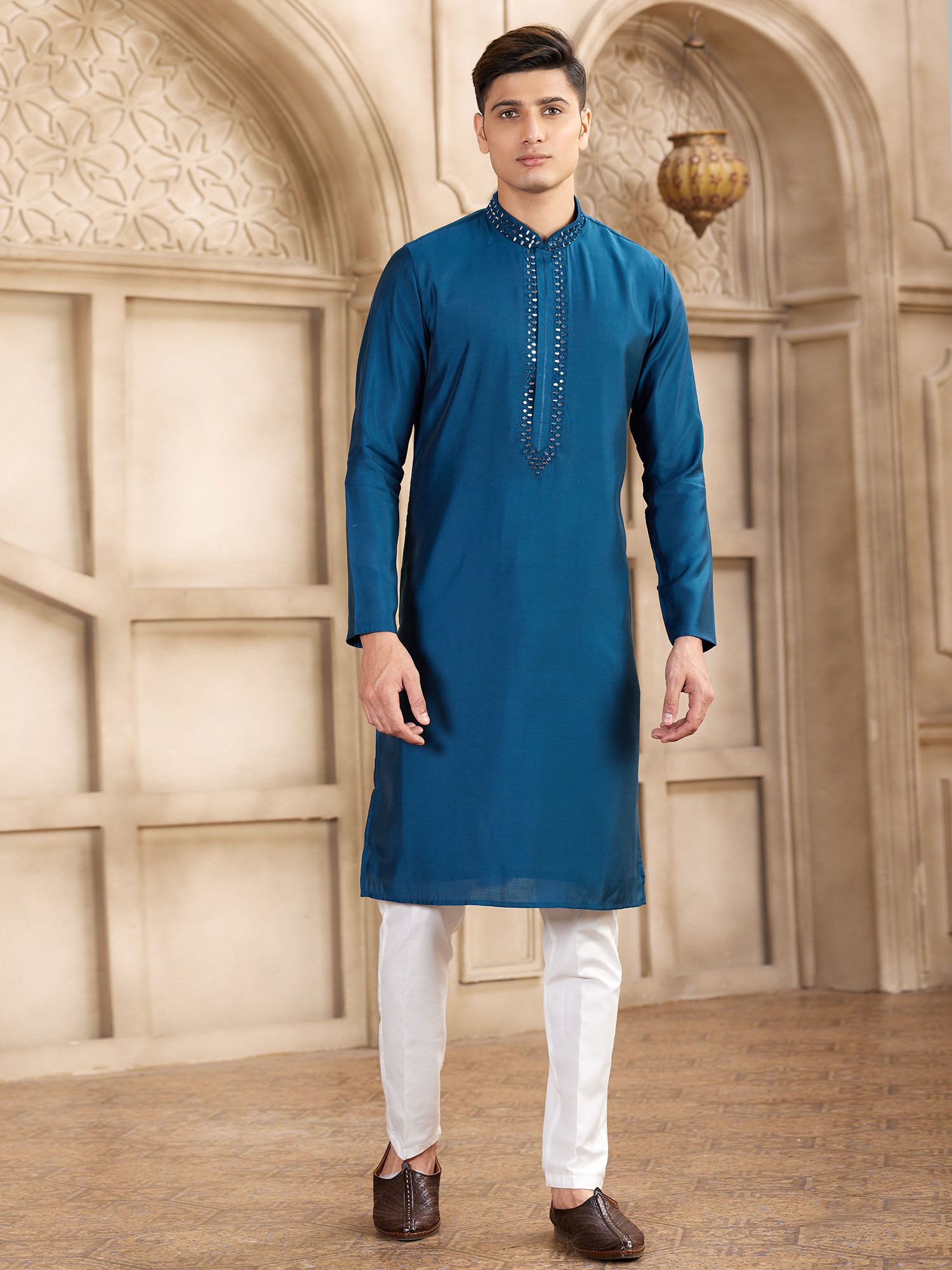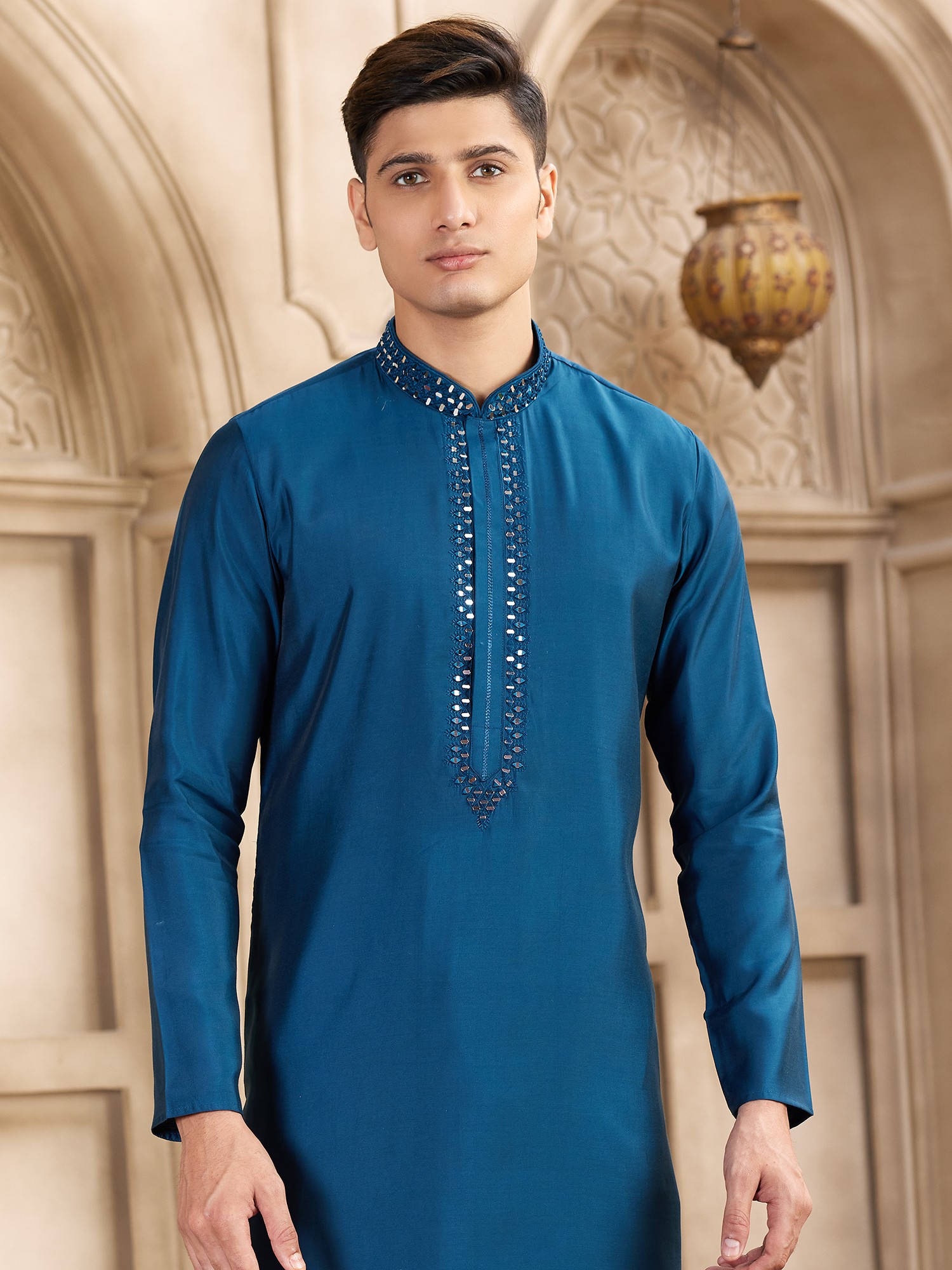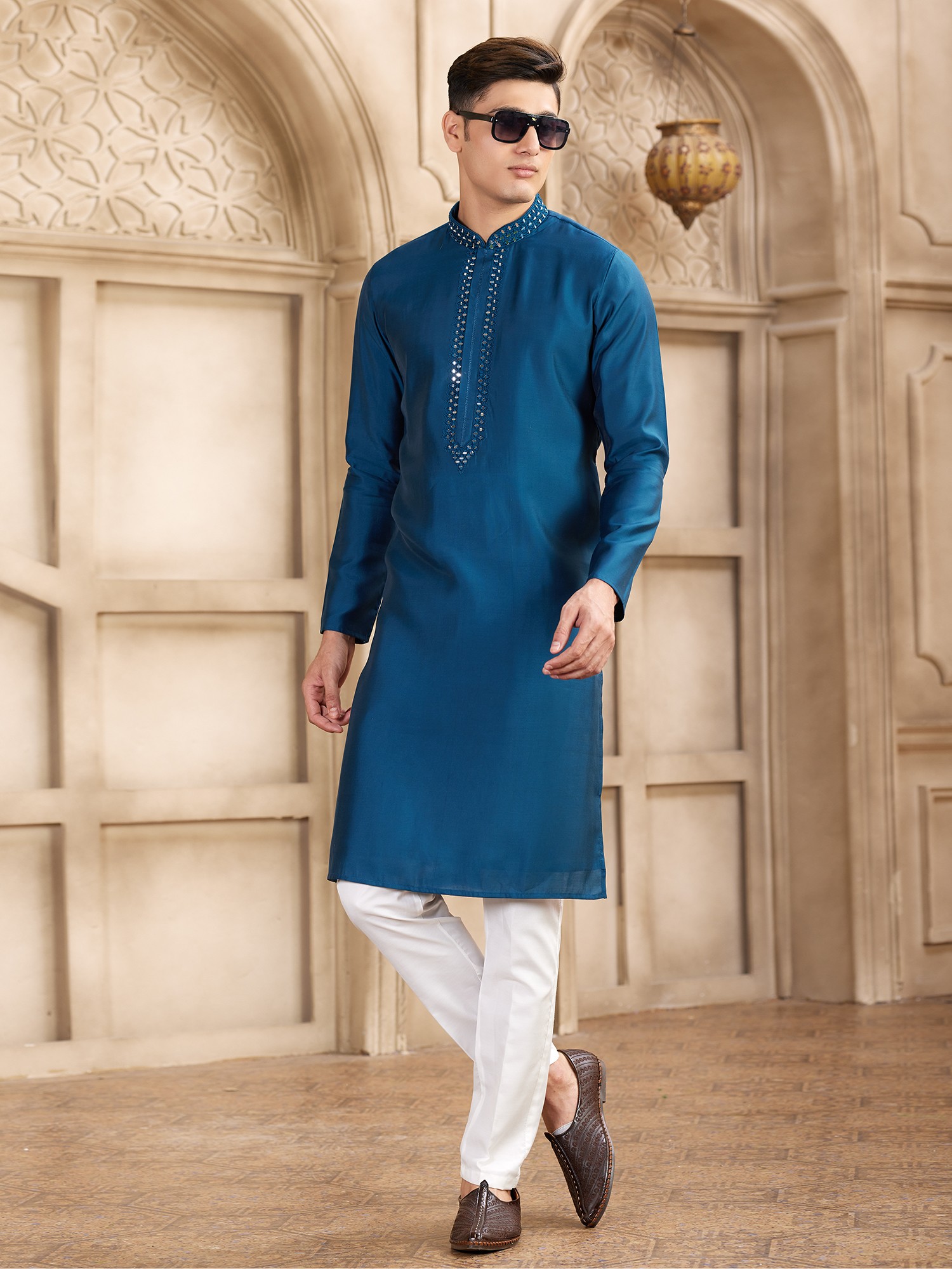 Discover a touch of timeless elegance with this exquisite kurta pajama set, designed to make you stand out at any celebration. Crafted from premium Banarasi art silk, this ensemble offers a luxurious feel and a sophisticated drape that is perfect for festive occasions and party gatherings. The rich, deep teal hue of the kurta is both modern and classic, exuding an aura of refined style.