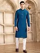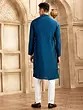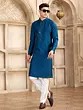 Complementing the striking kurta is a pair of comfortable and stylish white pajama pants. Designed with a half-elastic waistband, these pants offer a relaxed yet secure fit, allowing for all-day comfort without compromising on style. The crisp white of the pajama provides a perfect contrast to the deep teal kurta, creating a balanced and visually appealing ensemble. This combination is ideal for long hours of celebration, ensuring you look and feel your best. Whether it's a wedding, a religious ceremony, or a special party, this kurta pajama set is your go-to choice for sophisticated ethnic wear.