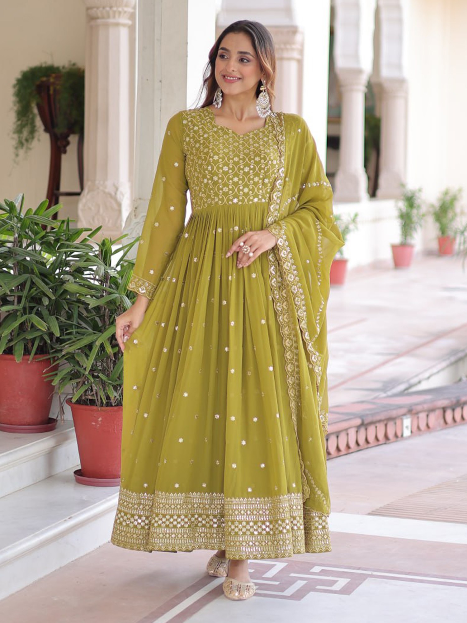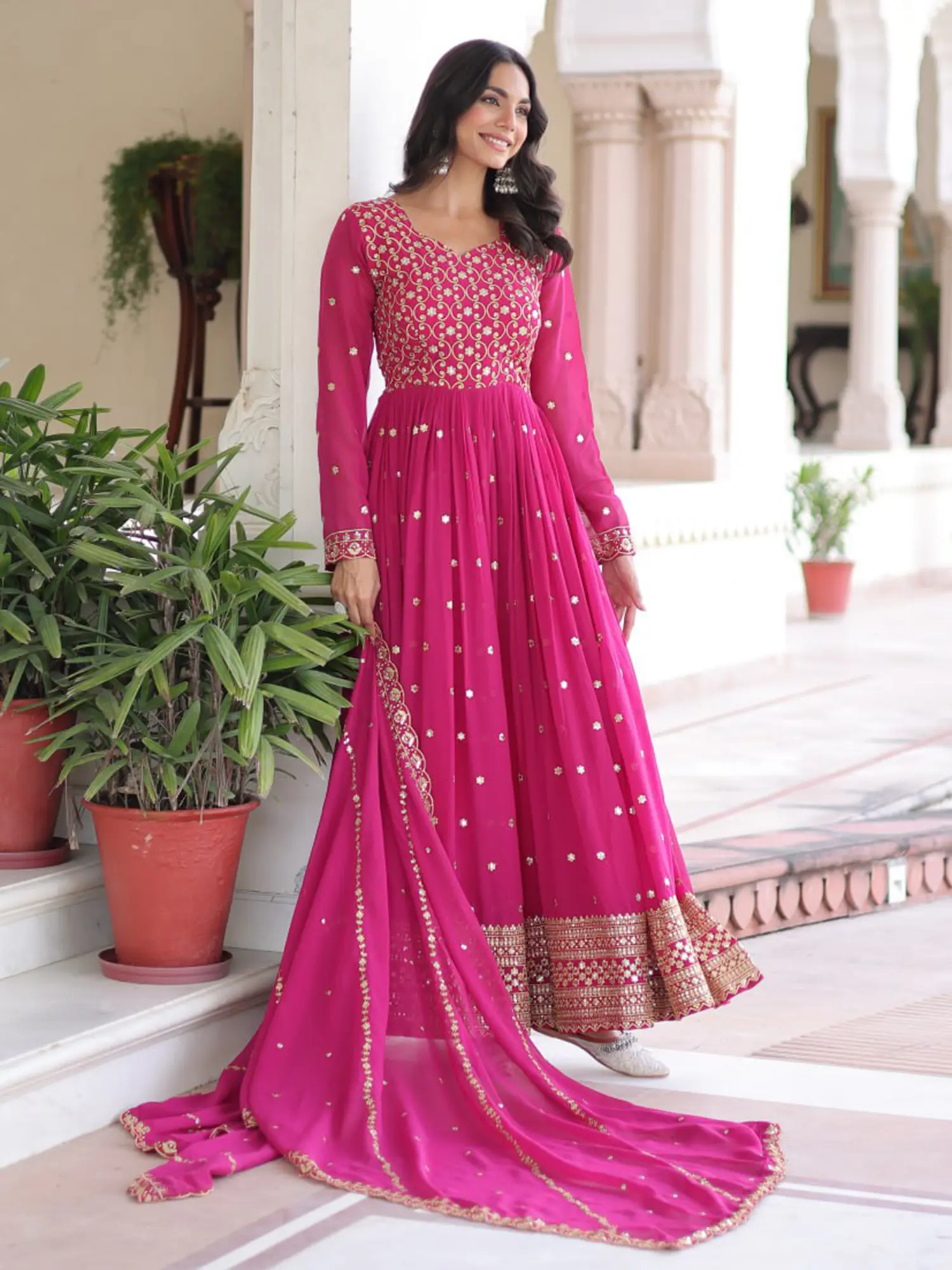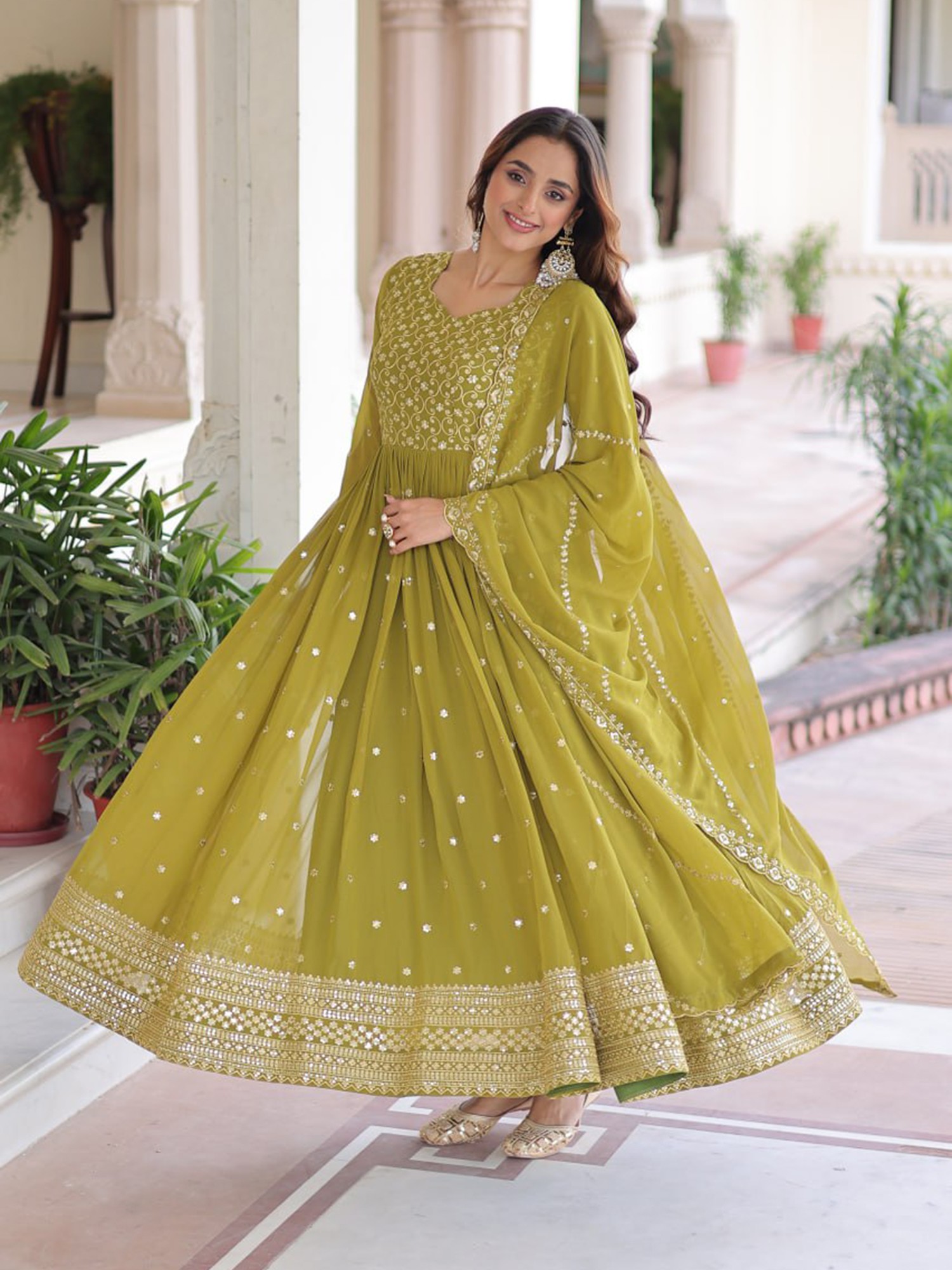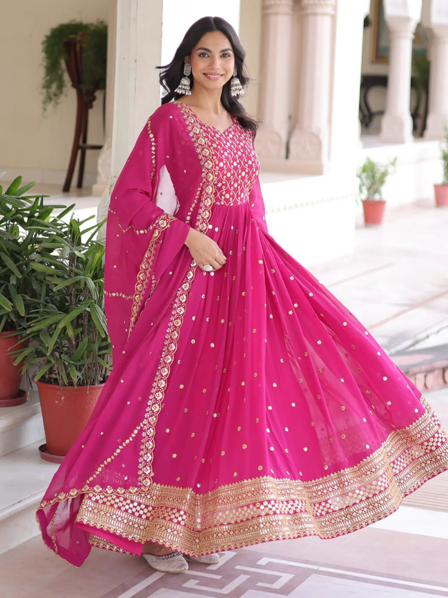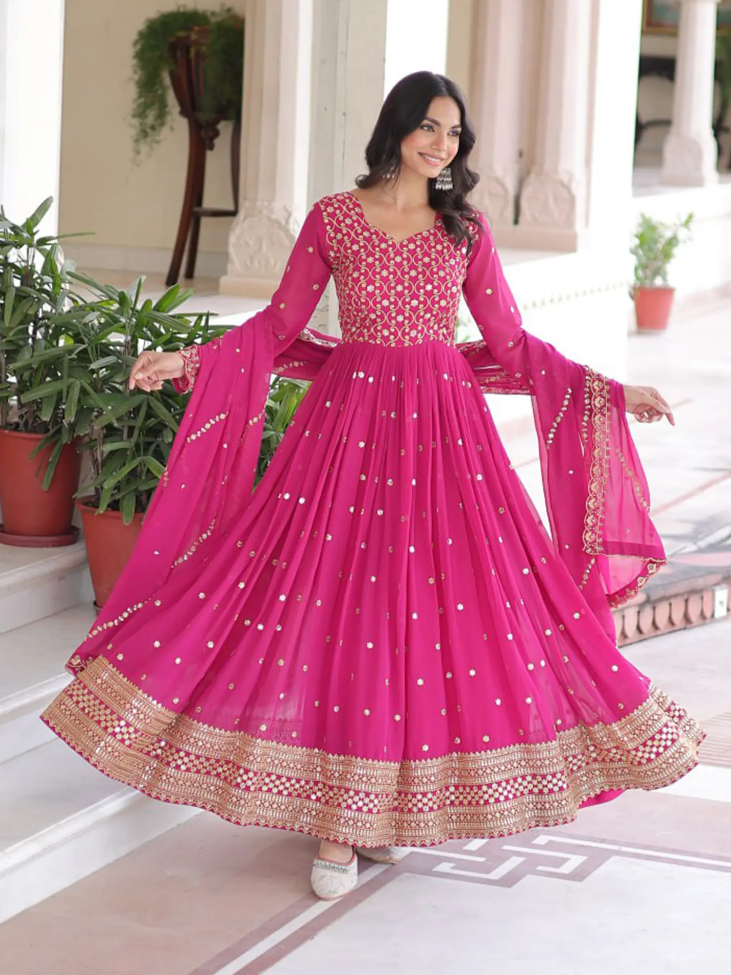Premium Faux Georgette Gown Dupatta Set Highlighted With Heavy Zari And Sequins Embroidery Perfect For Women