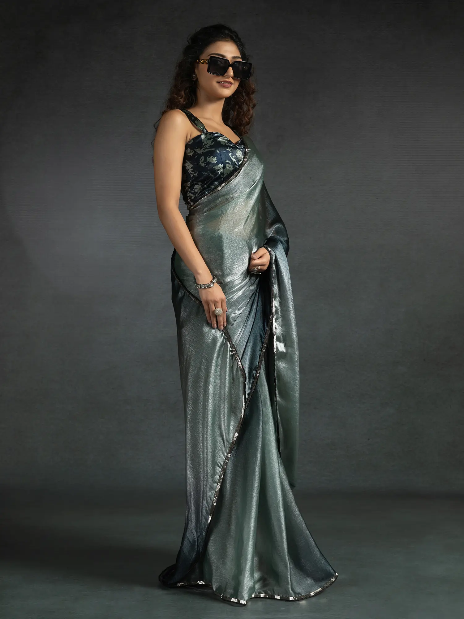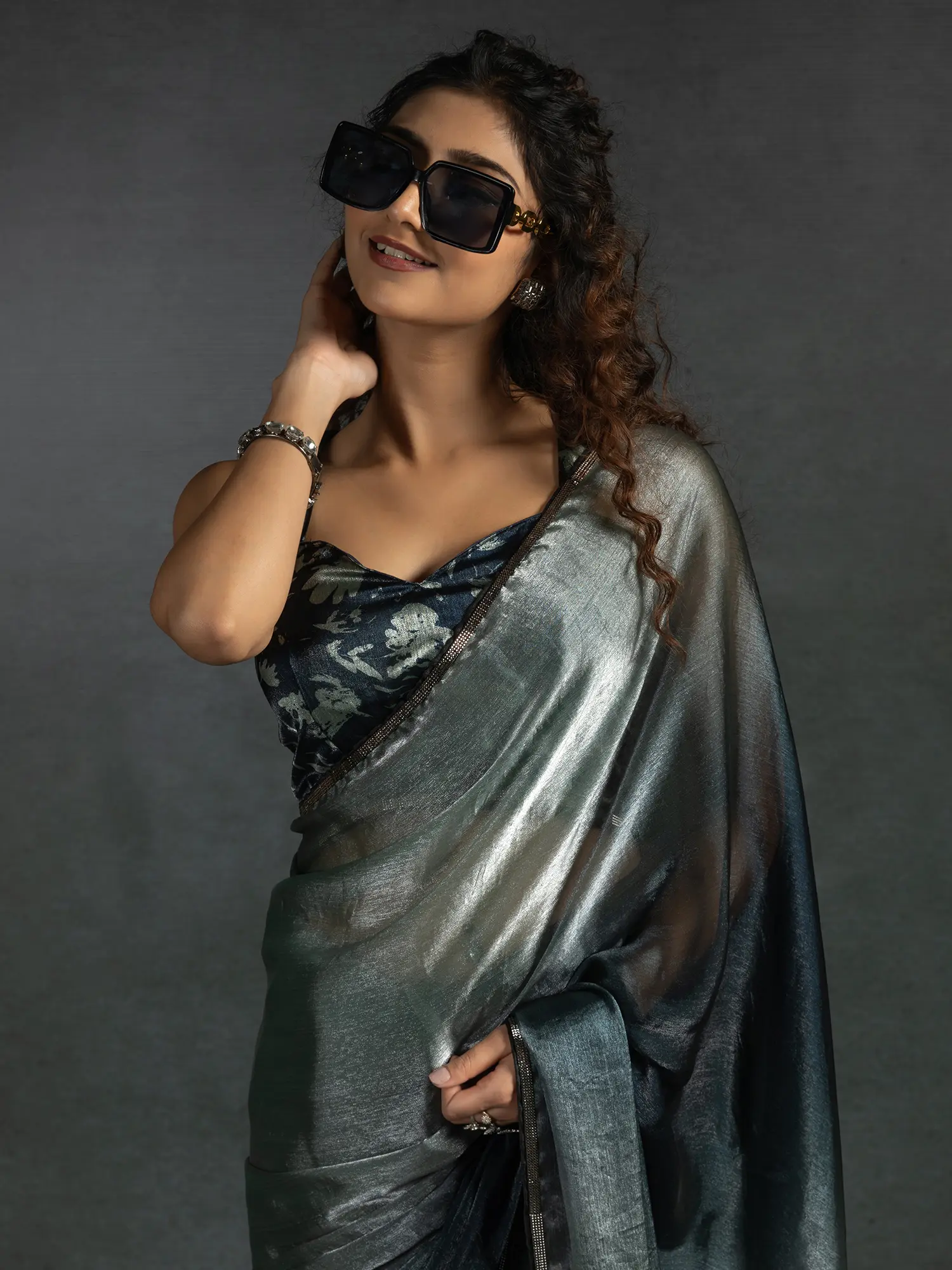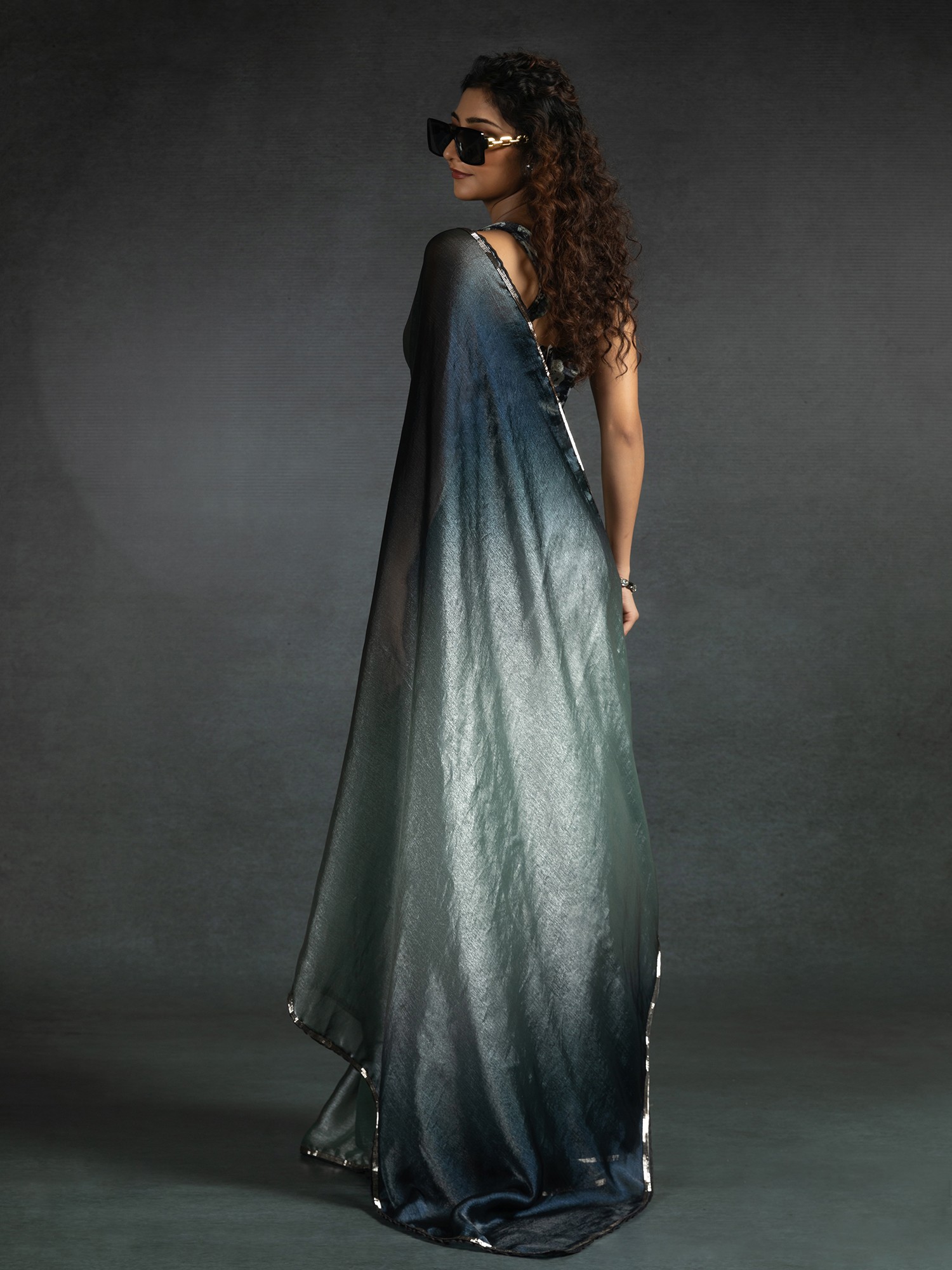 Premium Fendi Satin Silk Two Ton Shaded Saree Adorned With Heavy Hand Work Black Zircon Border Flexible Multiple Hooks