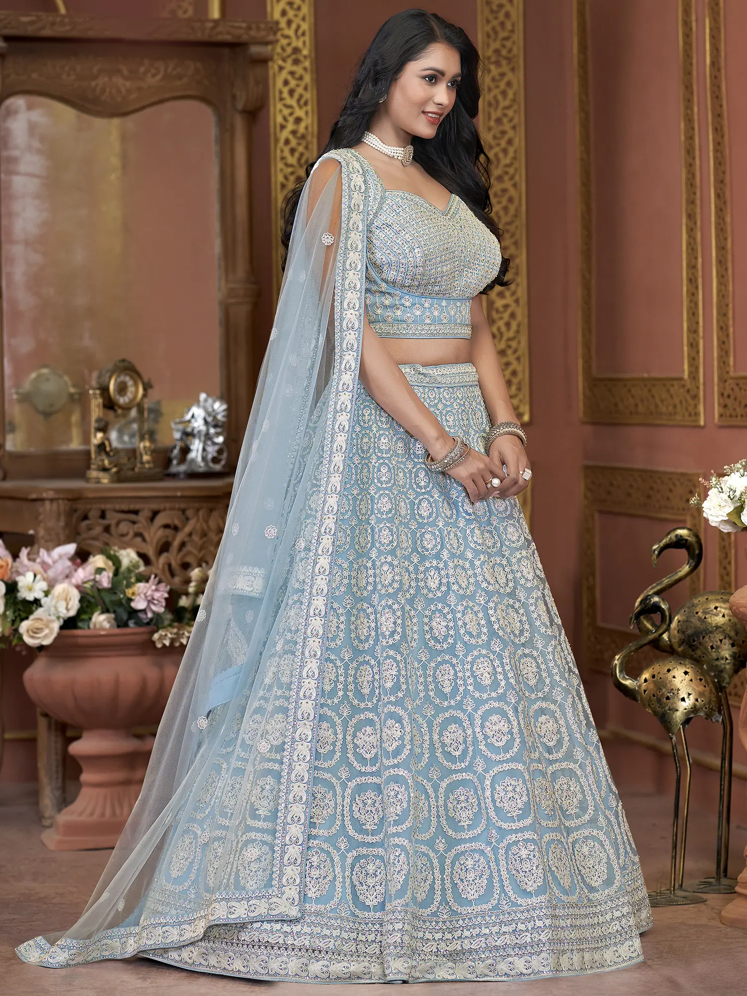 Silk Thread Embroidery And Sequins Zari Work Peacock Motifs Lehenga Choli With Net Dupatta