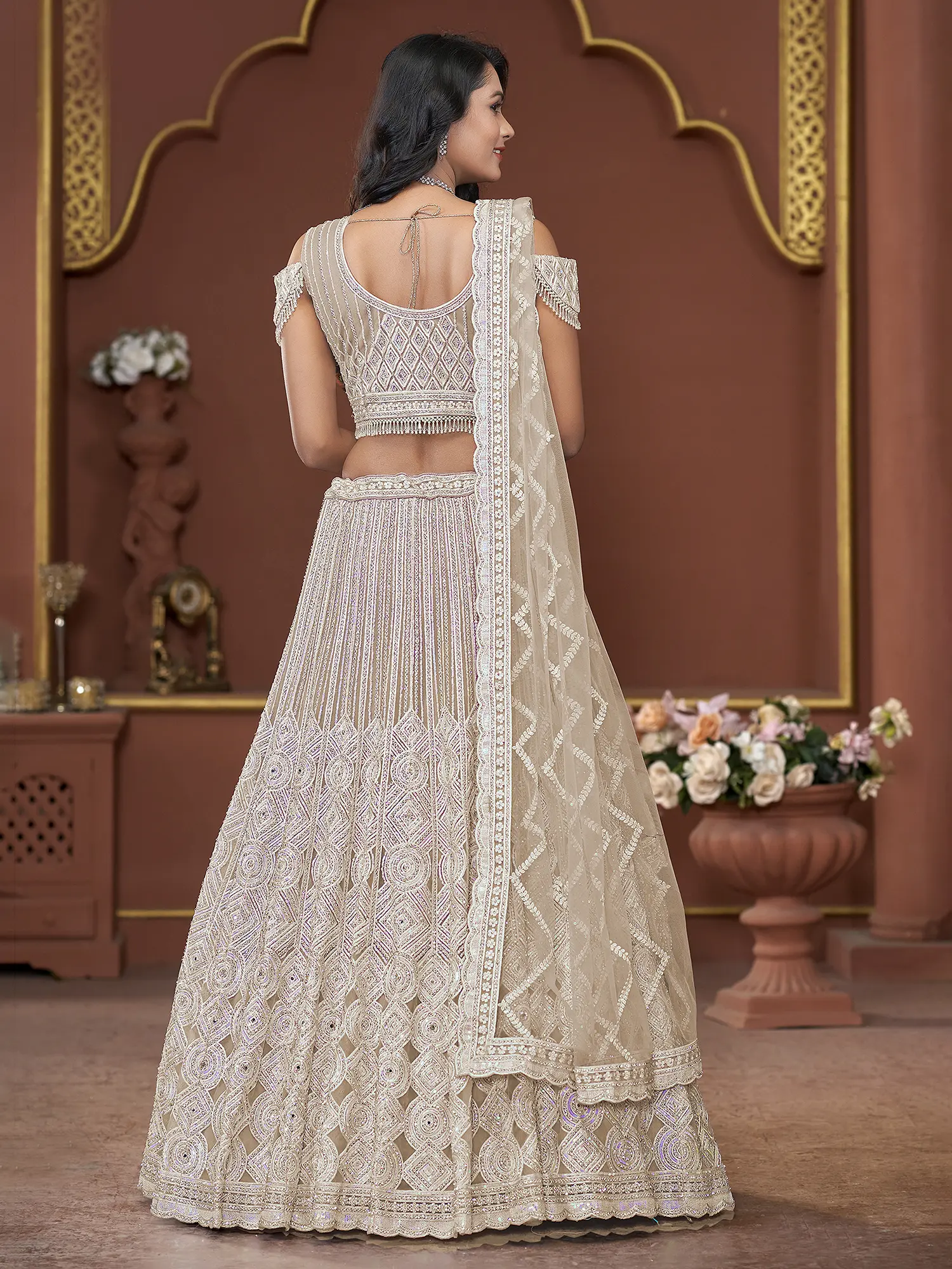 Bottle-Green Net Beads and Golden Thread Embroidery Lehenga Choli with Cutwork Dupatta